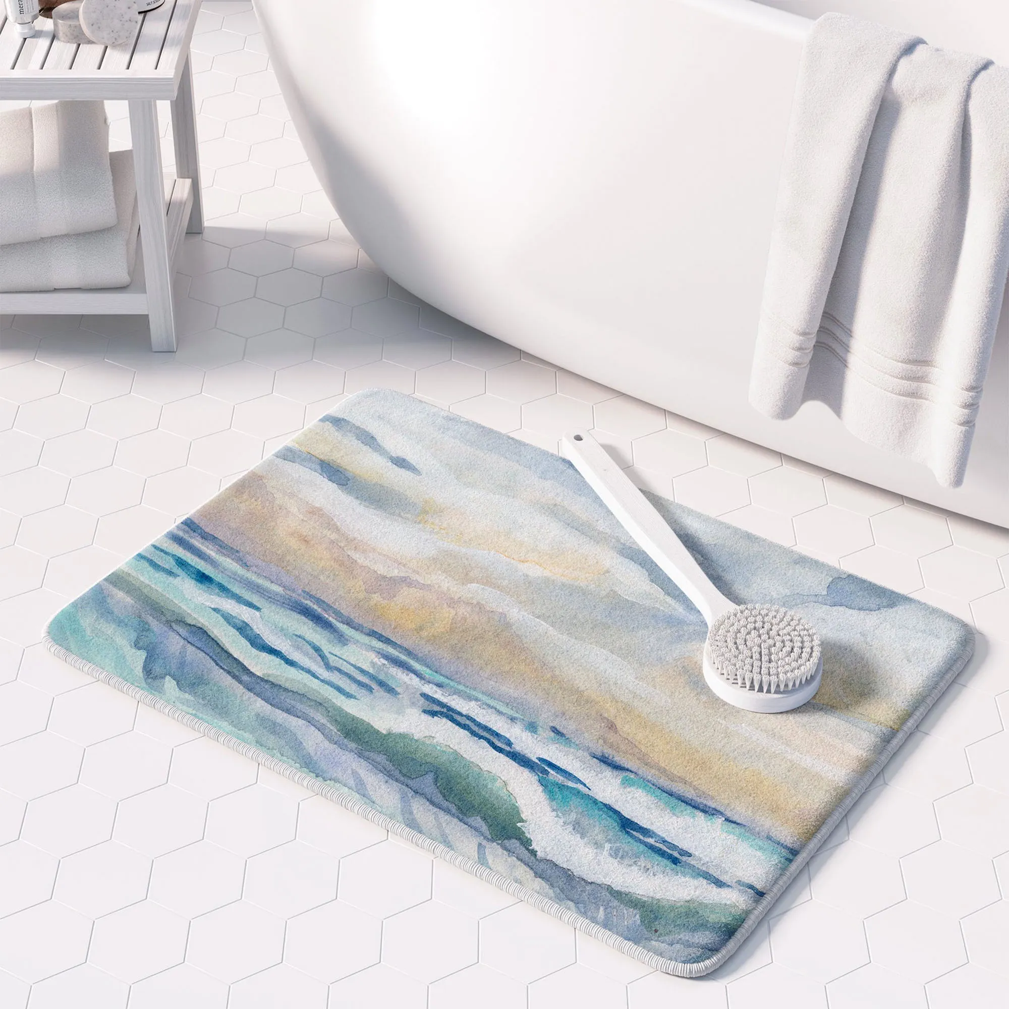 The Windswept Coastal Bath Rug is polyester fabric with a memory foam core and a nonskid backing. Imported/USA.