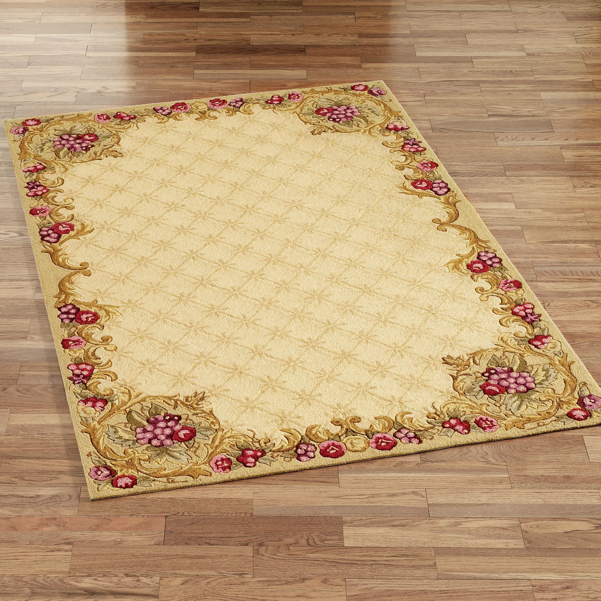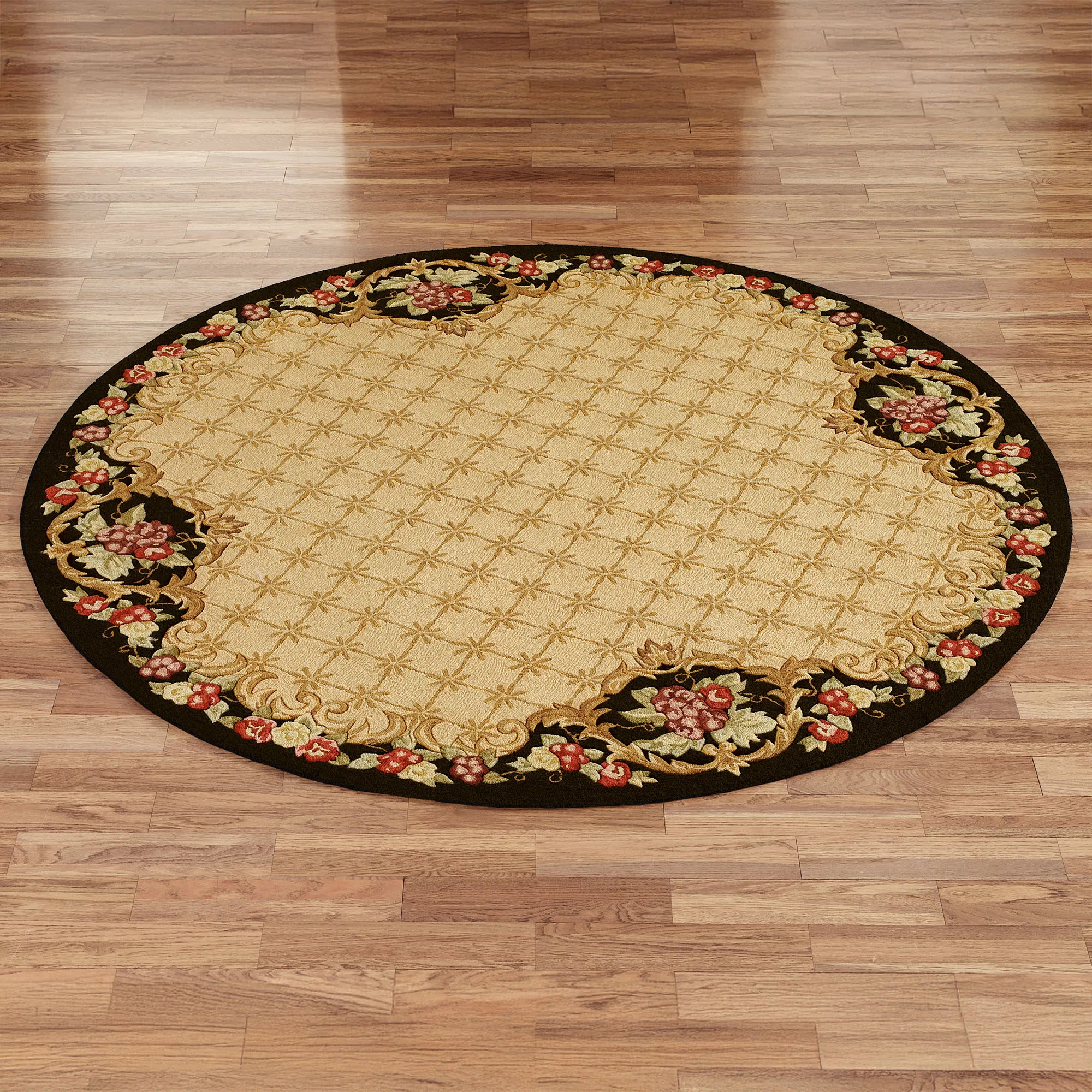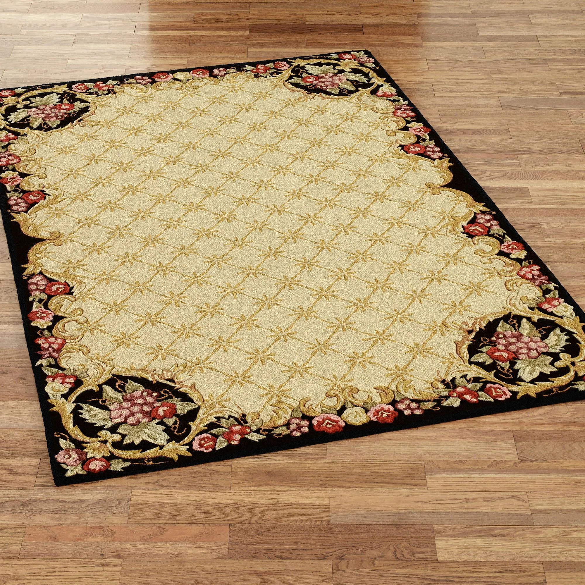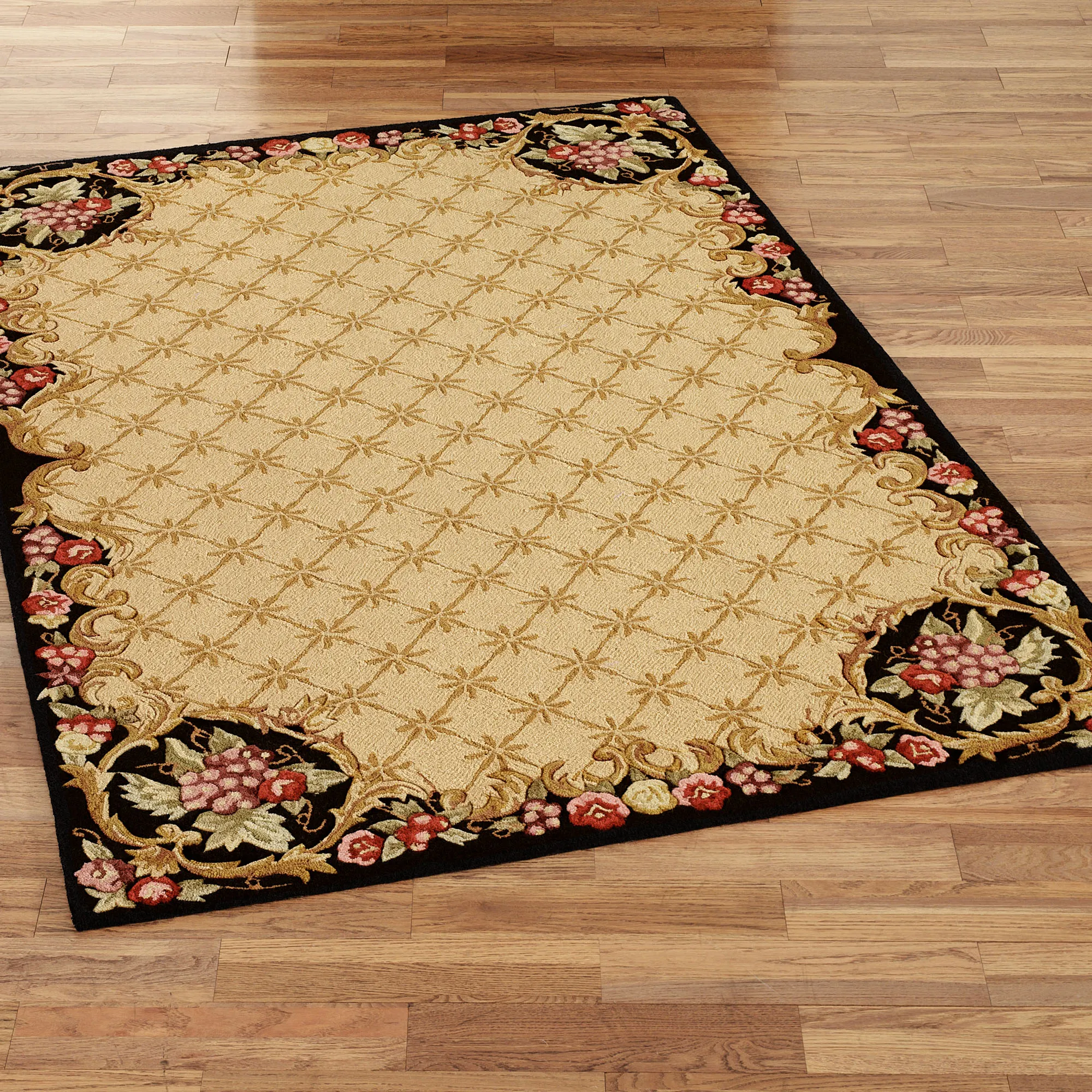 The Wine and Roses Hooked Area Rugs are ideal for those who appreciate the finer things in life. Hand-hooked from polyacrylic, these .375" thick area rugs feature a central, solid color field with a crisscross lattice pattern. Border has designs of grapes, roses, and leaf scroll against a solid color ground. Specify Gold border with light gold field, or Black border with antique gold field. We recommend professional cleaning by a rug cleaner. Imported.