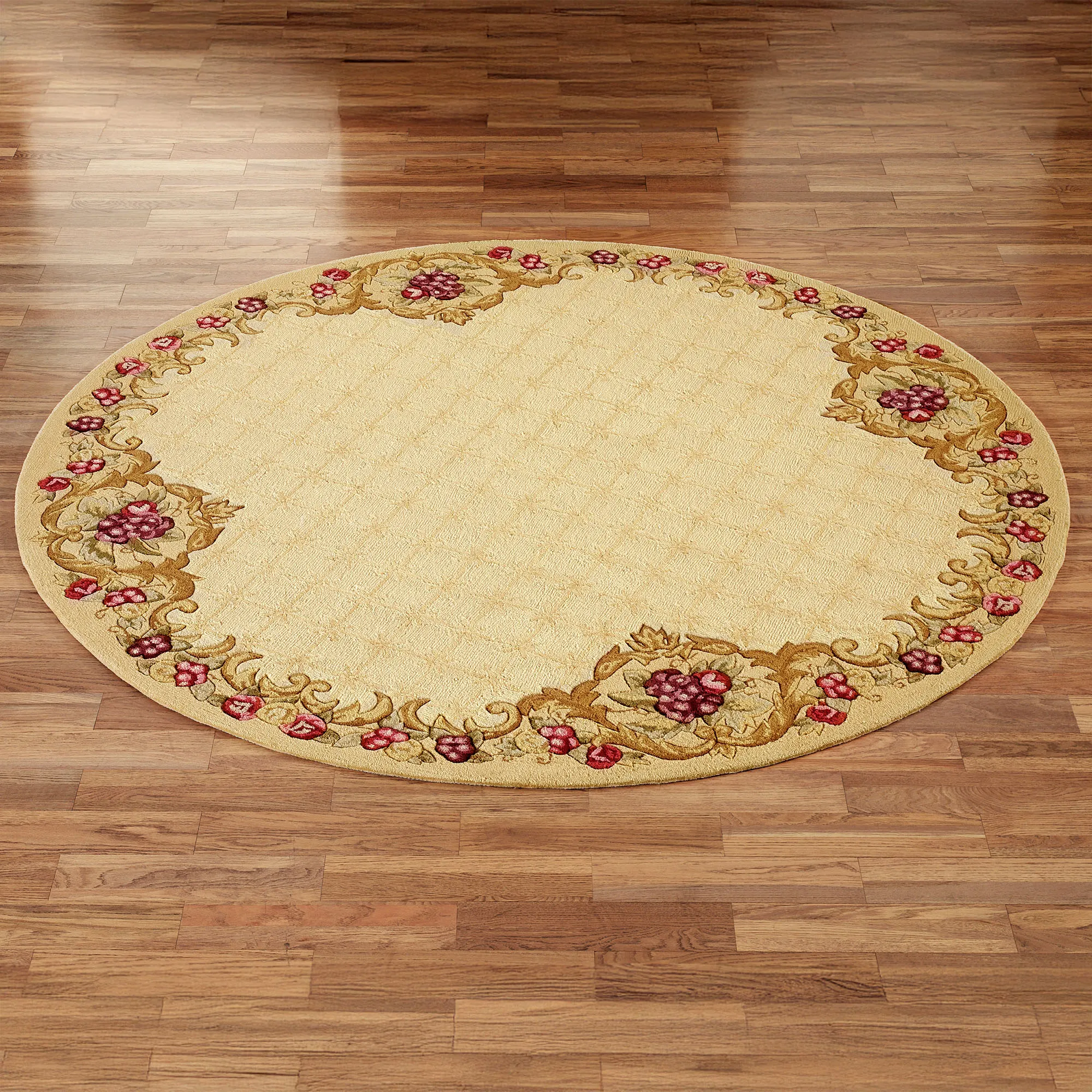 The Wine and Roses Hooked Area Rugs are ideal floor accents for those who appreciate the finer things in life and want to reflect that tastefulness in their decor. The border features designs of grapes, roses, and leaf scroll in colors of purple, rose, burgundy, and green; against a solid color ground. Design may vary by size.