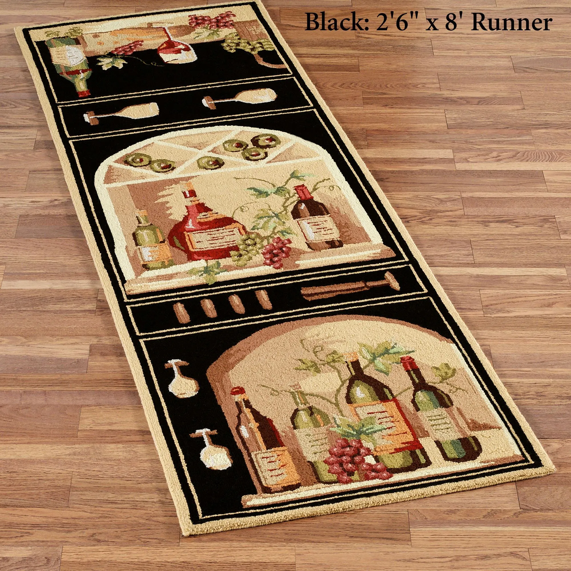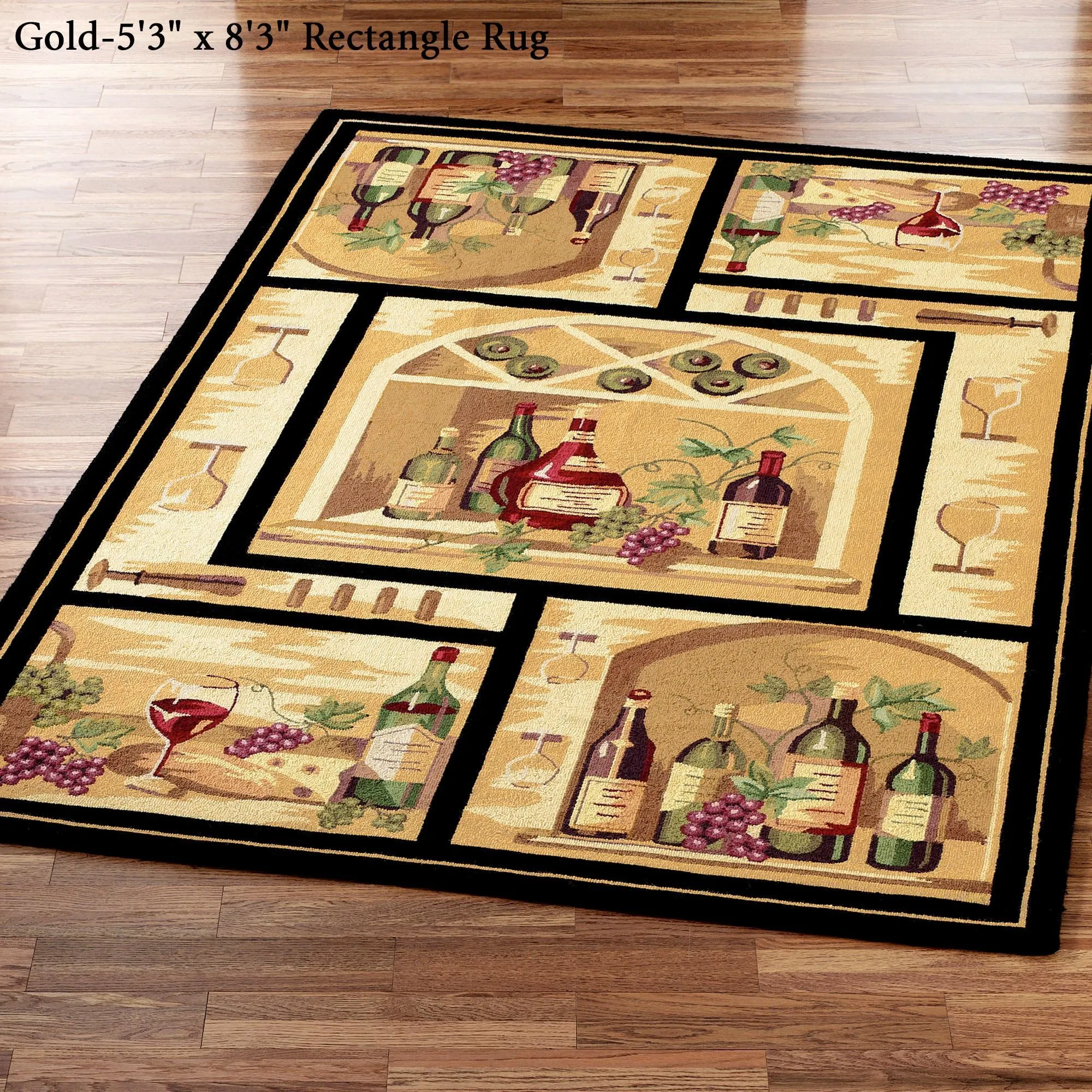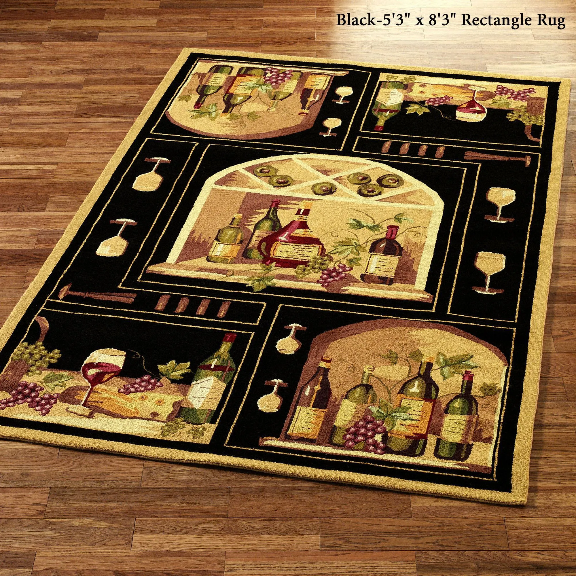 Bold, black borders of the Wine Bottle Area Rug frame large squares filled with finely aged wines, stemware, grapes, and olives. Bottles of the finest vintage await your indulgence. Handcrafted, 3/8" thick floorcoverings are hand-hooked of 100% wool. Design may vary by size; see More Views.