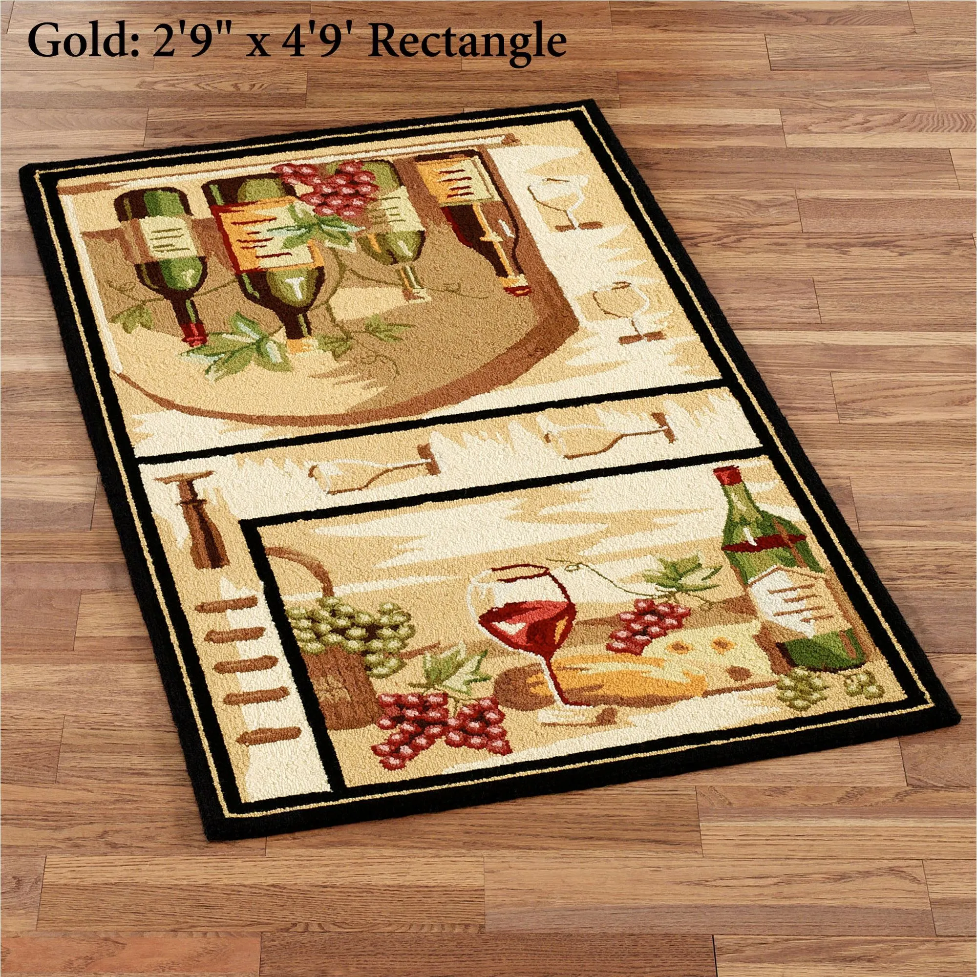The bold borders of the Wine Bottle Area Rug frame large squares filled with finely aged wines, stemware, grapes, and olives. Handcrafted, 3/8" thick floorcoverings are hand-hooked of wool. Design may vary by size; see More Views. We recommend professional cleaning by a rug cleaner. Imported.