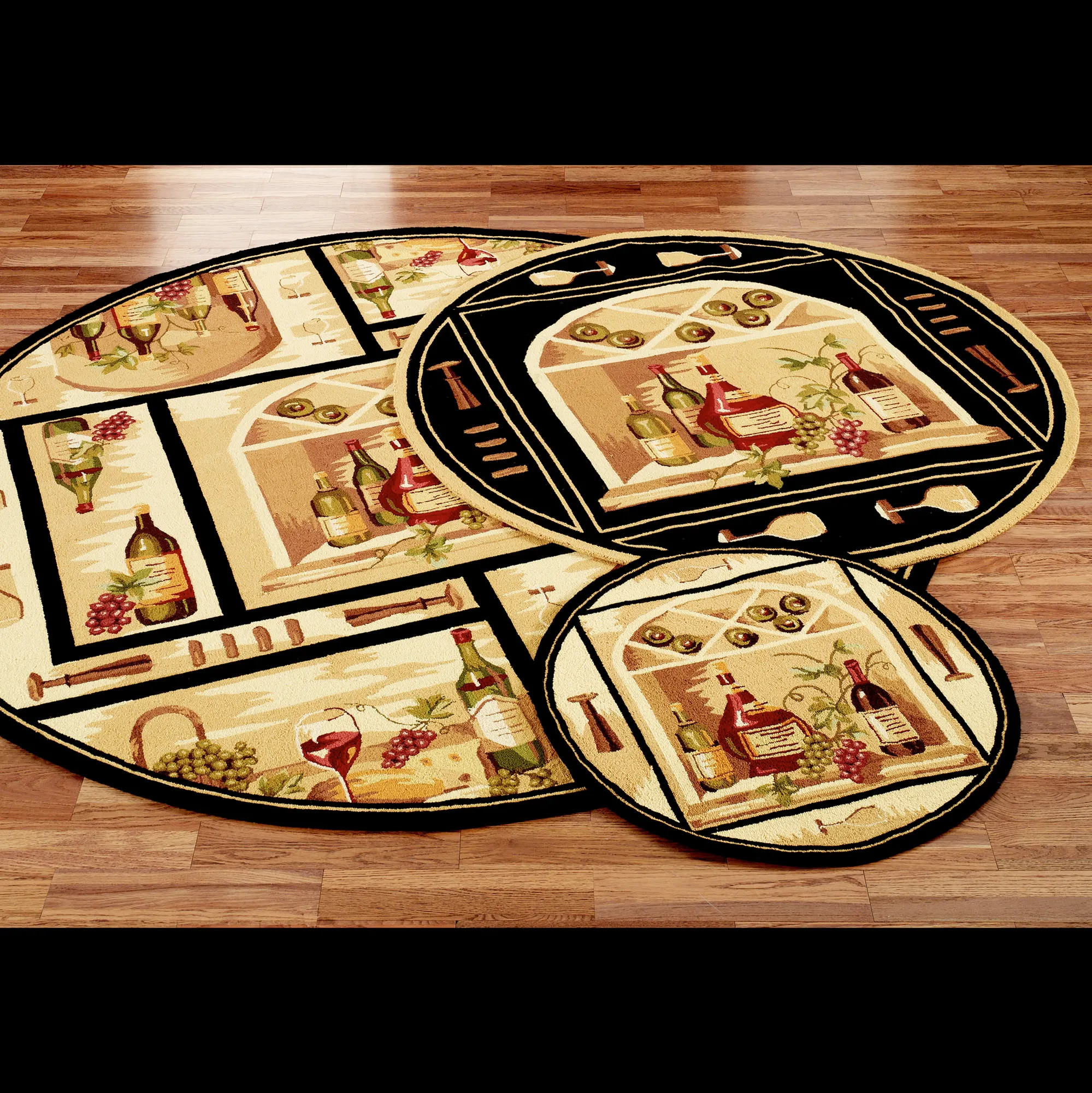 Bold borders of the Wine Bottle Round Rug frame large squares filled with fine wines, stemware, grapes, and olives. Handcrafted, 3/8" thick floor accents are hand-hooked of wool. Design may vary by size; see More Views. We recommend professional cleaning by a rug cleaner. Imported.