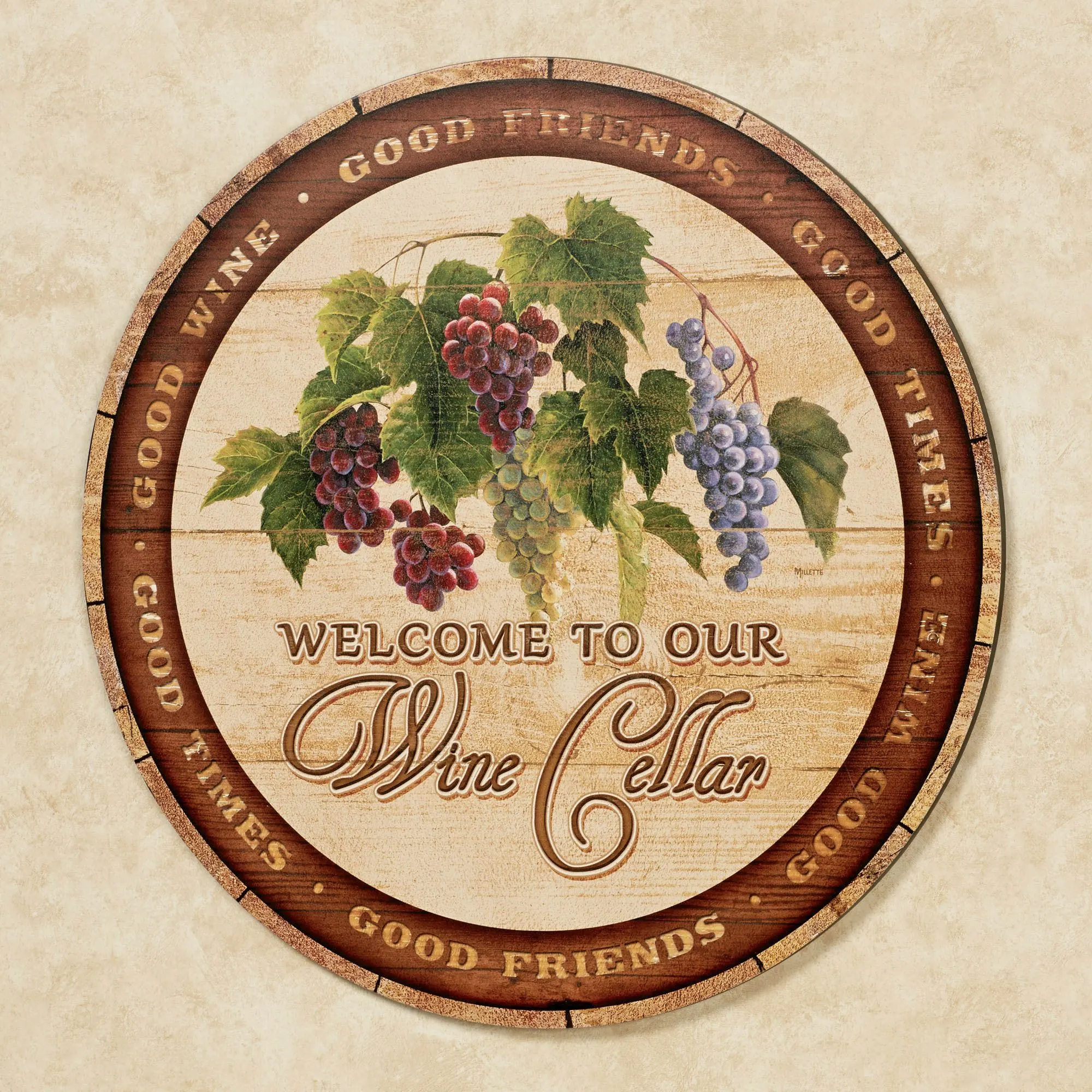 If you love fine wine, you will definitely recognize that the Wine Cellar Wall Art Sign resembles the top of a wine barrel. Wooden wall sign features printed grape bunches and leaves, along with the phrase "Welcome to Our Wine Cellar" in the center, bordered by "Good Friends," "Good Times," and "Good Wine." Measures 21"dia.x.5"D.