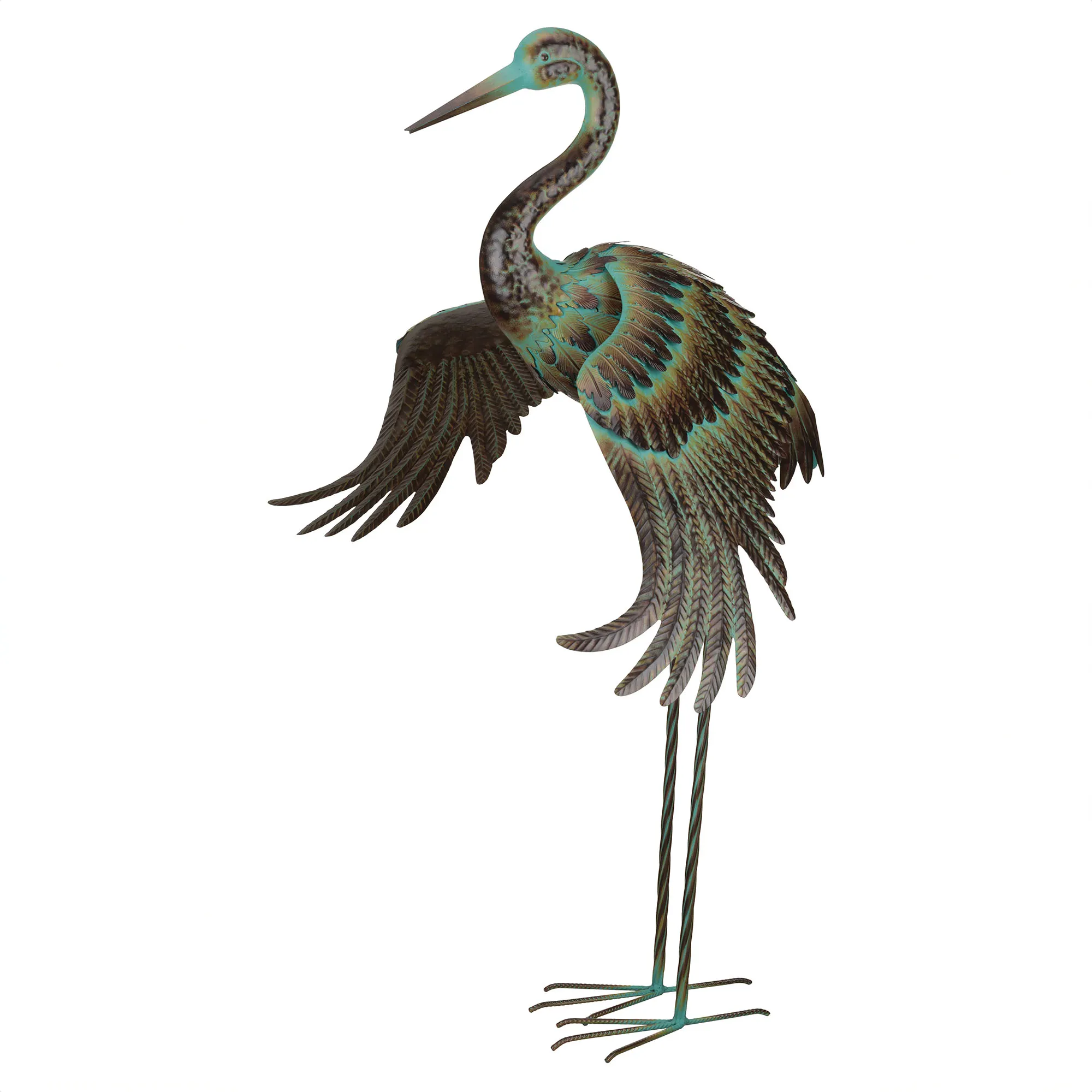 The Wings Down Dance Crane Sculpture looks onward. This metal sculpture depicts a life-size crane bird with a weather- and fade-resistant bronze finish with a green patina and intricate feather and wing detail. The sculpture can stand alone or be secured in the ground with the included "U" stake. Indoor or outdoor year-round use. Measures 34"Wx21"Dx42"H.