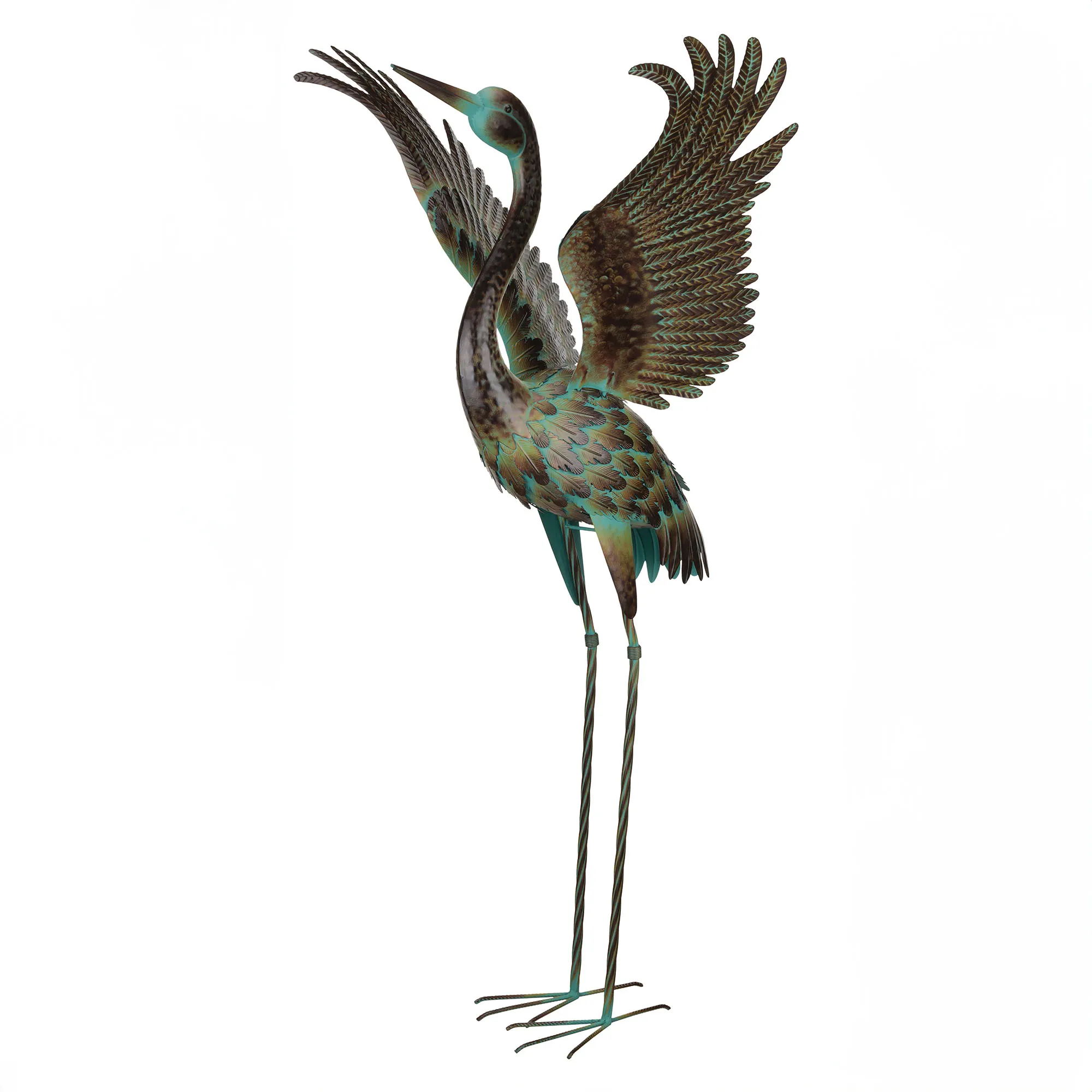 The Wings Up Dance Crane Sculpture commands attention in your indoor or outdoor space year round. Finished in weather- and fade-resistant bronze with a green patina, the life-size metal sculpture features a dimensional, detailed design with beautiful layered feathers and lovely wings. The sculpture can stand alone or be secured in the ground with the included "U" stake. Overall, the crane sculpture measures 28.5"Wx19.5"Dx47.5"H.