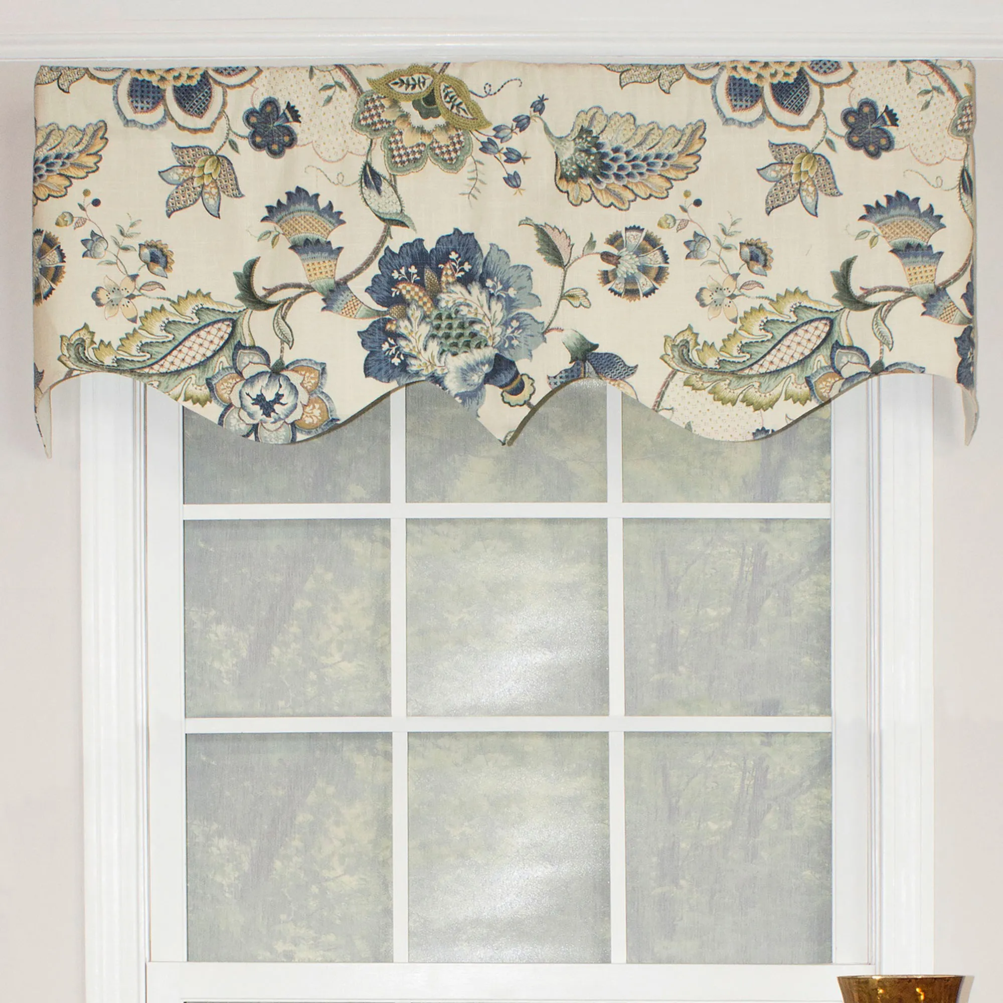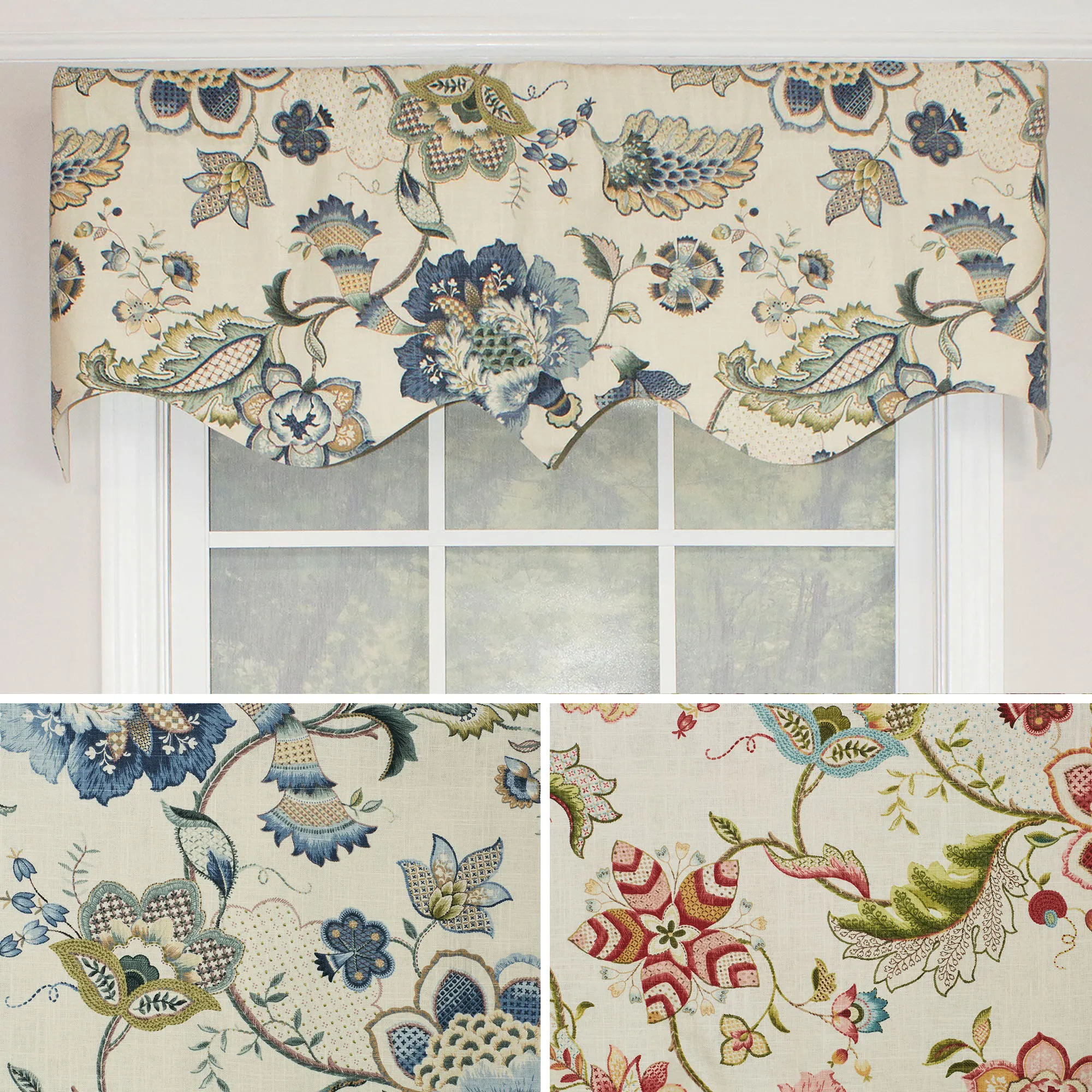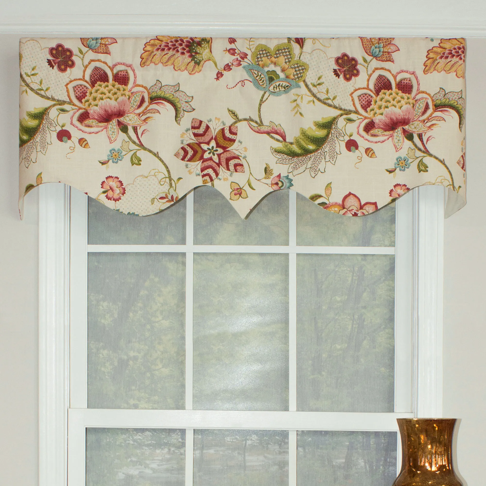 • Regal valance has a swirling Jacobean floral design