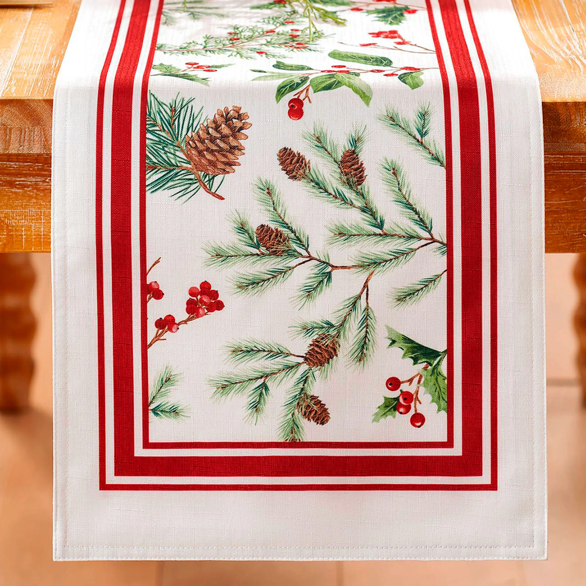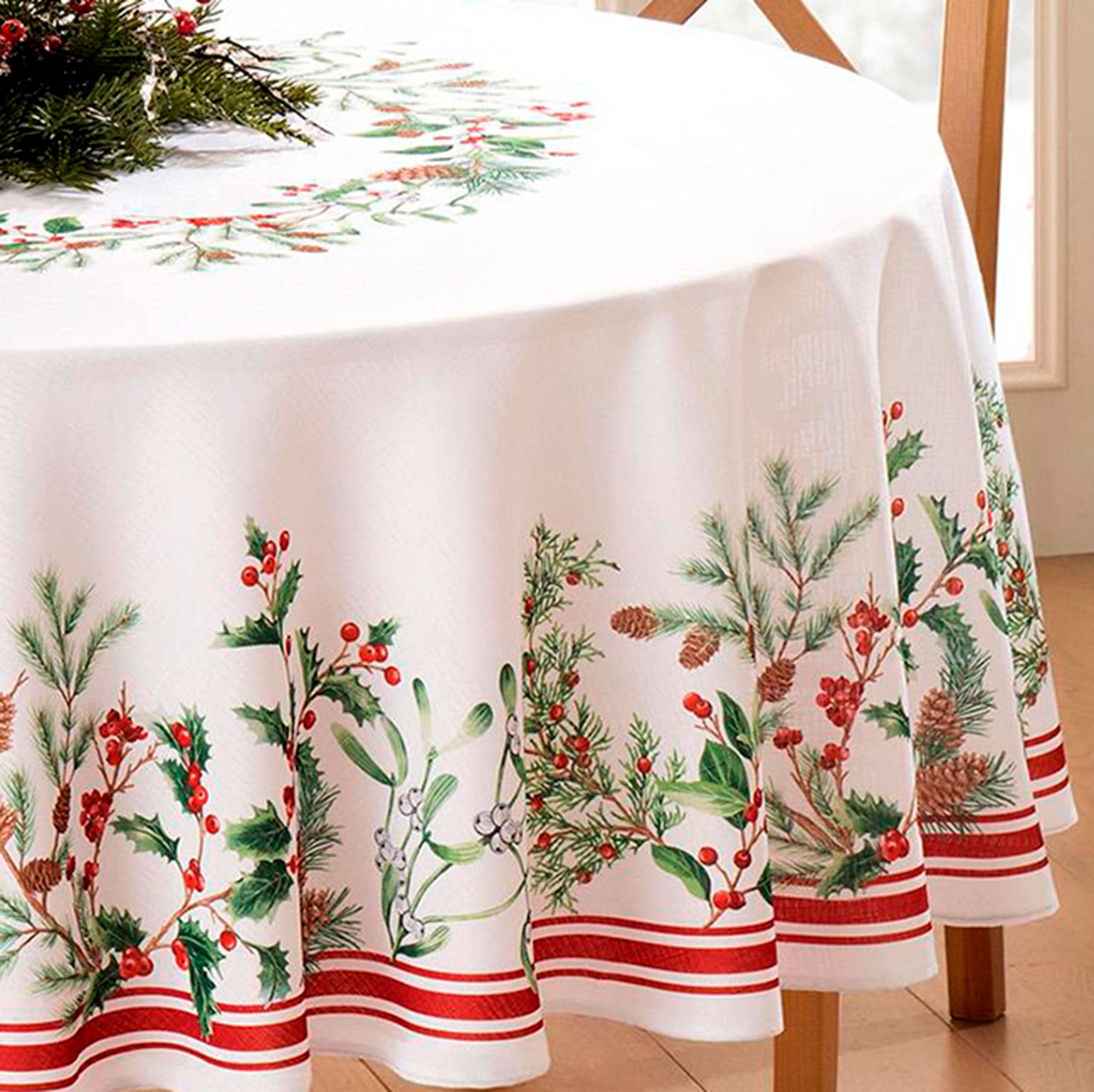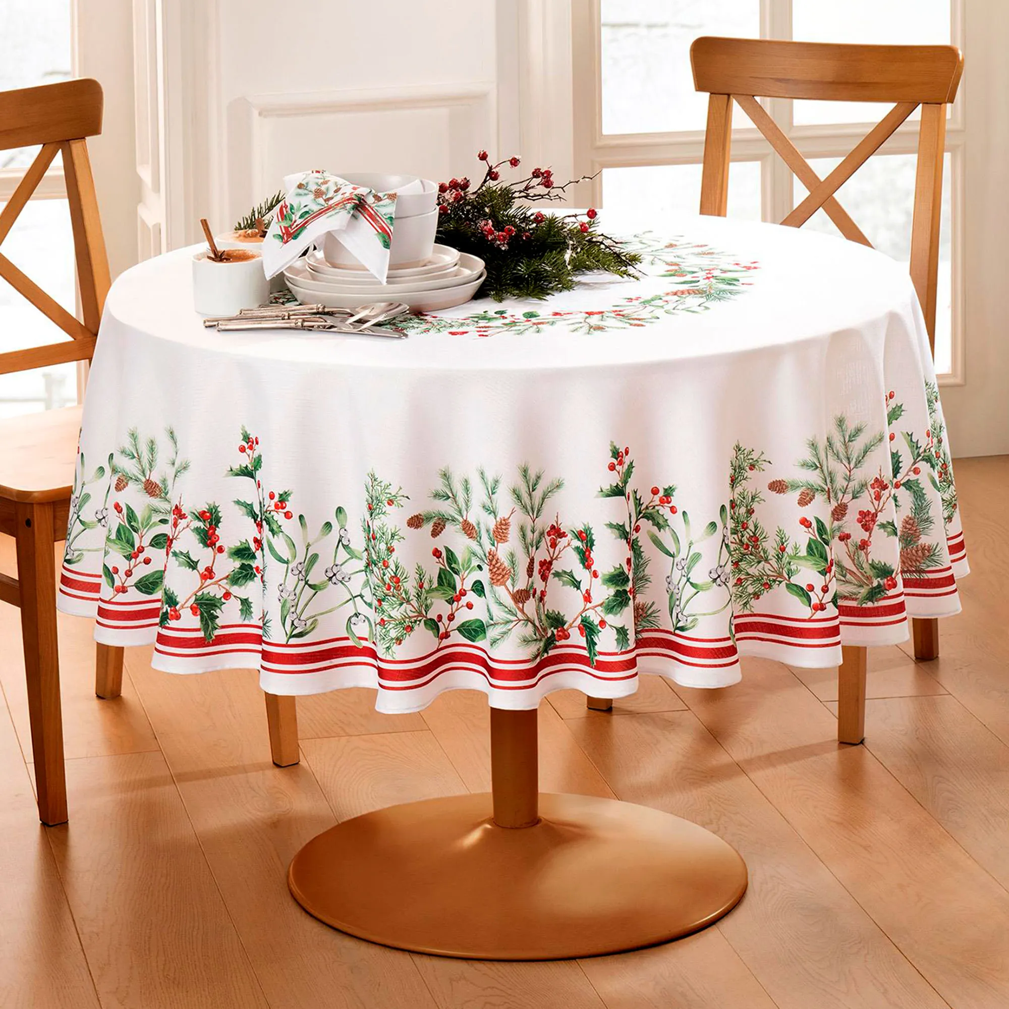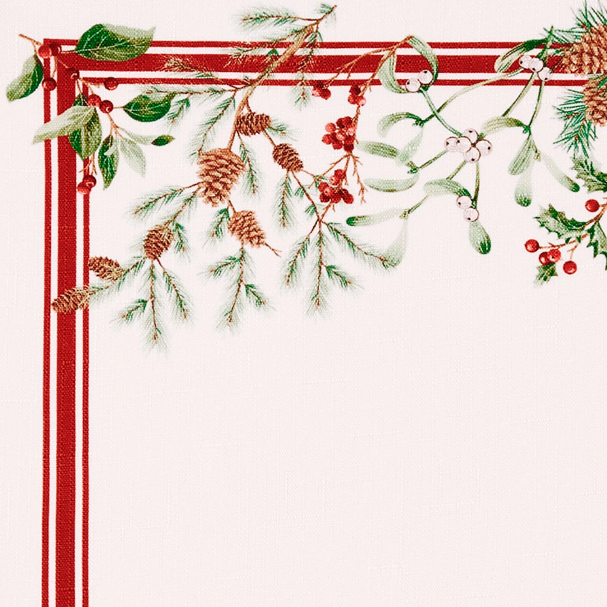 The Winter Berry Table Accessories set your holiday table with a classic festive air. These tailored off-white polyester table linens feature pine boughs, pine cones, mistletoe, greenery, and winter berries. Red borders add a defining element. Tablecloths also have center greenery designs. Choose Table Runner, Rectangle Tablecloth, Round Tablecloth, Oval Tablecloth, Placemat Set of 4, or Napkin Set of 4. Machine washable. Imported.