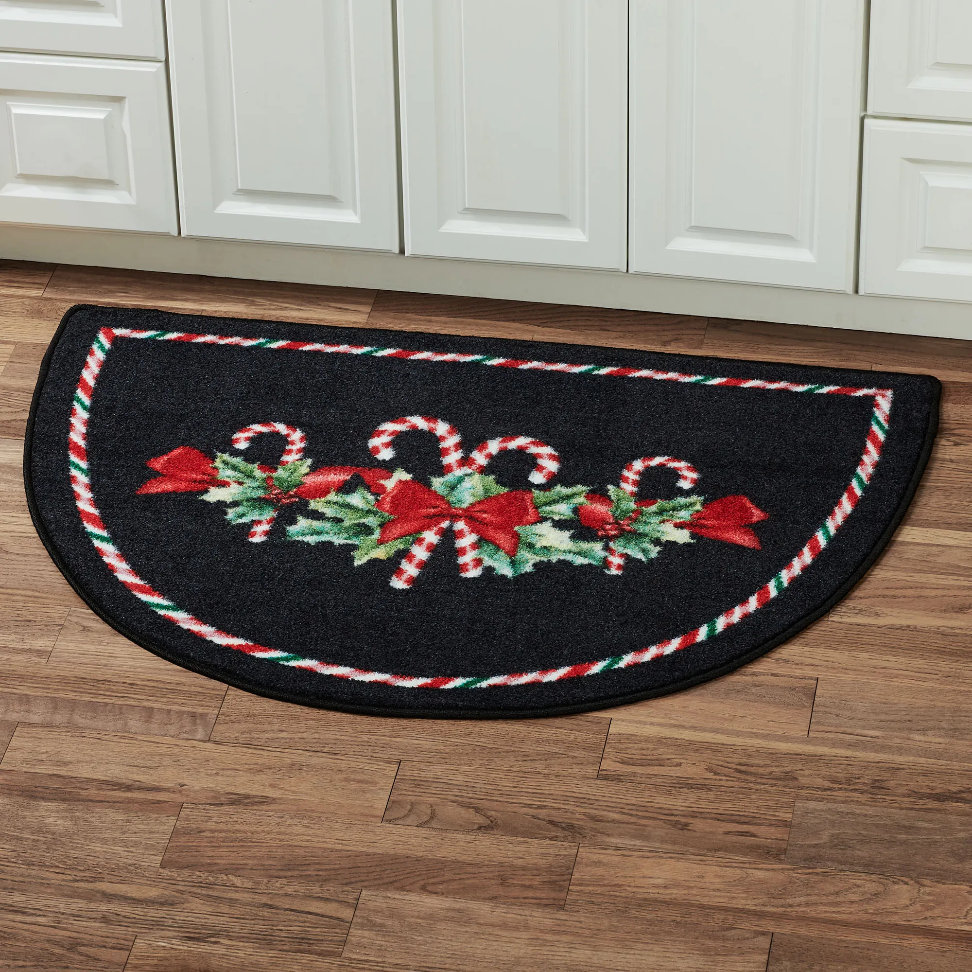 Give your guests a sweet season's greeting with the Winter Candy Holiday Slice Rug. Proudly made in the USA, the .375" thick, power-loomed nylon slice mat features printed candy canes tied with red ribbon bow motifs, green holly leaves, and red berries on a black ground. A red, green, and white candy cane stripe frame completes the classic design. The shaped holiday slice rug measures 46"x32" (3'10"x2'8"). We recommend professional cleaning by a rug cleaner.