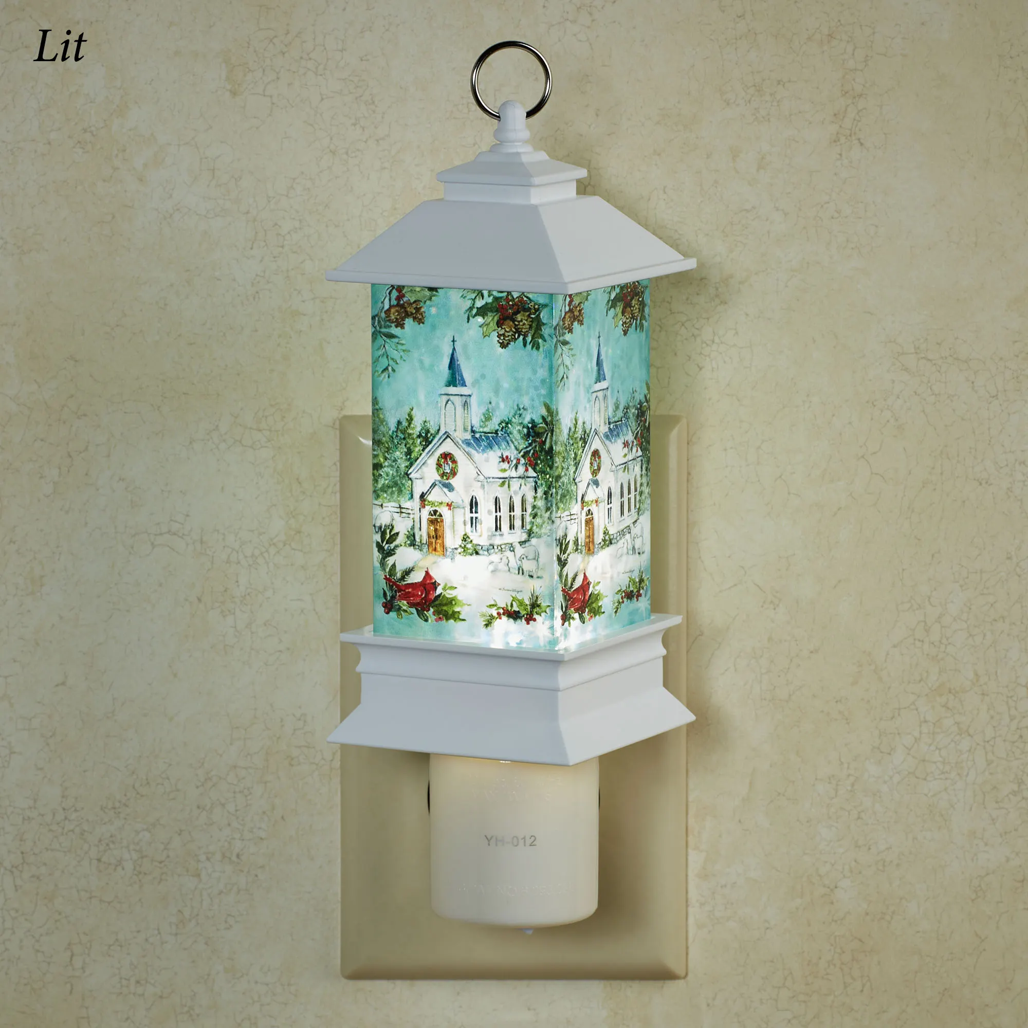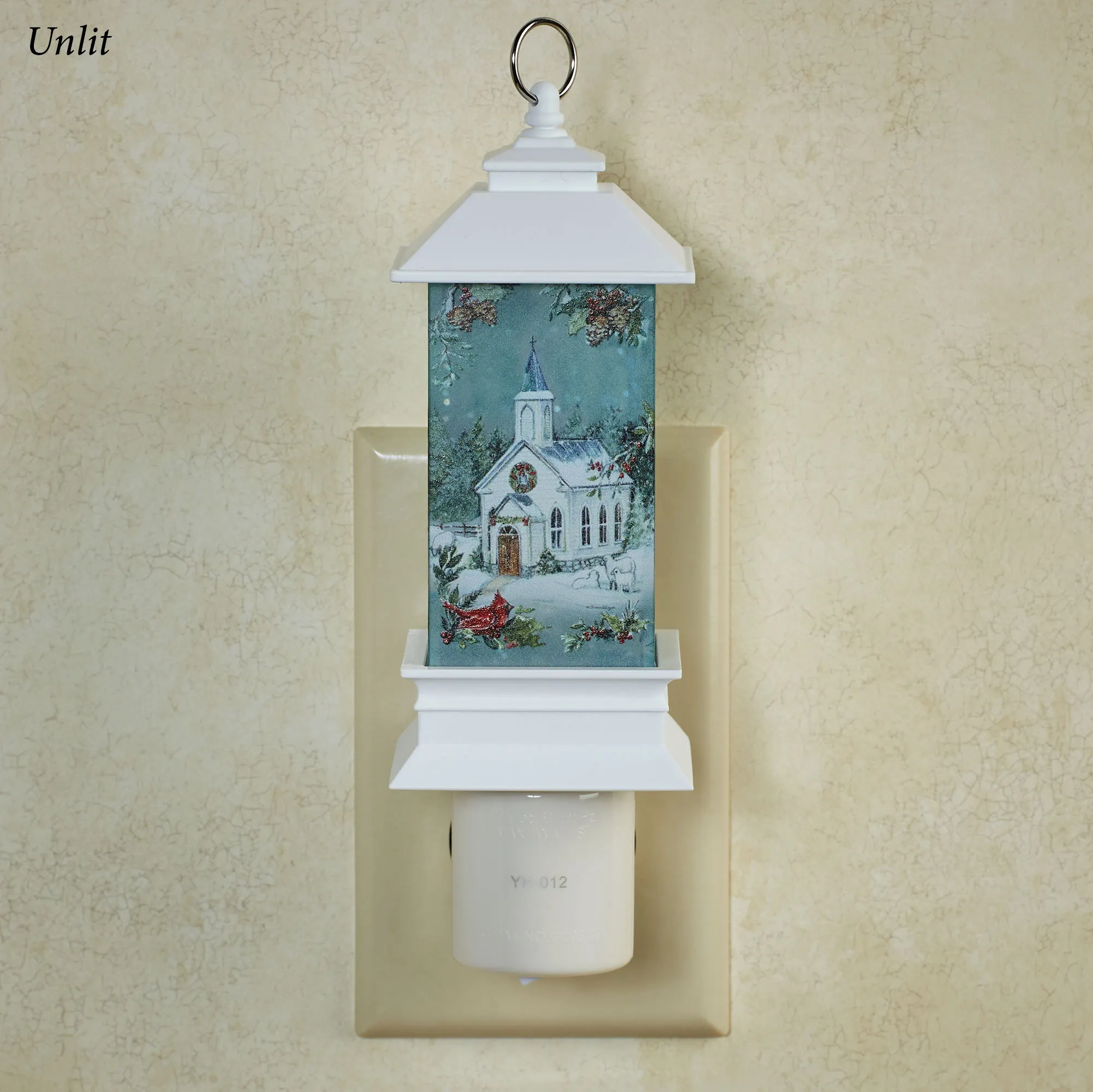 The Winter Church Shimmer Nightlight shines with picturesque holiday charm from all four sides. With artwork originally by (C)Susan Winget, glimpse a picture-perfect white country church decorated for the holidays through the pine boughs, green holly, and red berries. A cardinal sits in one corner. The acrylic and molded plastic nightlight design resembles a white lantern with a liquid-filled center that shimmers with floating glitter and built-in LED light. UL listed. The nightlight operates from an on/off switch on the bottom of the swivel base, which also has a rotating plug. Overall, the nightlight measures 2"Wx2.5"Dx7"H.