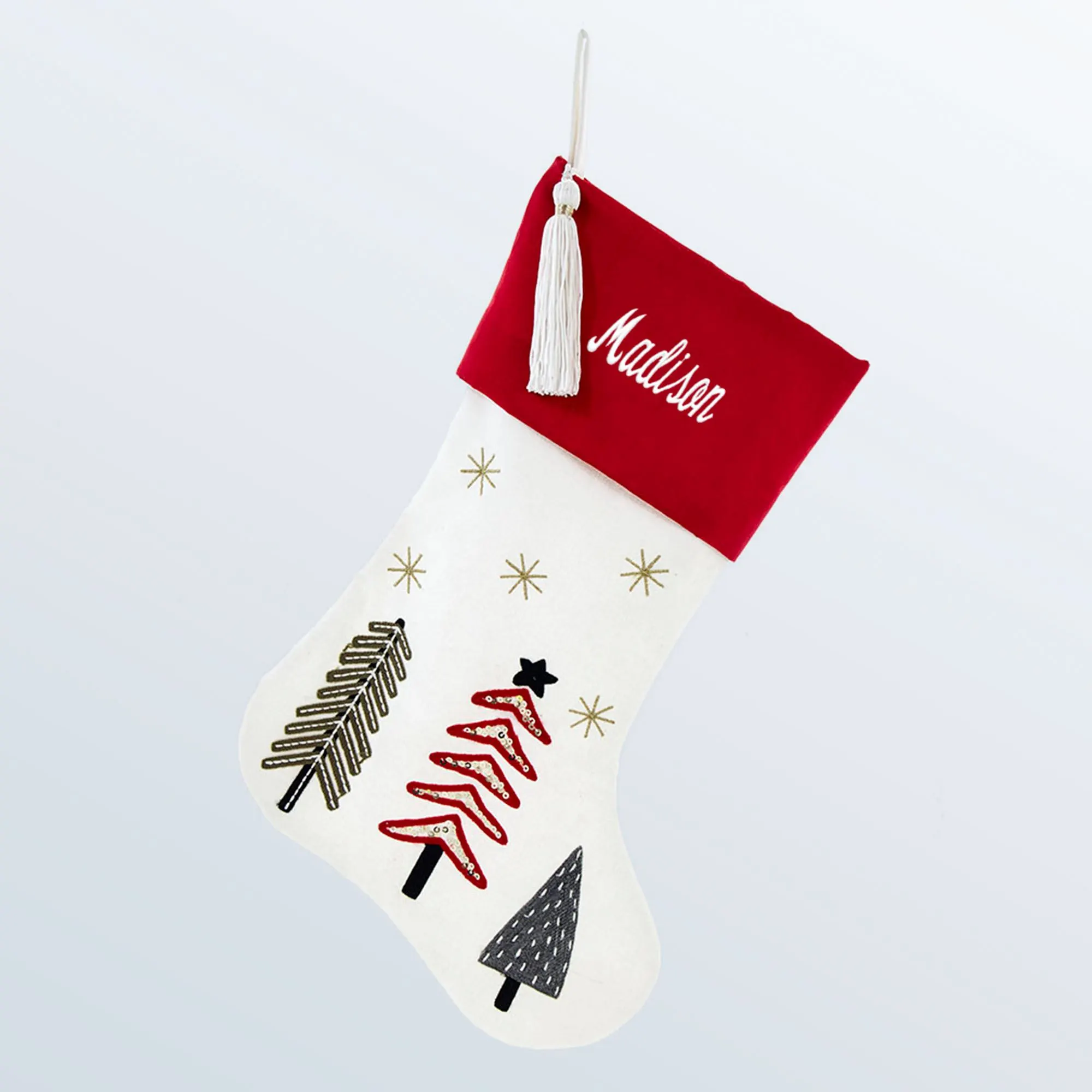 Decorate for a Winter Holiday with this adorable stocking. Made of polyester, this white stocking, by Kurt S. Adler, features shaped embroidered trees and stars, a red cuff, and a white tassel attached to the hanging loop. Personalization is available, as shown, for FREE! Click on the burgundy "i" icon below the item name for more information. Winter stocking measures 7.5"Wx17.5"L. Spot clean. Imported.