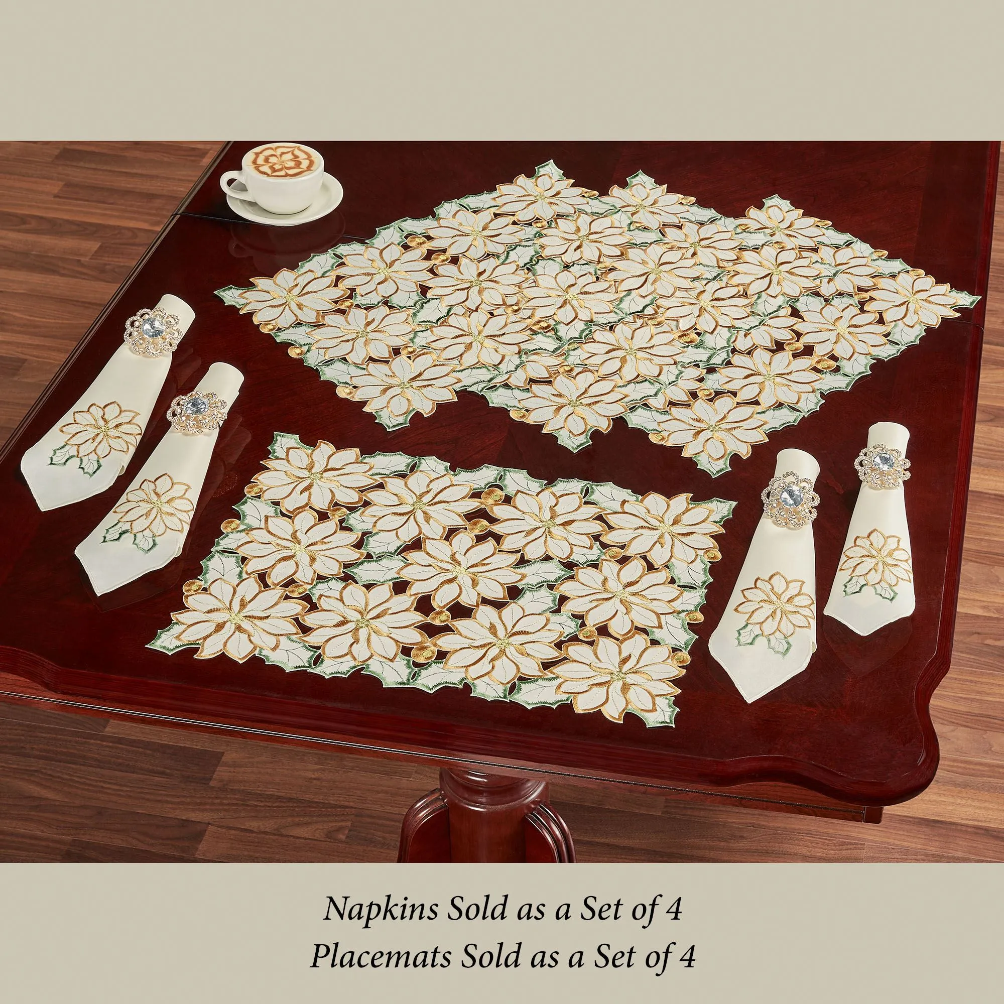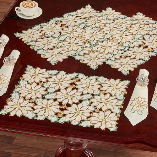 Enjoy the beauty of the Winter Poinsettia Table Accessories this holiday season. Finely cut by hand, the polyester satin accents have ivory cutwork florals detailed with green and gold embroidery; napkins do not have cutwork. Measurements are approximate. Specify Placemat Set of 4, Napkin Set of 4, or Table Runner. Placemats are 20"x14". Napkins are 17" sq. Table Runner is 16"W. Machine washable. Imported.