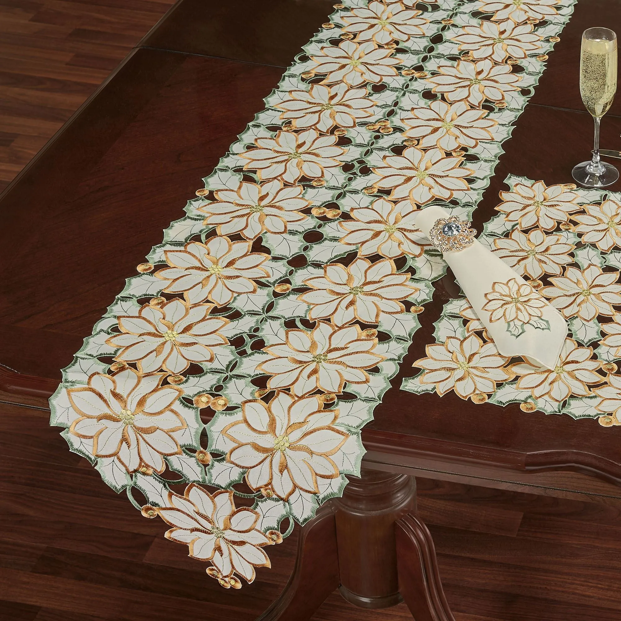 Winter Poinsettia Ivory Cutwork Table Runner and Table Linens