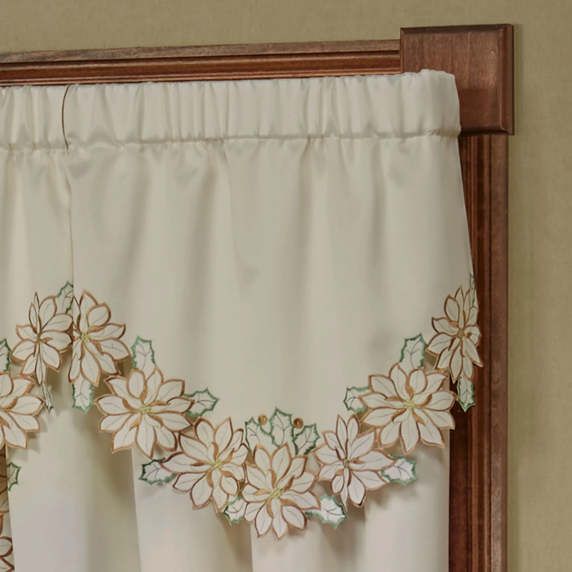 Enjoy the beauty of the Winter Poinsettia Window Treatment this season. Finely cut by hand, the ivory polyester satin accents have cutwork florals detailed with green and gold embroidery. Scalloped edges detail all. Specify Swag Valance Pair, Ascot Valance, Tailored Curtain Pair, or Scalloped Valance. Curtains include cutwork tiebacks. Rod pockets are 3". Machine washable. Imported. The curtain pair width is the total width of two panels together.