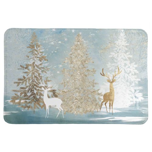 Step into a Winter Wonderland with this charming comfort mat. From artwork by PI Studio presented by Laural Home(R), the ultra-soft polyester face features classic pine tree and deer silhouettes in printed white and golden shades. An icy blue background evokes a snowy winter feel. A memory foam core and a nonskid backing complete the design. Measures 34"x21". Machine washable. USA/Imported.