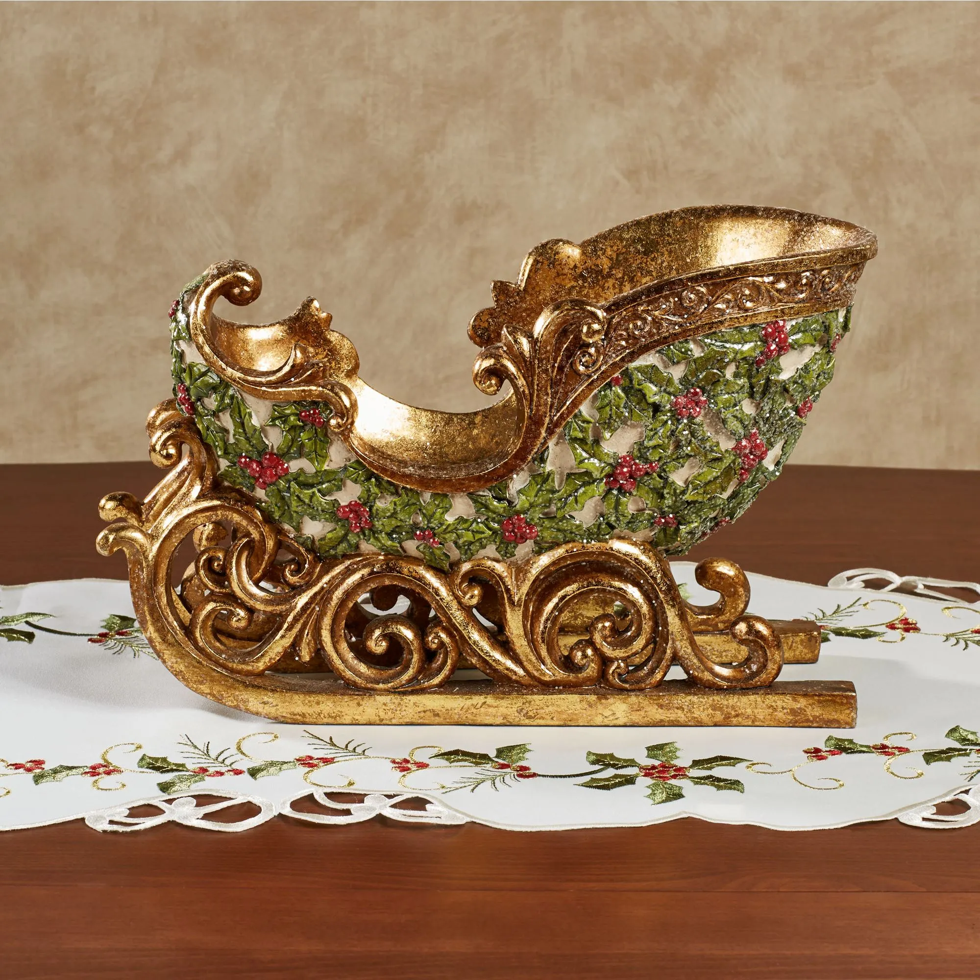 Accented with clear icy glitter, the Winterberry Sleigh Table Accent adds a sparkling traditional touch to your holiday decorations. The decorative resin sleigh features beautiful scrolling runners and an antique ivory body decorated with green holly, red berries, and golden curving trim. Accent provides a charming space to hold your decorative greenery, ornaments, or small gifts. Decorative use only. Measures 14"Wx6"Dx8.5"H.