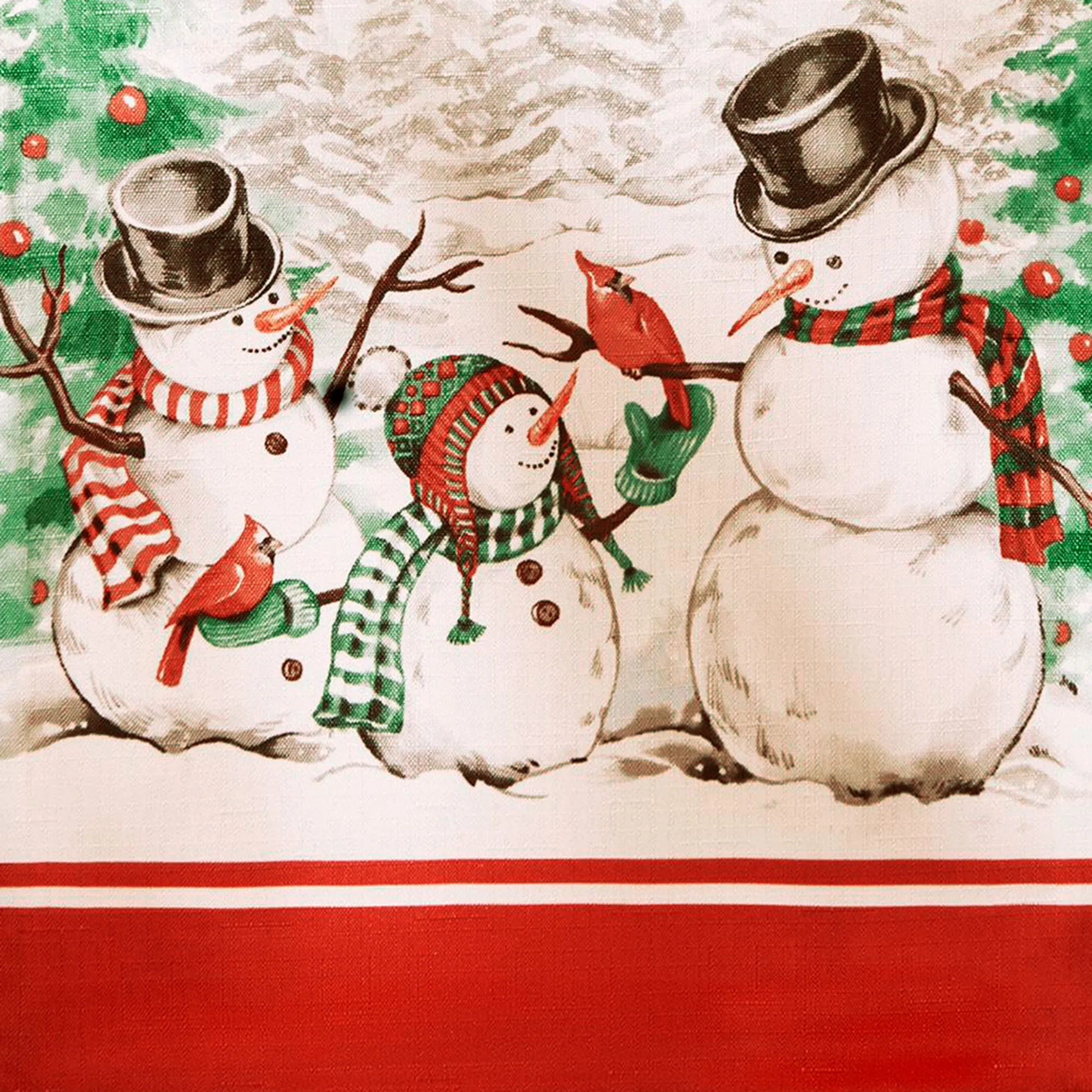 Gather this holiday season and celebrate Winter's Embrace. The tailored, polyester table linens feature snowmen with black hats and striped scarves, red cardinals, green pine trees, and star-shaped snowflakes on an off-white background. A red border completes the classic look. Choose Table Runner, Rectangle Tablecloth, Round Tablecloth, Oval Tablecloth, Placemat Set of 4, or Napkin Set of 4. Machine washable. Imported.