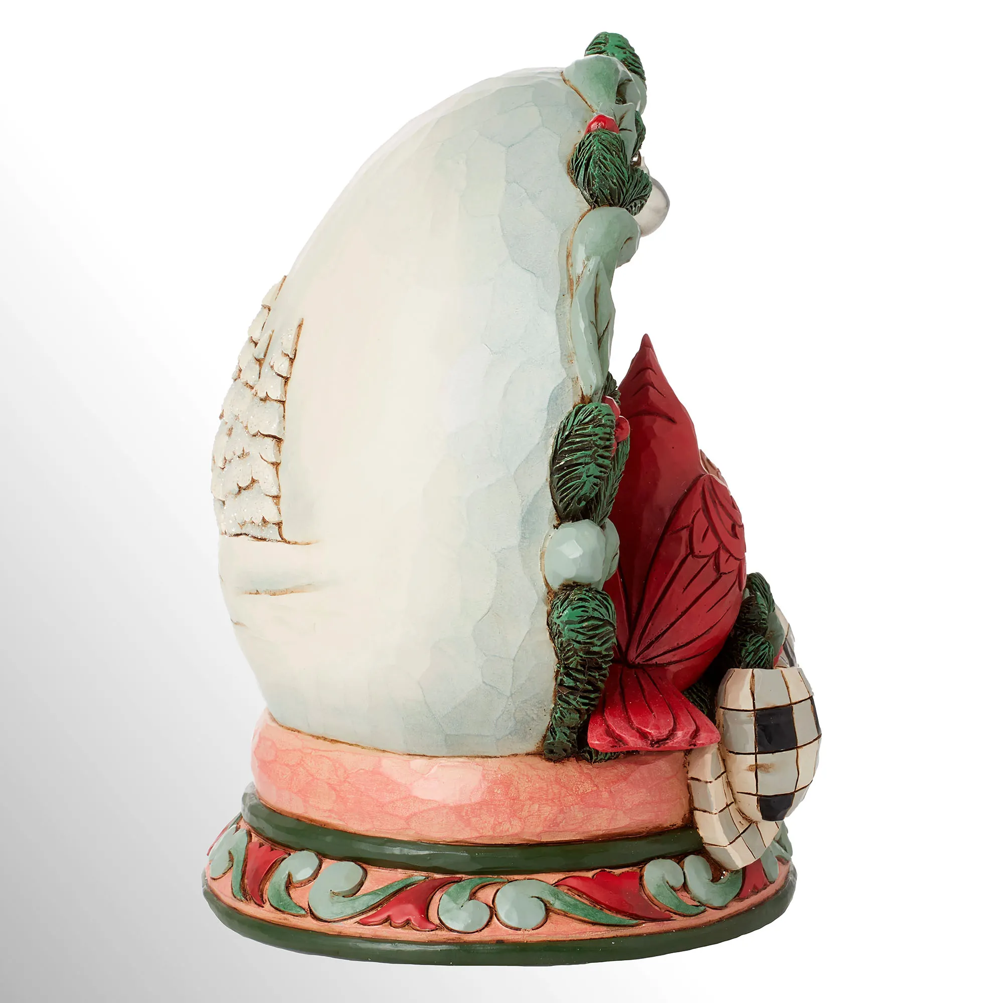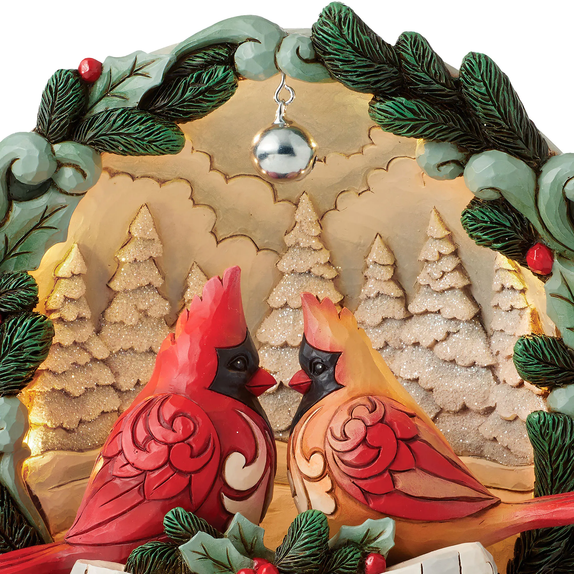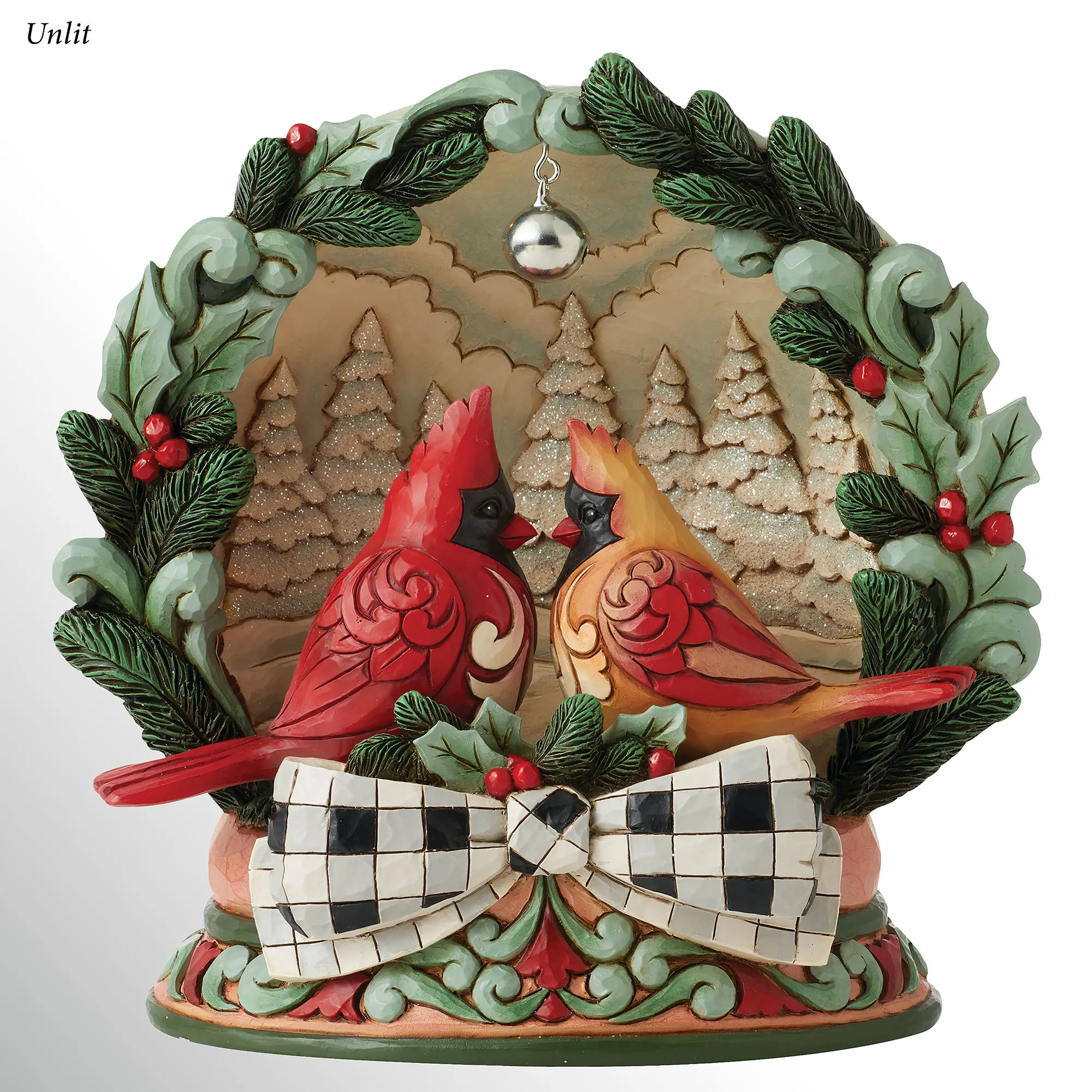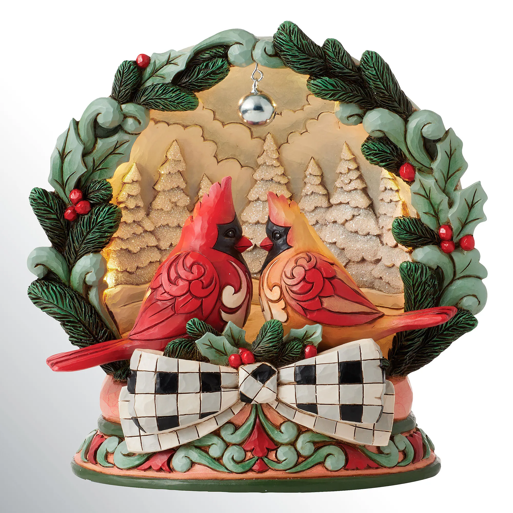 Winter's Whisper ruffles the feathers of this cardinal duo. Handcrafted and handpainted with the undeniable artistry of Jim Shore(R)'s signature style, the stone resin figurine, from the Heartwood Creek(R) Collection, features a charming winter diorama upon a base detailed with scrolls and a plaid bow. Two red cardinals gaze eye to eye in the scene, in front of glittered pine trees and a lovely wreath design. A dangling jingle bell adds charm, while the LED lights add a warm depth. Requires two of your AA batteries to operate the built-in six-hour timer and bottom on/off switch. Jim Shore's unmistakable style evokes a sense of nostalgia with traditional themes, quilt patterns, and motifs inspired by American and European folk art. Overall, the charming Christmas cardinal figurine measures 7"Wx5"Dx7"H.