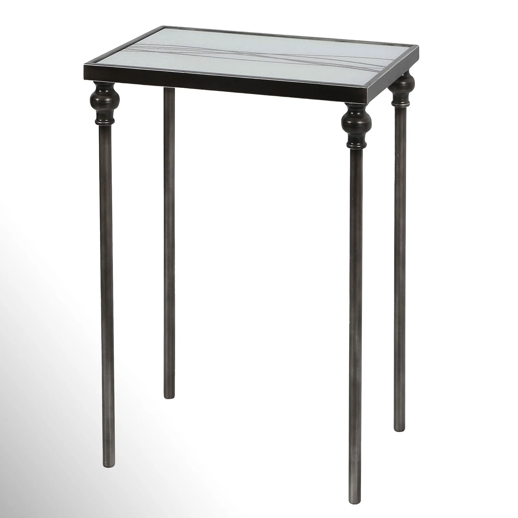 The Wires Petite Side Table has a sleek style that always looks elegant. Made of metal, this petite side table, designed by Austin Allen James, has a stunning gunmetal finish and orb accents. The glass top has gray, reverse-painted abstract designs. Measures 11"Wx17"Dx24"H; weighs 10 lbs.