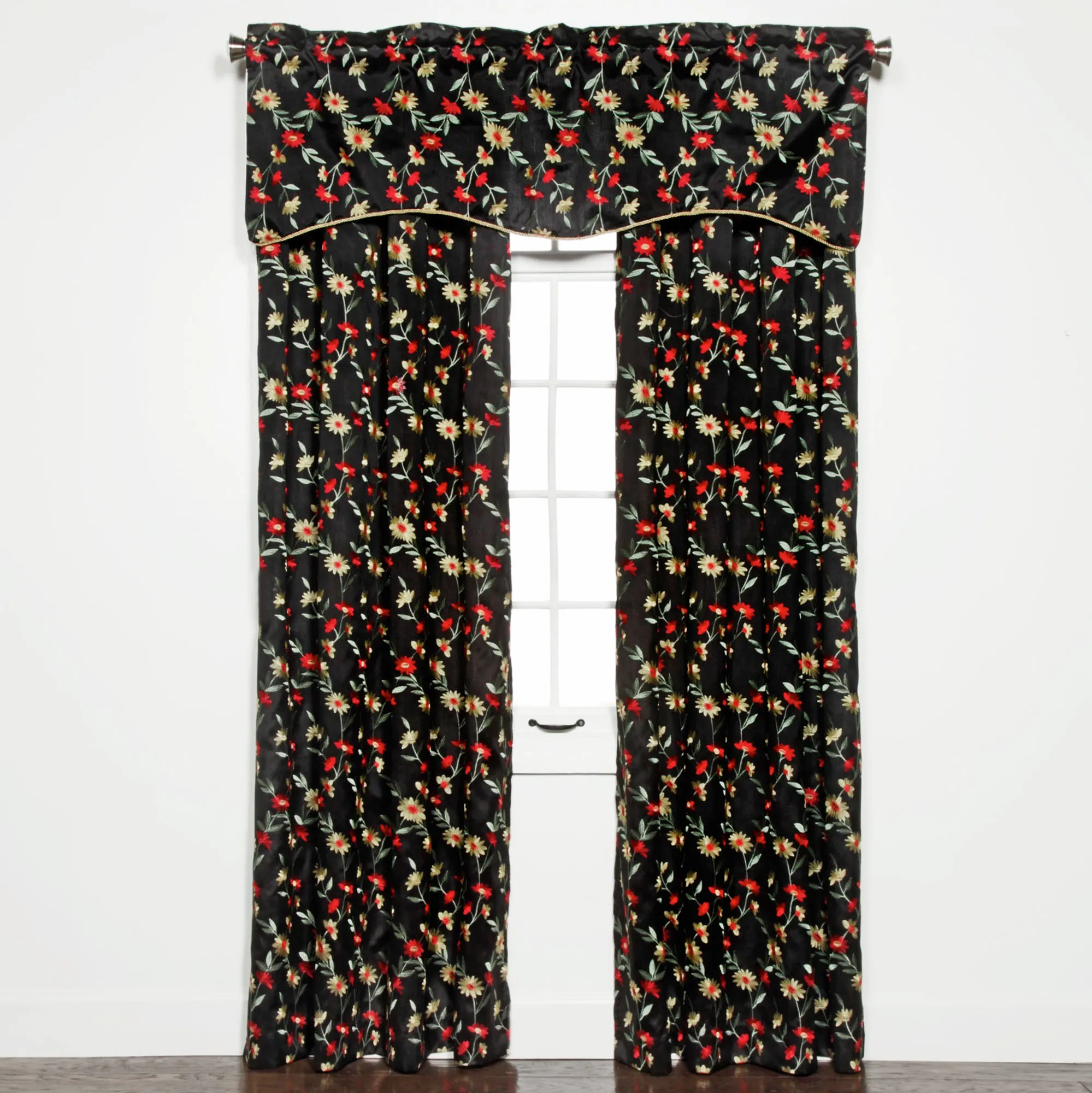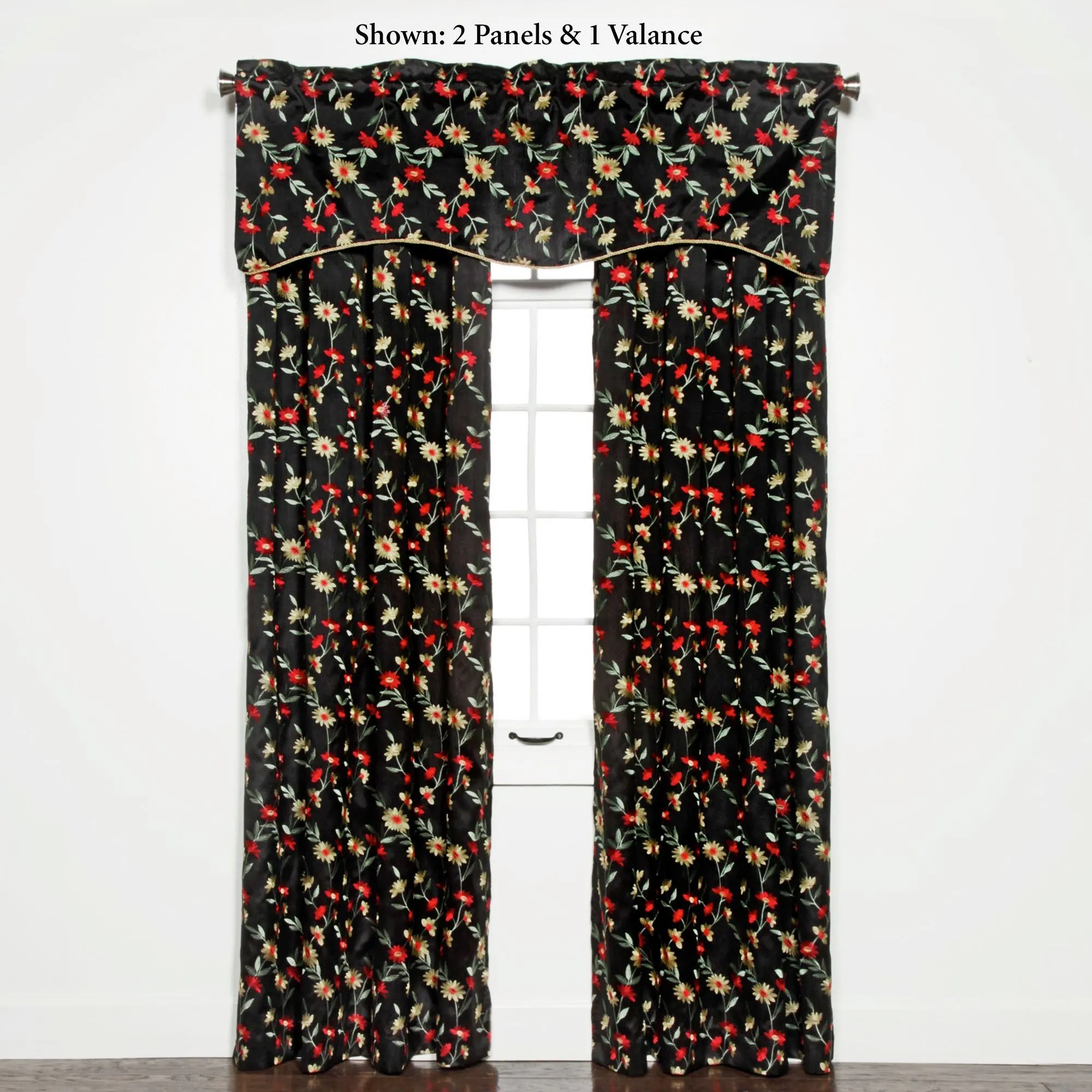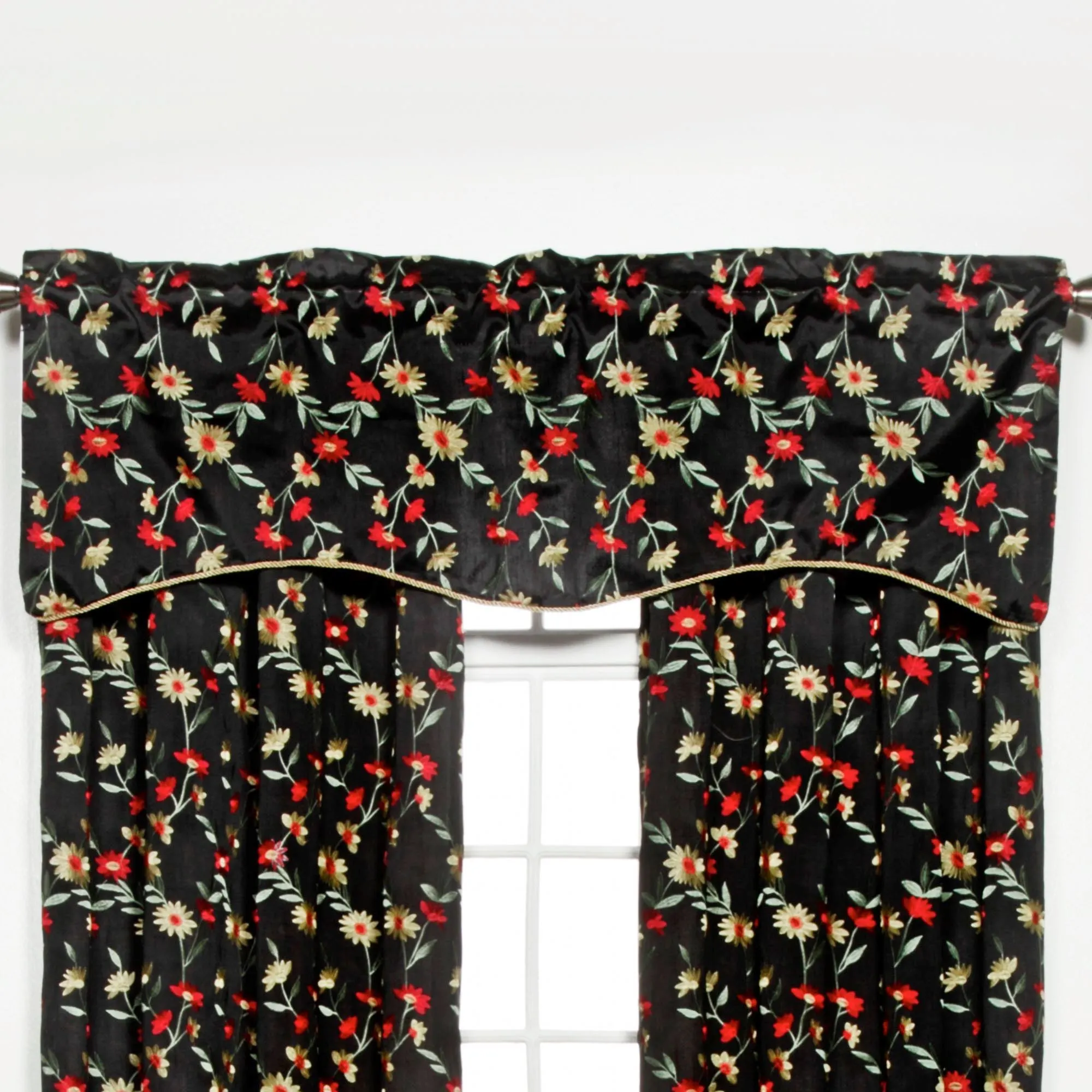 Allow the Wisteria Onyx Window Treatment to frame your view with vining blossoms no matter the season. Each solid color polyester treatment features embroidered florals. The onyx coloration has red and golden yellow blooms on spring green vines. Specify Grommet Curtain Panel, 54"Wx84"L; or Shaped Valance, 52"Wx17"L. Each Tailored Panel has eight 1.5" dia. stainless steel metal grommets. Shaped Valance has a twist-corded edge, polyester/cotton lining, and a 3" rod pocket. Machine washable. Imported.