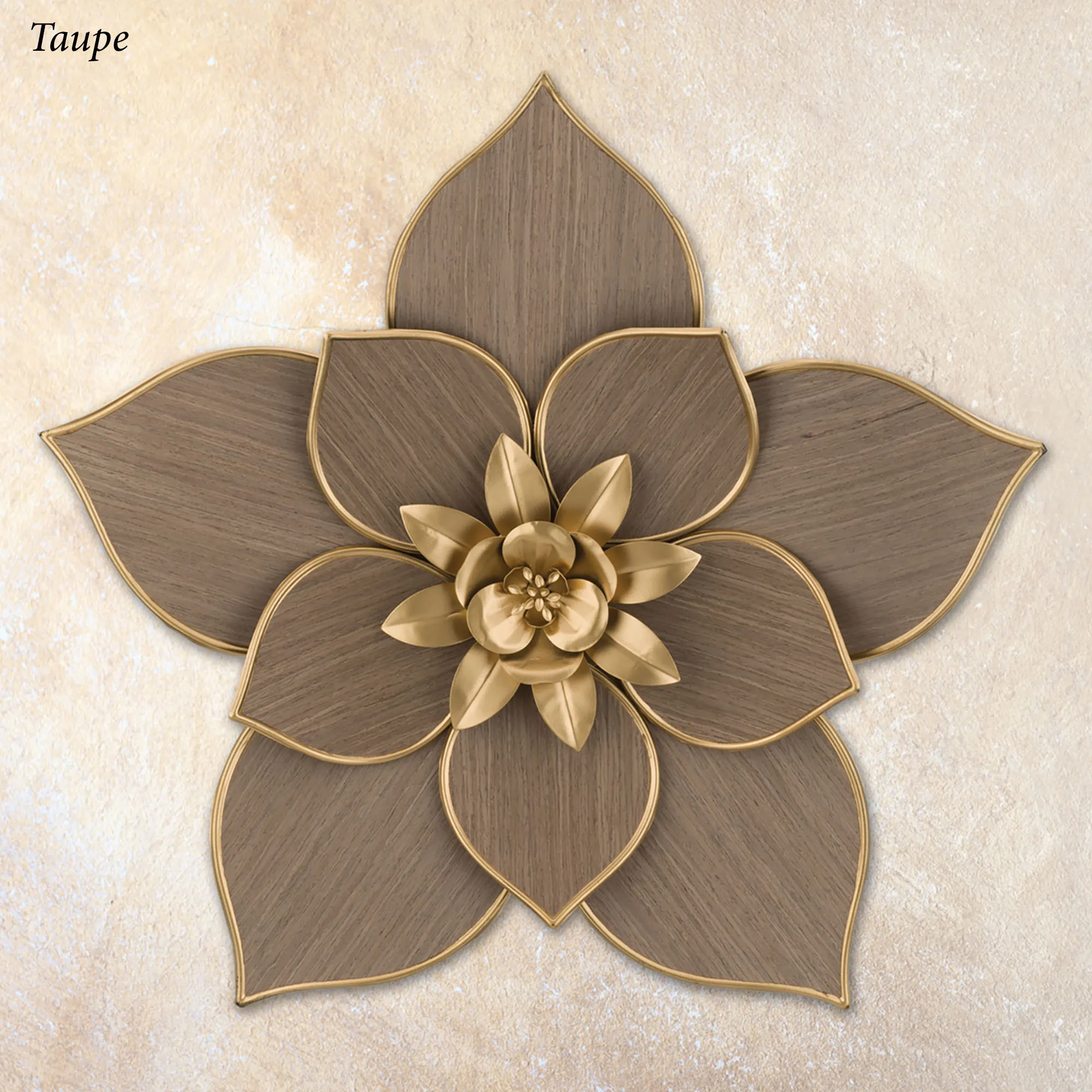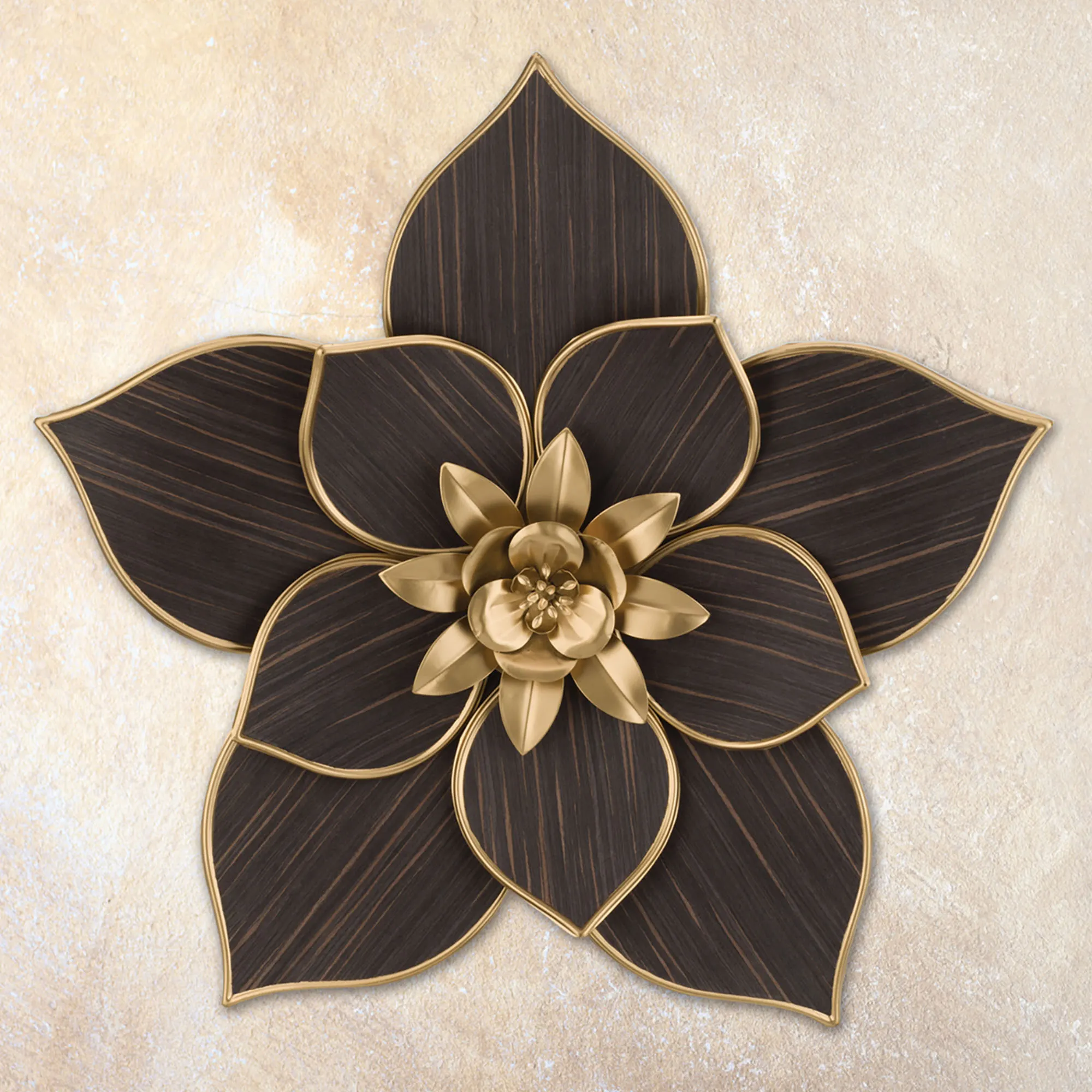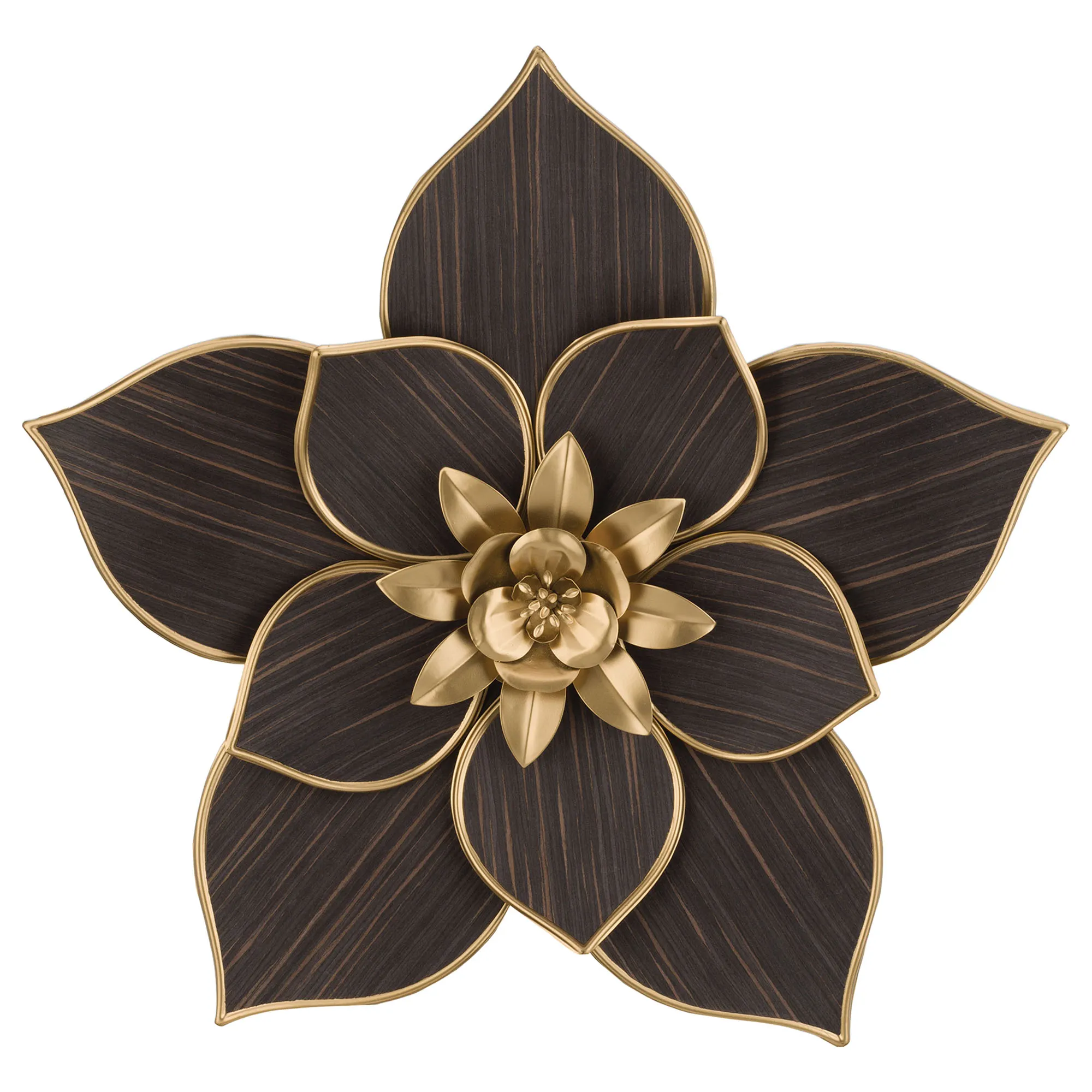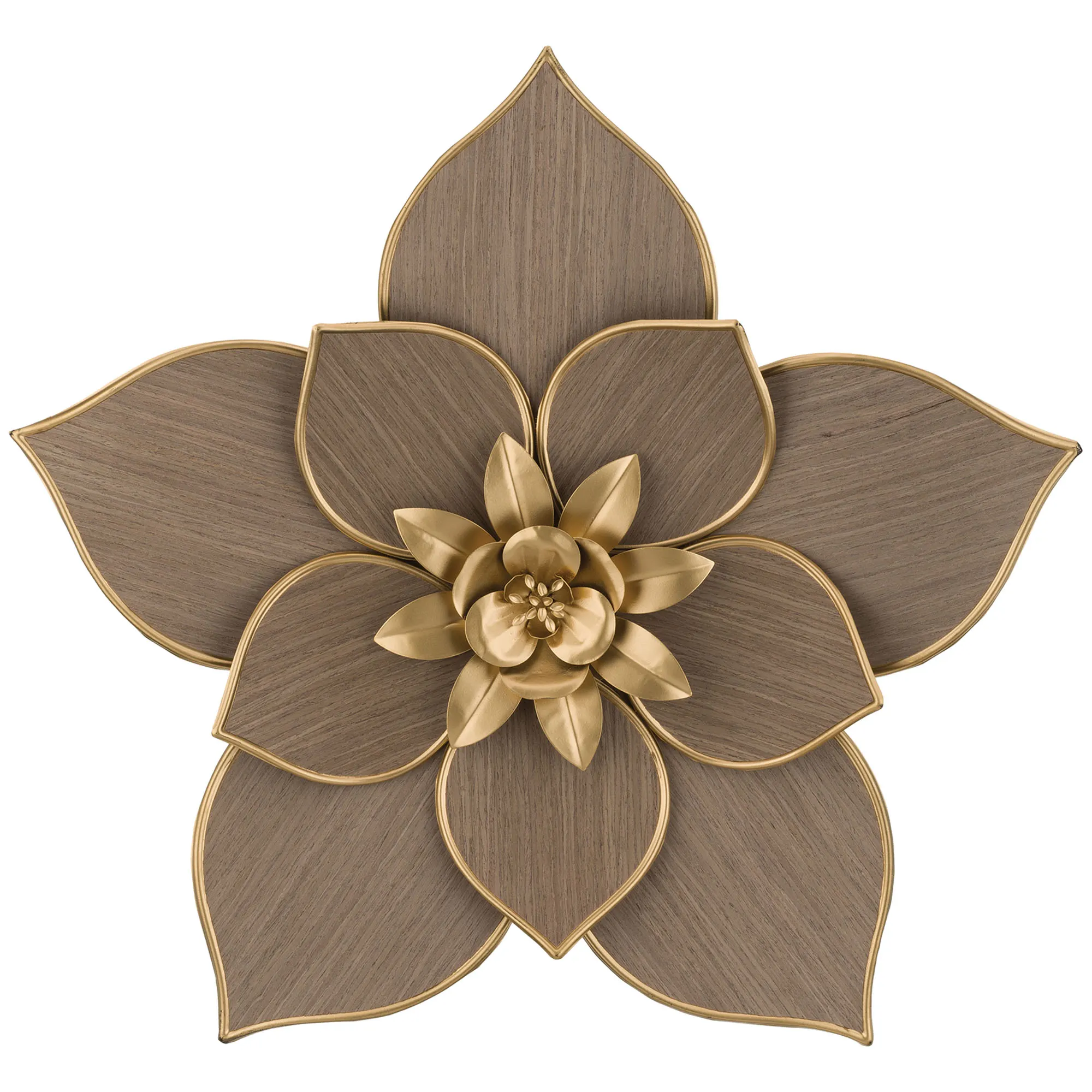 The Woodland Flower Wall Art is a striking fusion of nature and elegance. Crafted from fir wood, this flower has exposed grain and a beautiful color with gold metal trim and central floral and leaf accents. The flower wall art is weather- and fade-resistant and can be used indoors or outdoors year round. Measures 18.5"Wx3"Dx17.5"H.