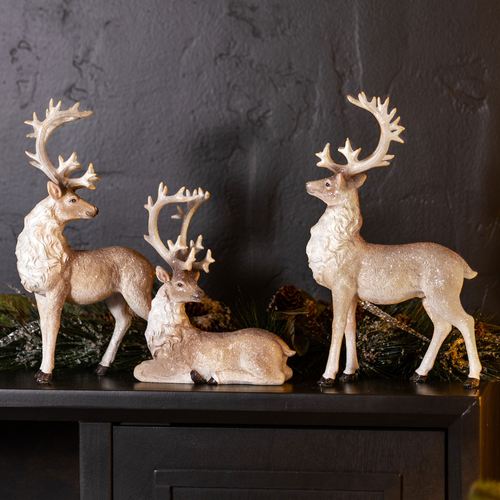 These Woodland Reindeer have heard of your festive decorating skills and have arrived to survey the sights. Crafted from resin, each deer in this set features natural brown hues highlighted with shimmering glitter. Each measures approx. 10"-13.5"H.