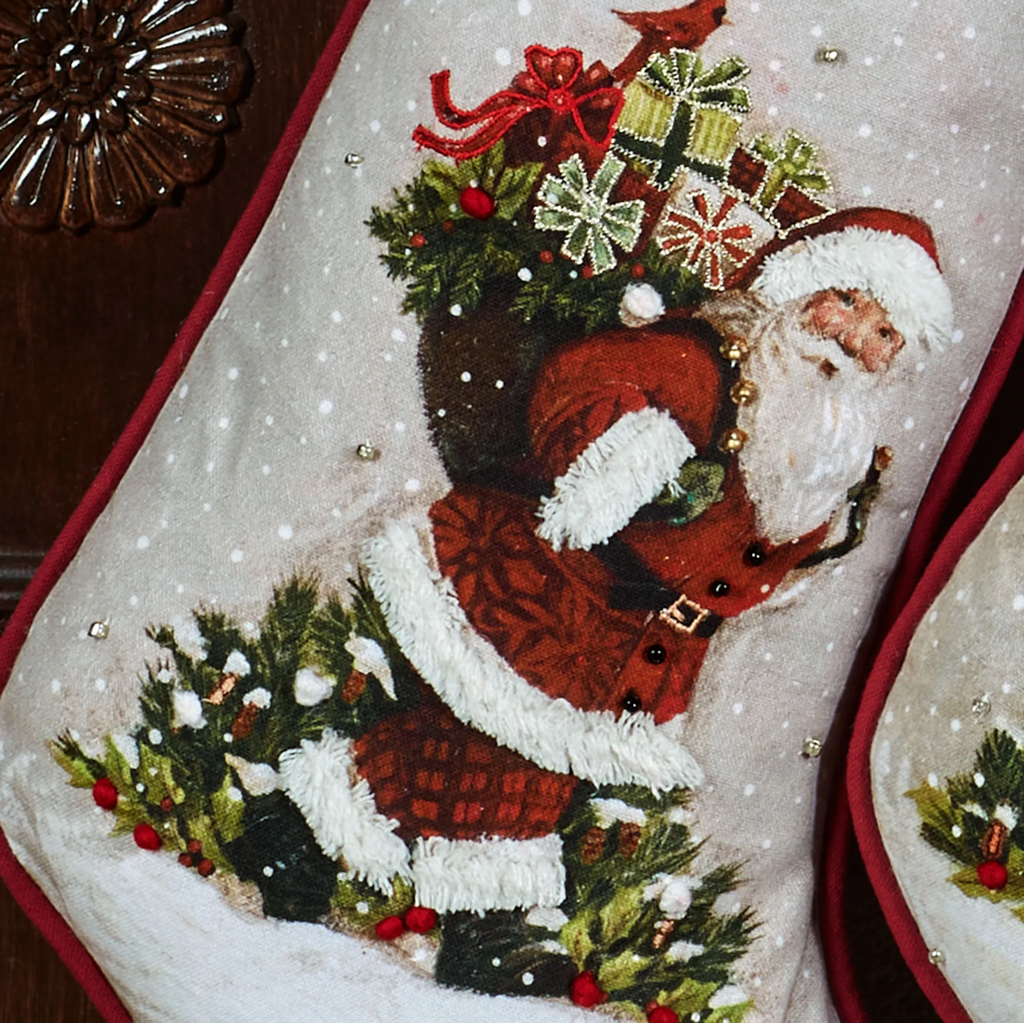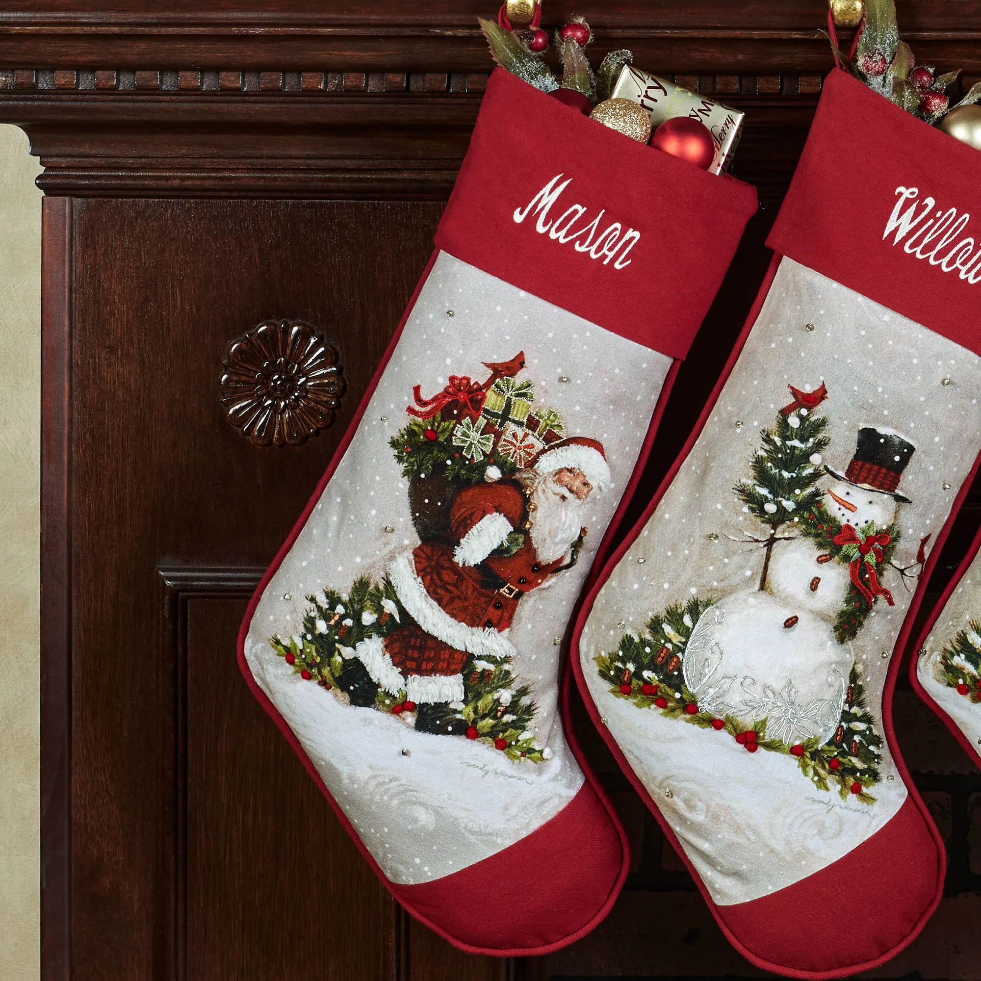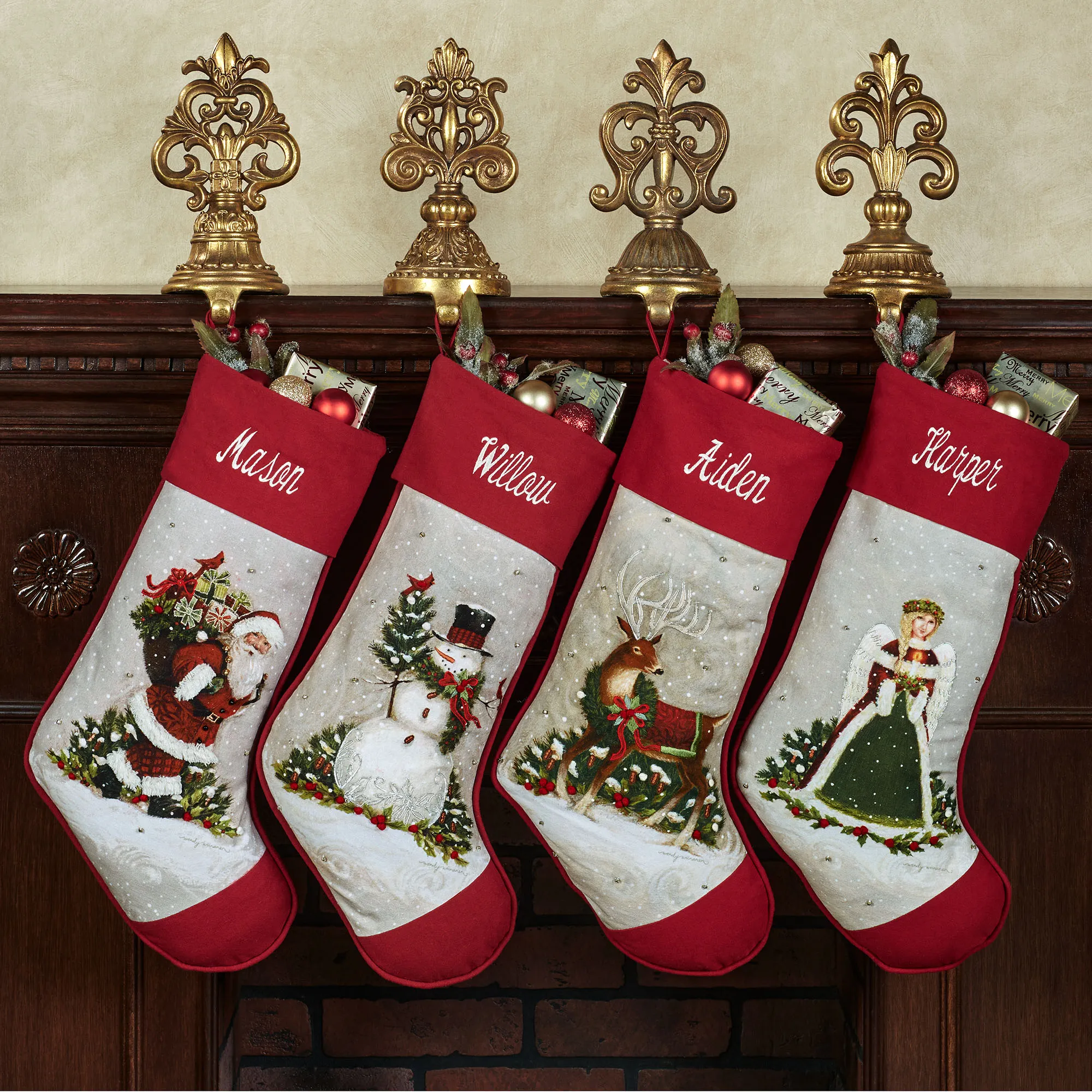 Shimmering details add splendor to the Woodland Christmas Stockings. Beautifully designed by artist (C)Wendy Wiinanen, each printed cotton stocking features a serene scene detailed with falling snow, beaded accents, dimensional red berries, metallic stitching, and classic hues of red and green. Santa carries presents on his back; his suit has fluffy ivory trim. Snowman wears a garland scarf and visits with cardinal pals. Reindeer wears a wreath around his neck and a cozy blanket on his back. Angel has a beautiful braid and holds a glowing candle. Personalization is available, as shown, for FREE! Click on the burgundy "i" icon below the item name for more information. Stockings are sold individually. With a red loop, cuff, and toe, each Christmas stocking is 8.5"Wx20"L. Spot clean only. Imported.