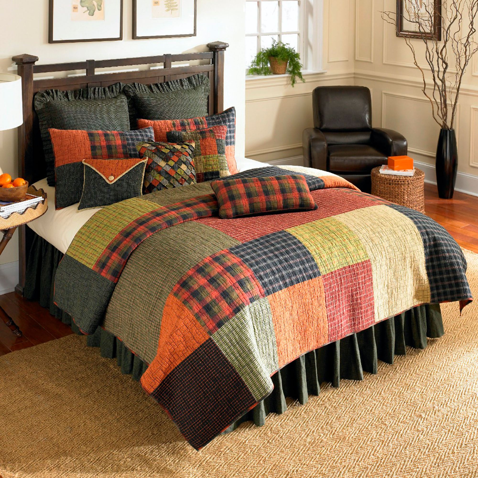 Plaids and bold colors decorate the Woodland Square Patchwork Quilt from Donna Sharp(R). The cotton quilt features black, cream, burgundy, green, and pumpkin tones in a patchwork pattern. Various woven plaid blocks create the design, while hopscotch quilting adds a geometric flair. Backing is burgundy and black plaid cotton. Quilt fill is cotton. Machine washable. Imported. Sorry, some accessories shown are not available.