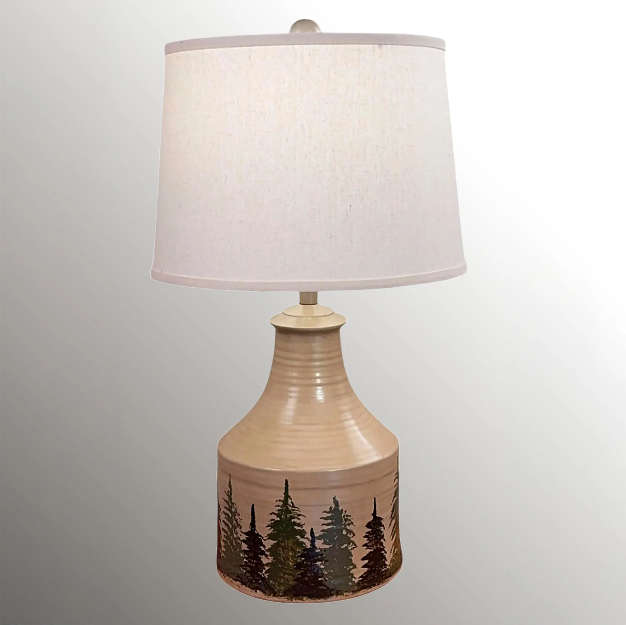 Place Woodland Trees in any setting for rustic inspiration. This handcrafted and hand-finished fibercast table lamp has a tan jug-style base with a tapered neck and features pine trees in dark hues along the bottom. The fabric drum shade is ivory. UL listed. Requires one 100W max. 3-way bulb. Measures 14"dia.x25"H, including the 1.5" dia. wooden ball finial.