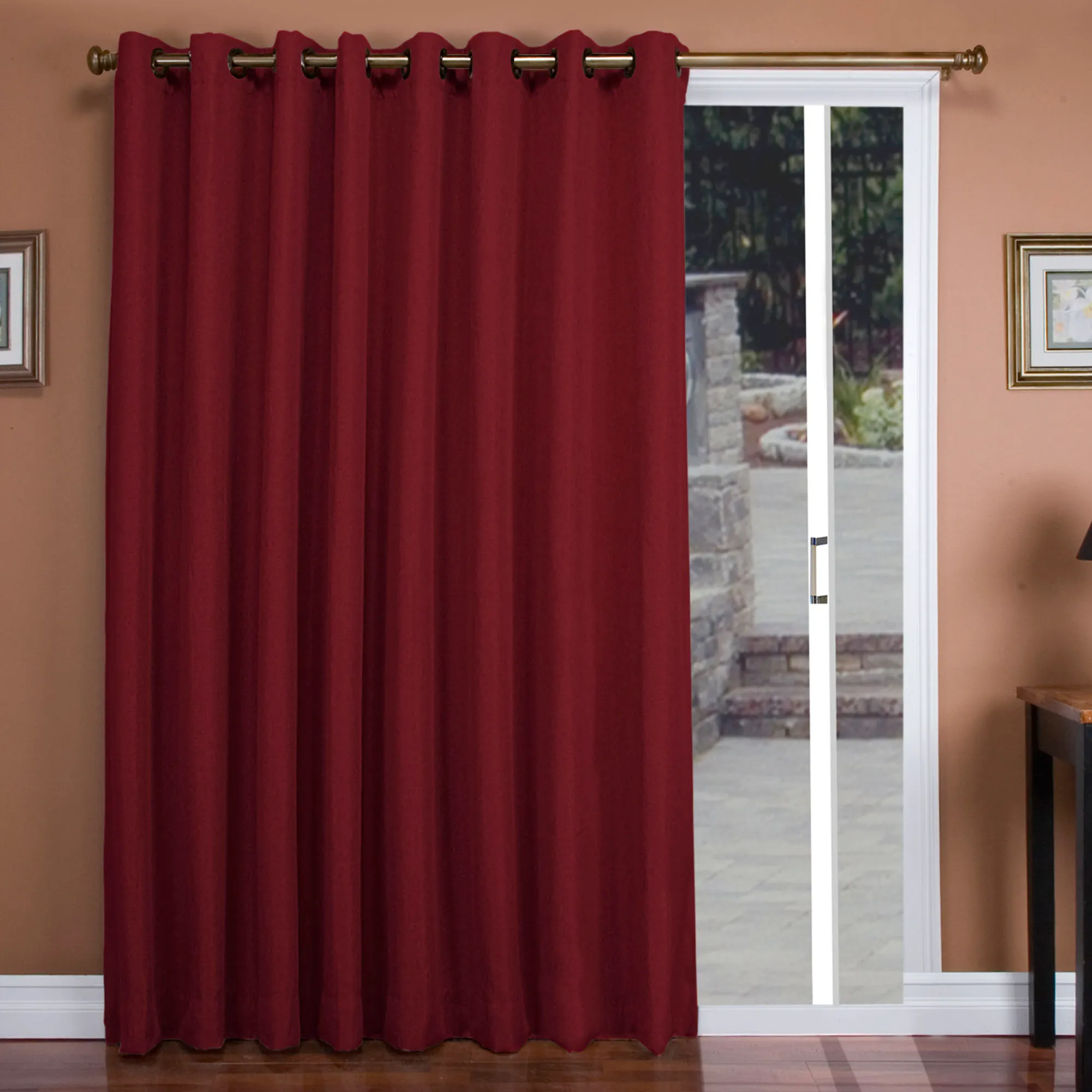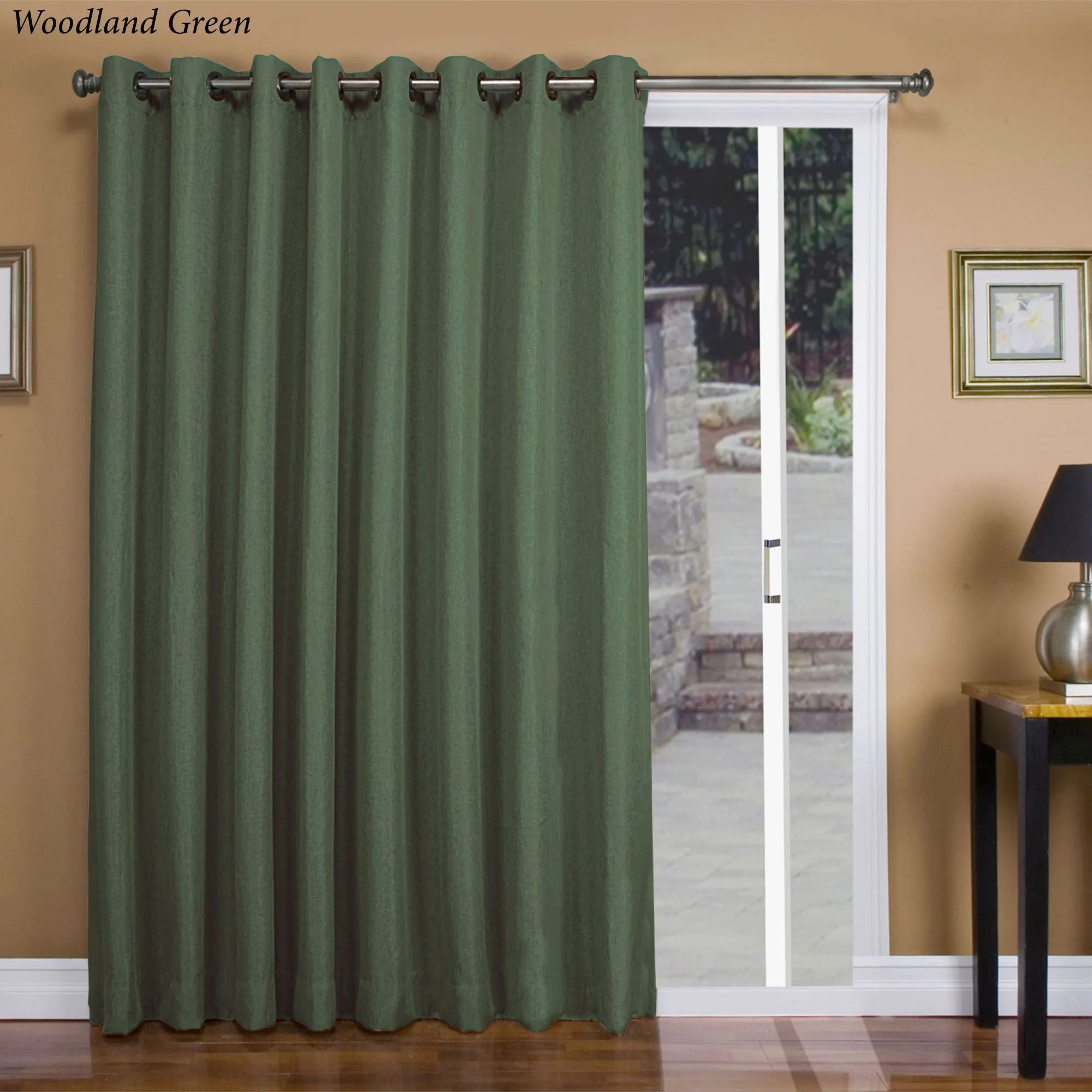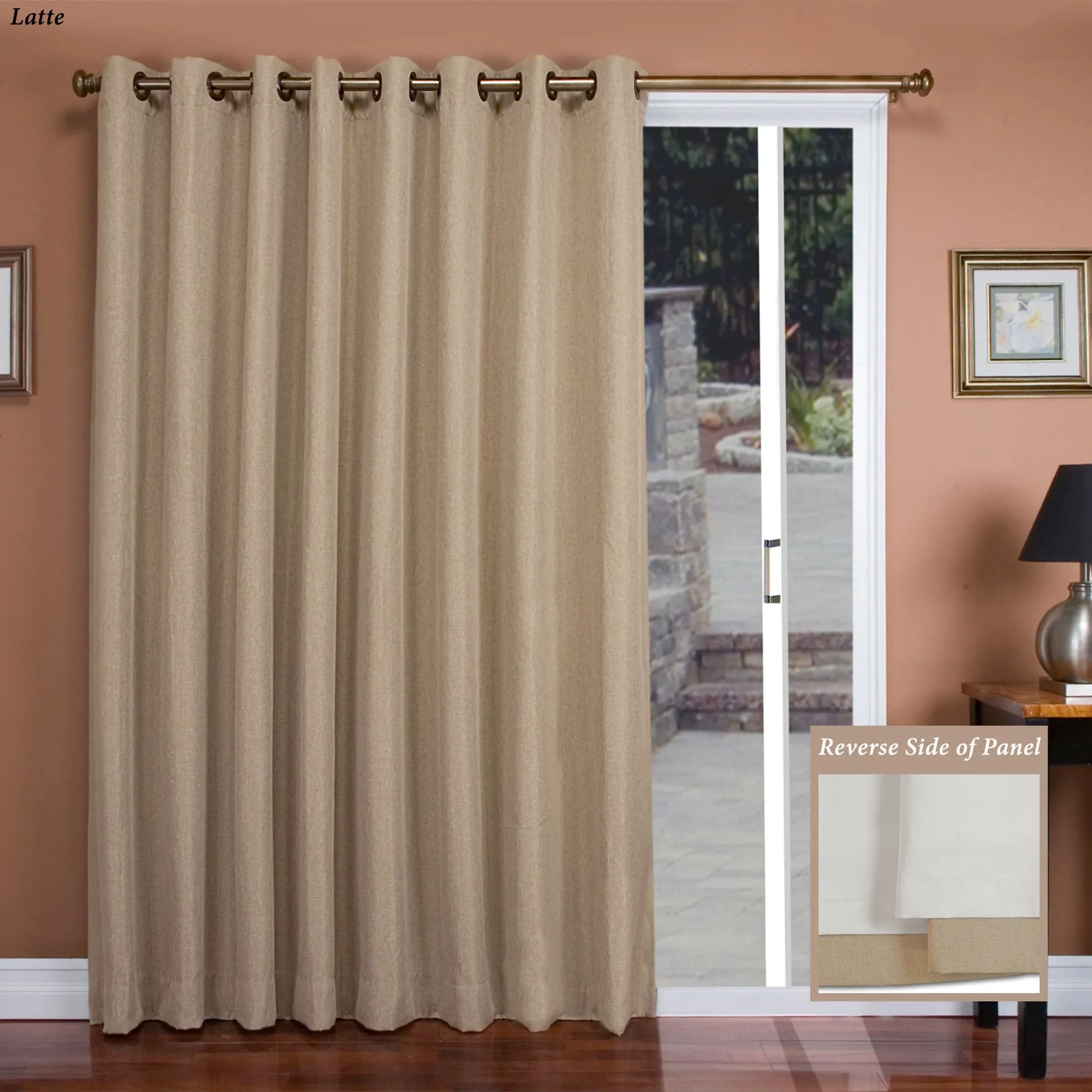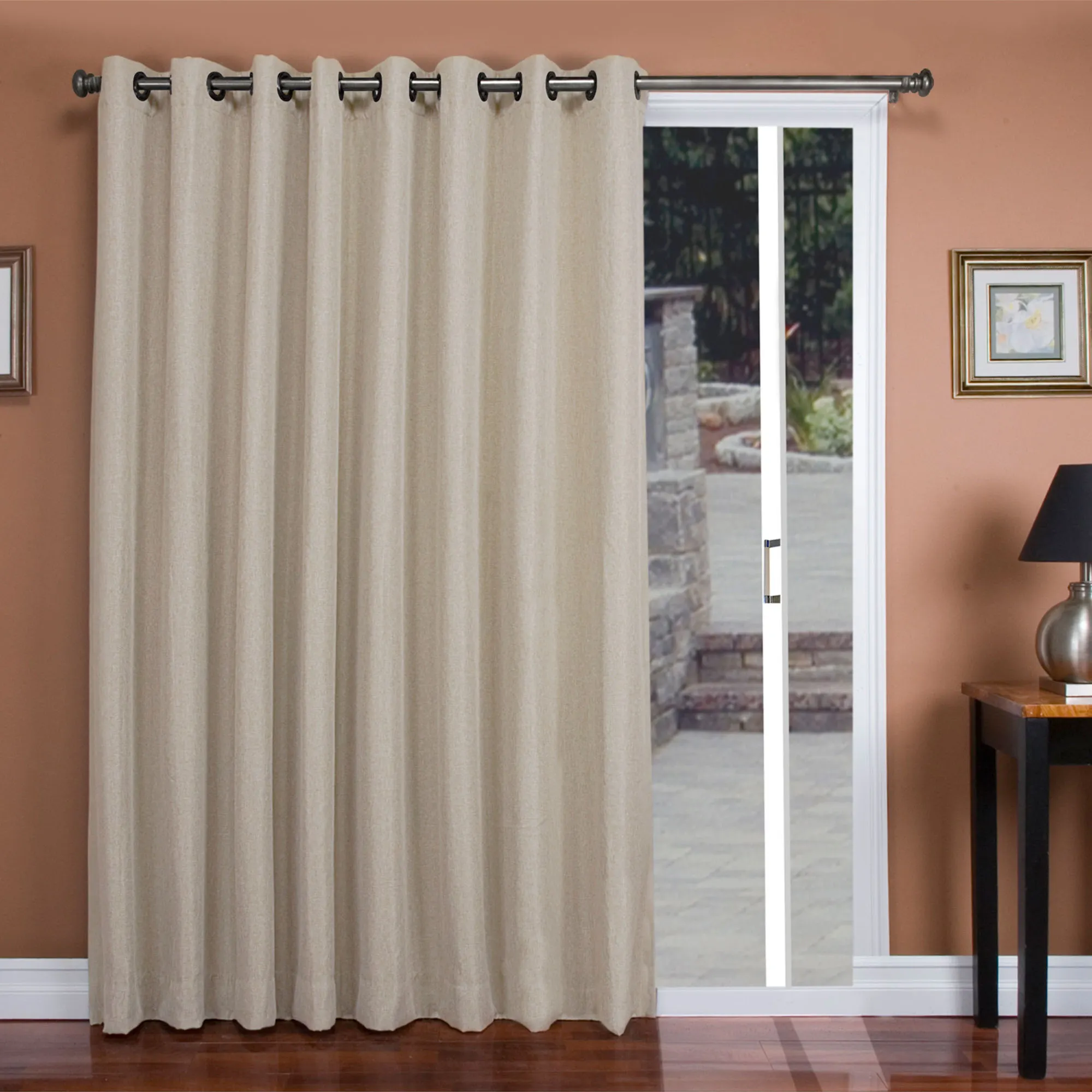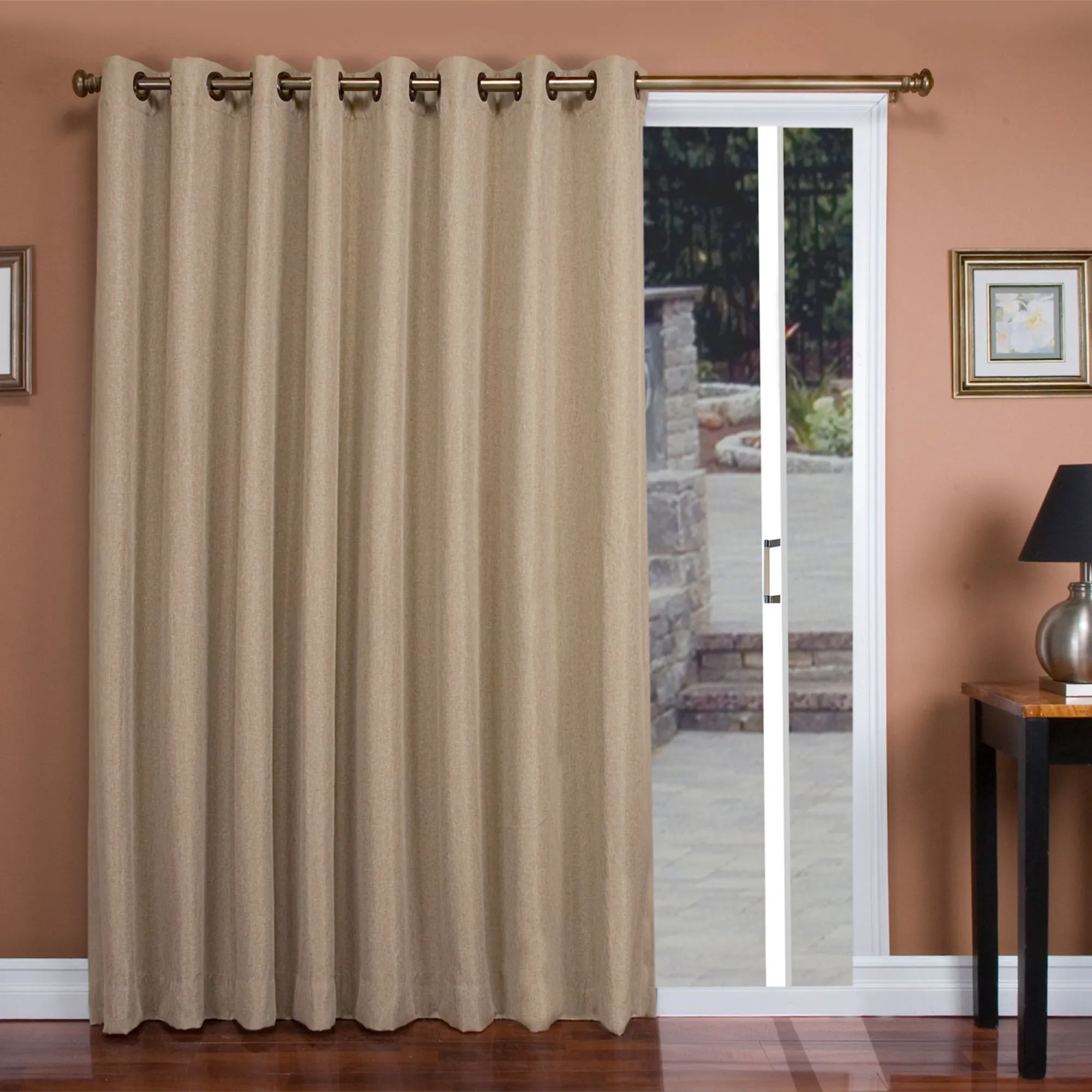Casual and practical, the Worthington Blackout Grommet Patio Panel provides a helpful accent to your view. With a natural canvas appeal, the polyester patio panel features a solid color lined with woven blackout yarns to block bright light, help save energy, and create a barrier for drafts. Weighted corners keep it looking taut. A pull wand that can be attached to either side heightens the panel's functionality. Each patio panel has sixteen 1.5" dia. metal grommets on the top. Burgundy, Latte, and Woodland Green have an antique bronze finish. Ecru and Gray have a brushed nickel finish. Sold individually, the patio panel measures 106"Wx84"L. Machine washable. Imported.