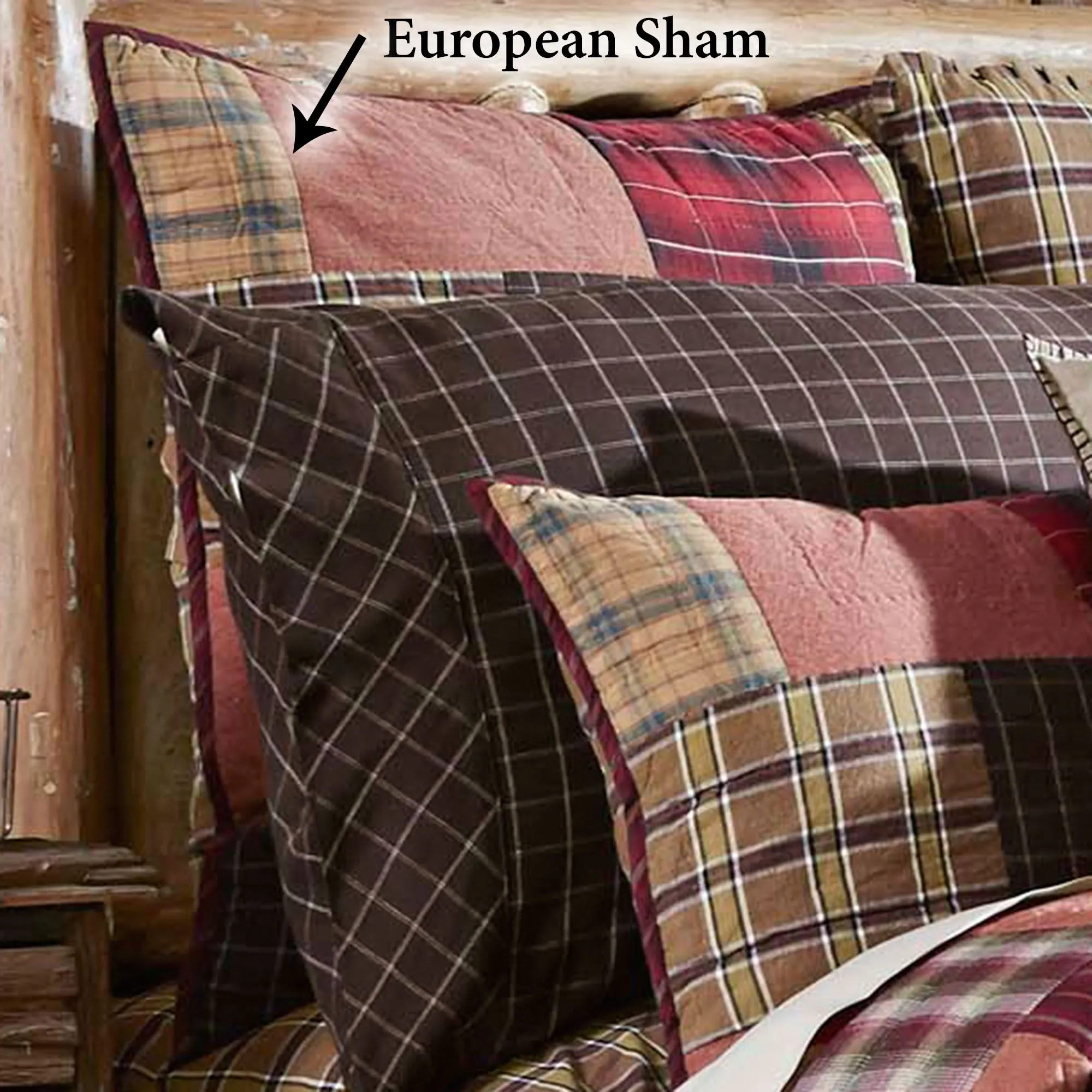 The Wyatt Quilt features a variety of plaid patchwork blocks finished in bound edges. Quilt reverses to coordinating plaid in light brown, moss, and black. Quilt fill is cotton. For patchwork quilt, choose Queen, King, or Super King.