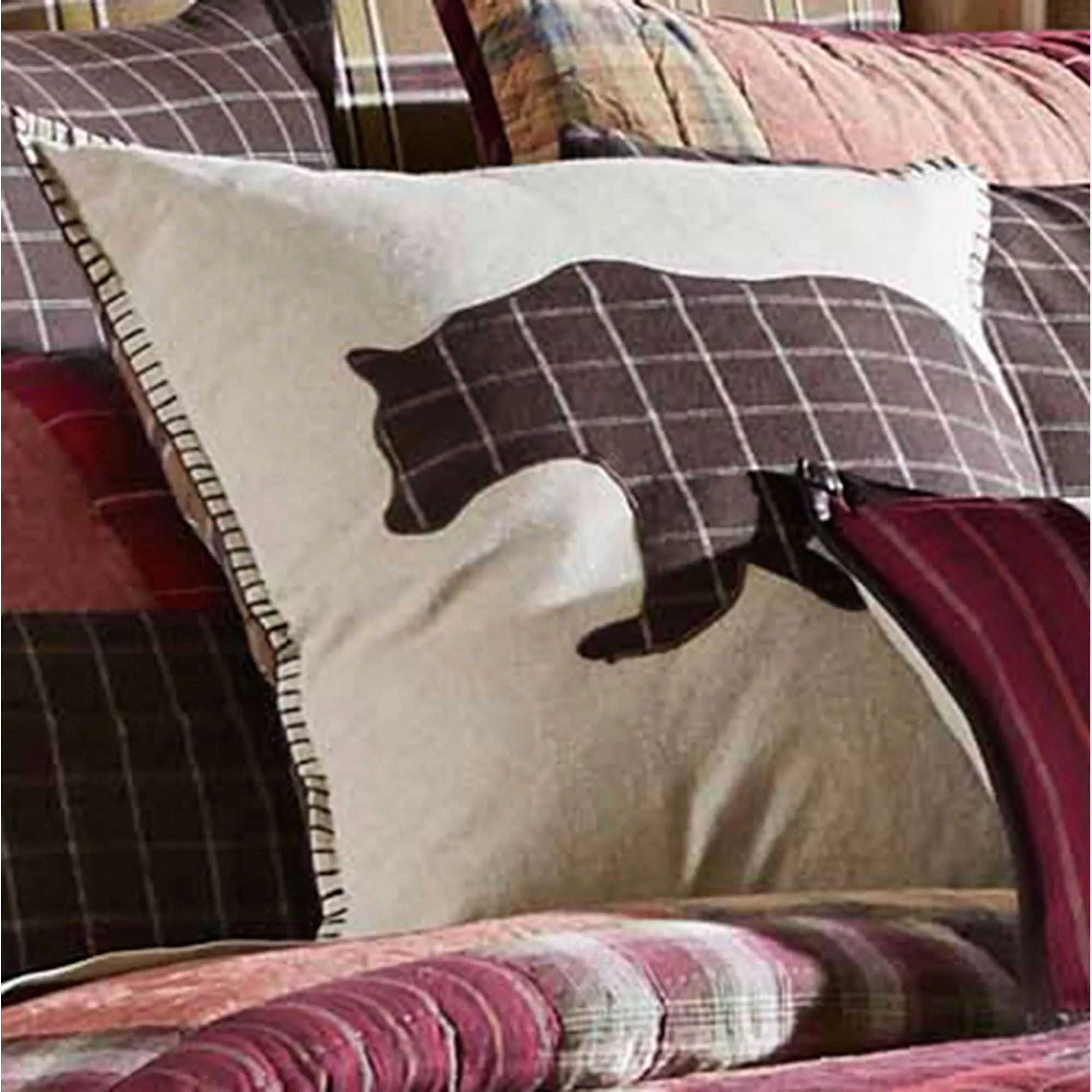 Flanged Pillows have applique animals with outline embroidery on cotton; French back closure with ties. Inserts are polyester. Square features a coffee plaid bear on almond with decorative stitching edges. The pieced Deer Rectangle has a coffee plaid deer on almond with red plaid sides and faux leather edges. The Fox Rectangle has an almond fox on coffee plaid with decorative stitching edges.