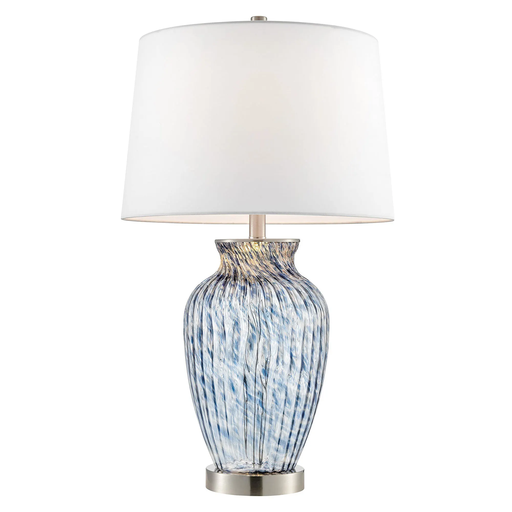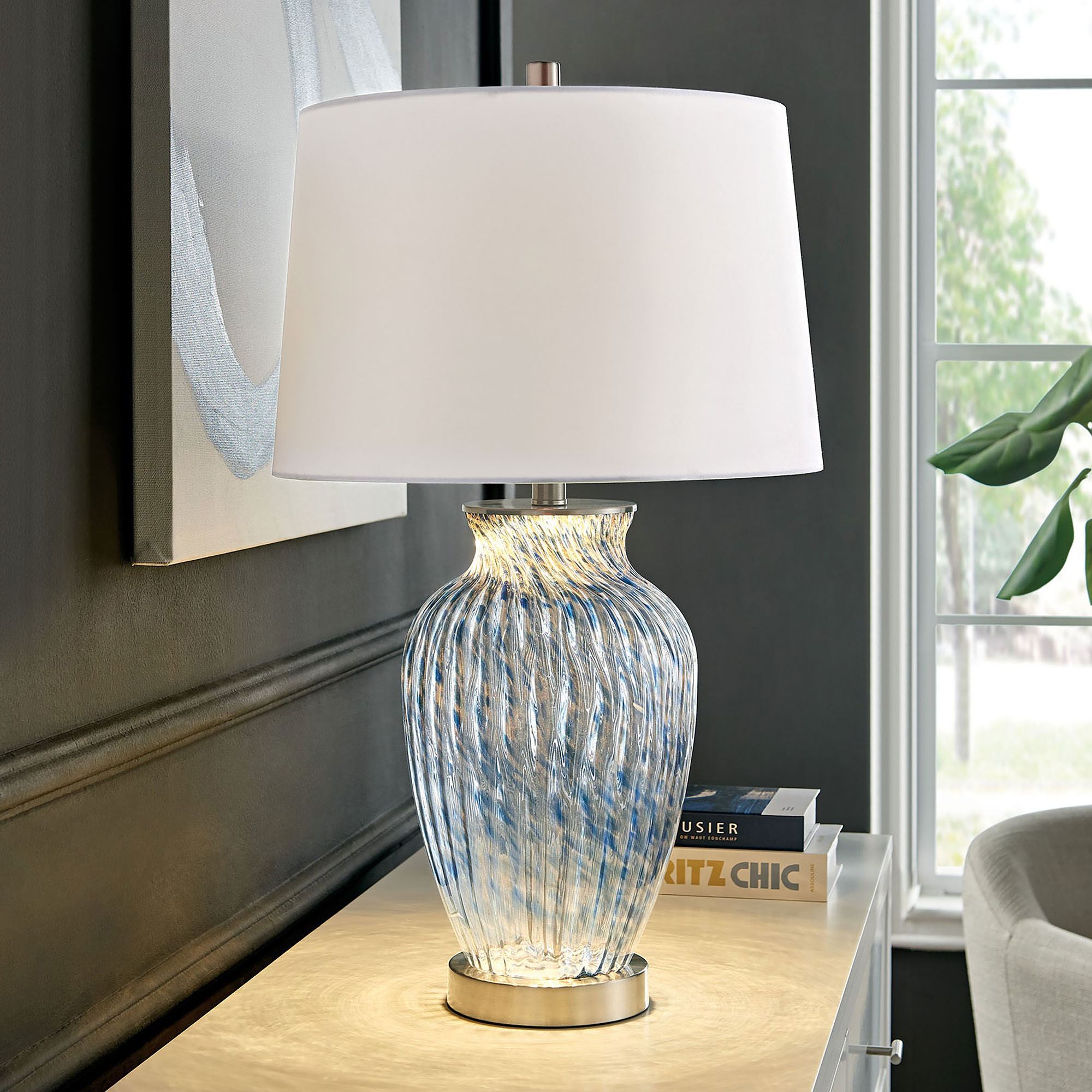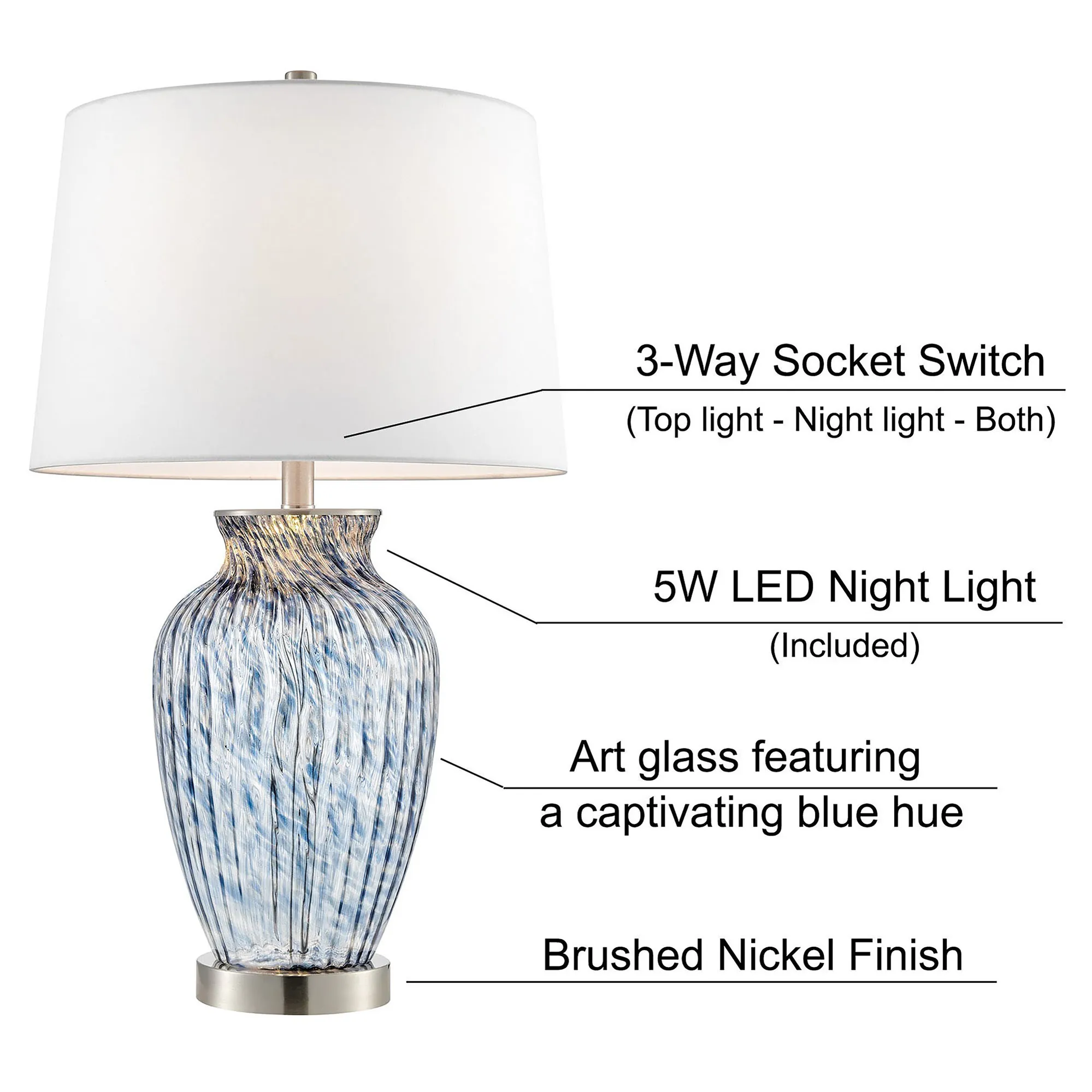 A striking blue hue swirls about the Wyatt Table Lamp for a captivating look. With a brushed nickel metal base, the lamp features a fluted, urn-shaped glass design filled with clear and blue tones. The light from the included 5W LED bulb glows from inside the glass for a beautiful nightlight accent beneath the white fabric shade and cylinder finial. UL listed. Requires one 100W max. bulb that operates the three-way lighting (top, nightlight, or both). Overall, the table lamp measures 16"dia.x28.5"H.