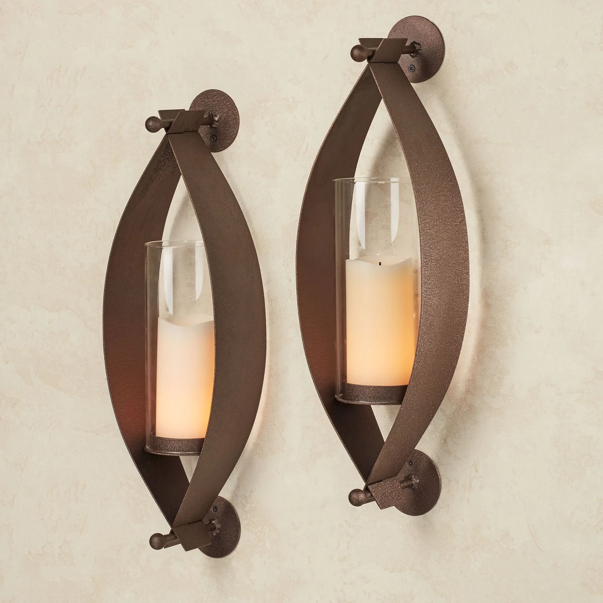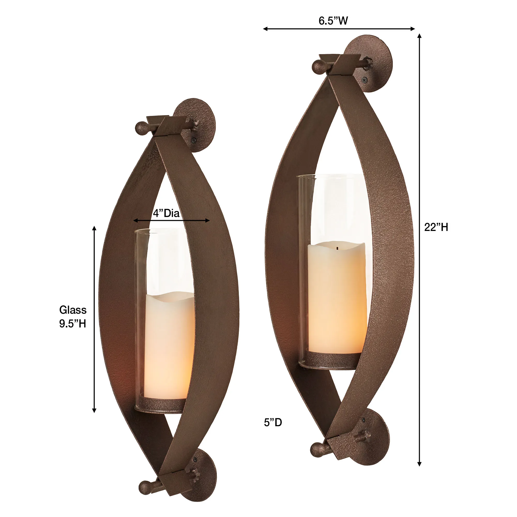 Proudly made in the USA, the Xander Wall Sconce Pair adorns a space with graceful intrigue. Accented with round brackets, each curved, bronze-finished sconce cradles an included 4"dia.x9.5"H glass hurricane, which holds your 3" dia. pillar candle. Designed by JasonW Studios(R), the unique design is handcrafted by American craftsmen of 14-gauge steel and finished with a UV-, weather-, and tarnish-resistant powder-coat hue that complements your decor. Each wall sconce measures 6.5"Wx5"Dx22"H. Pair weighs 10 lbs.