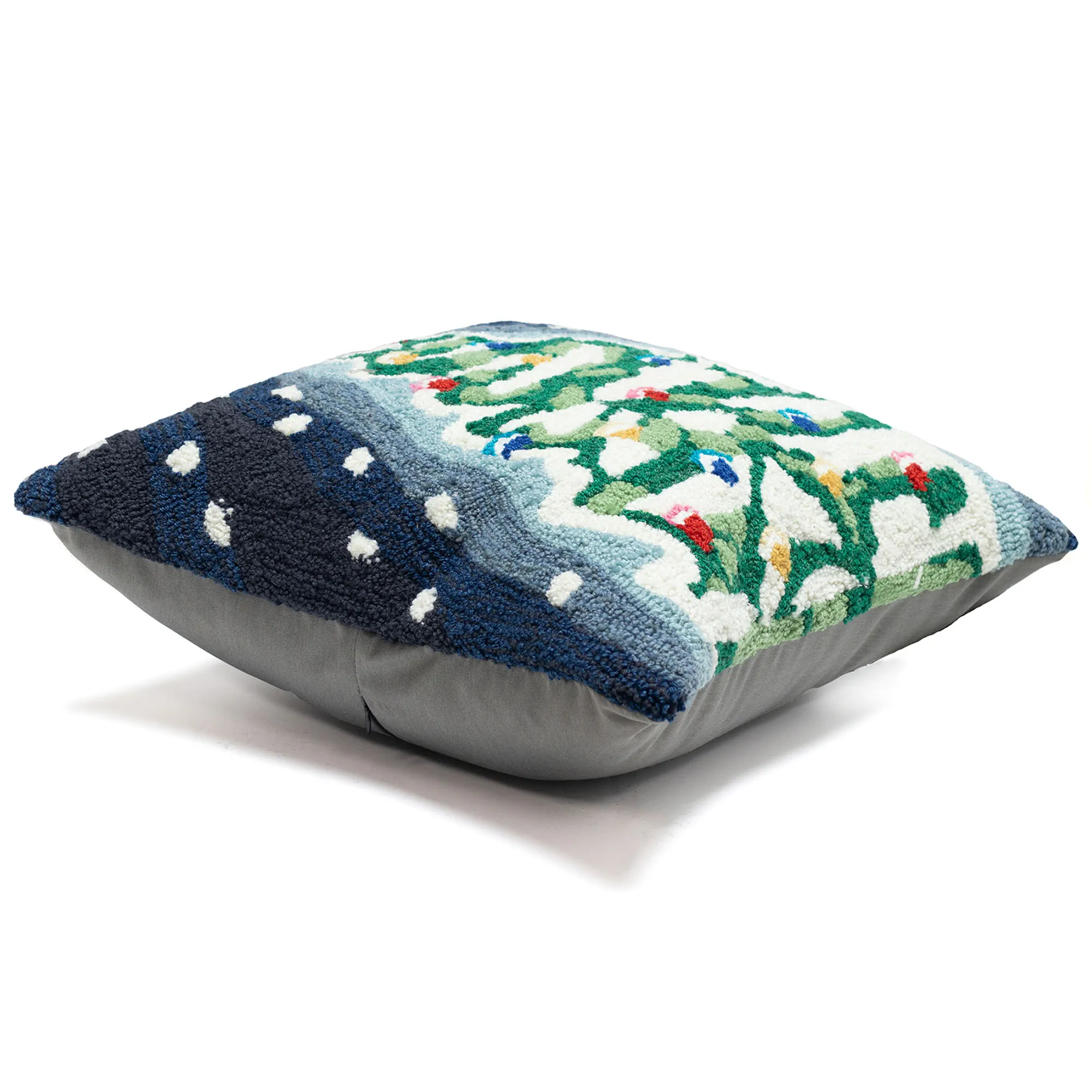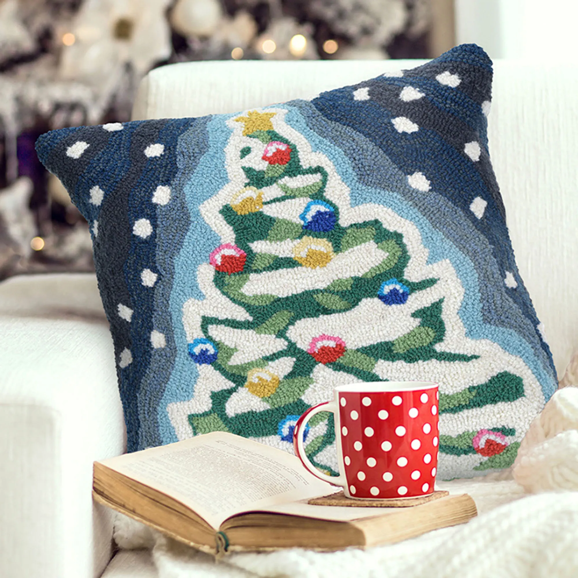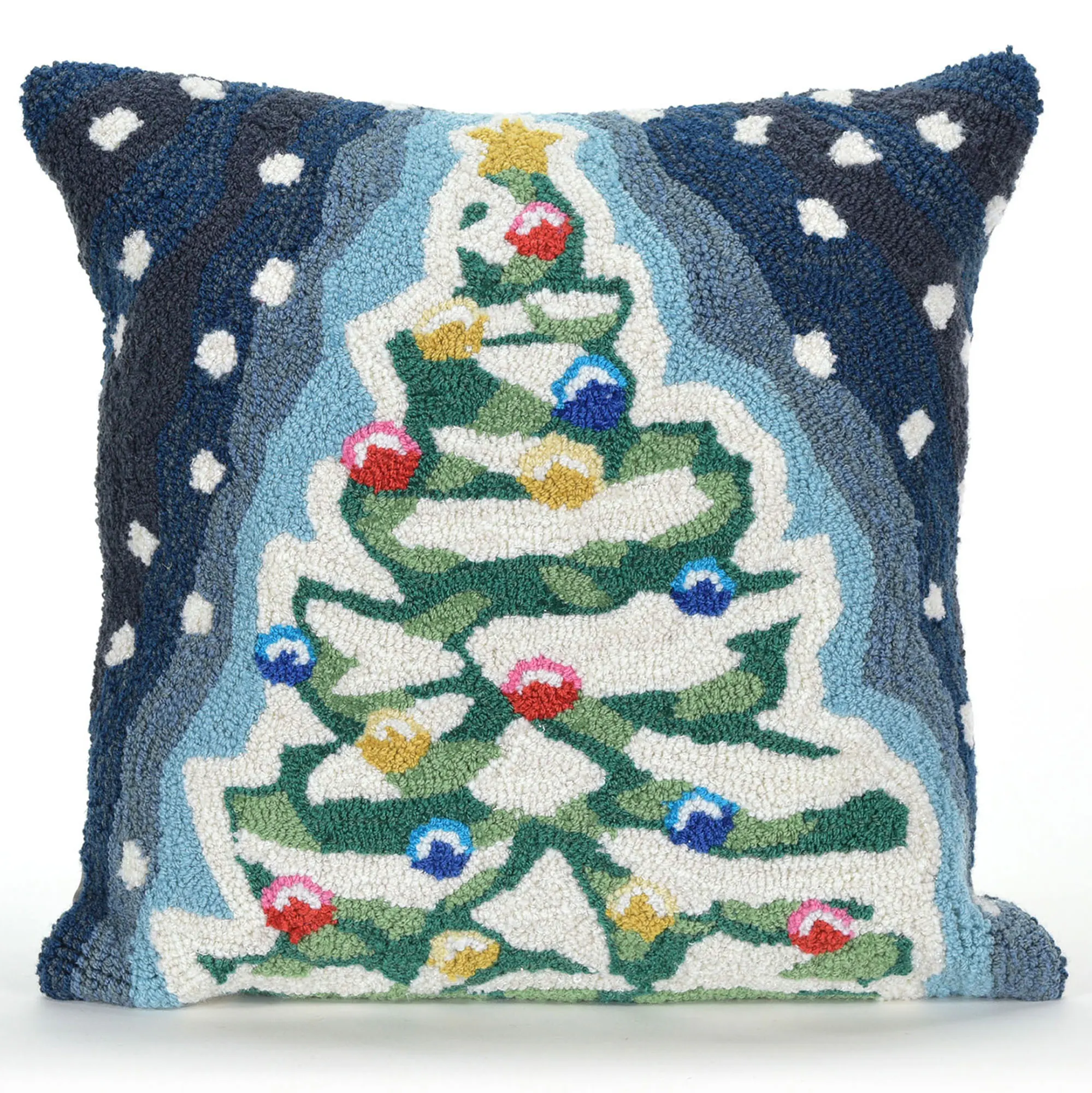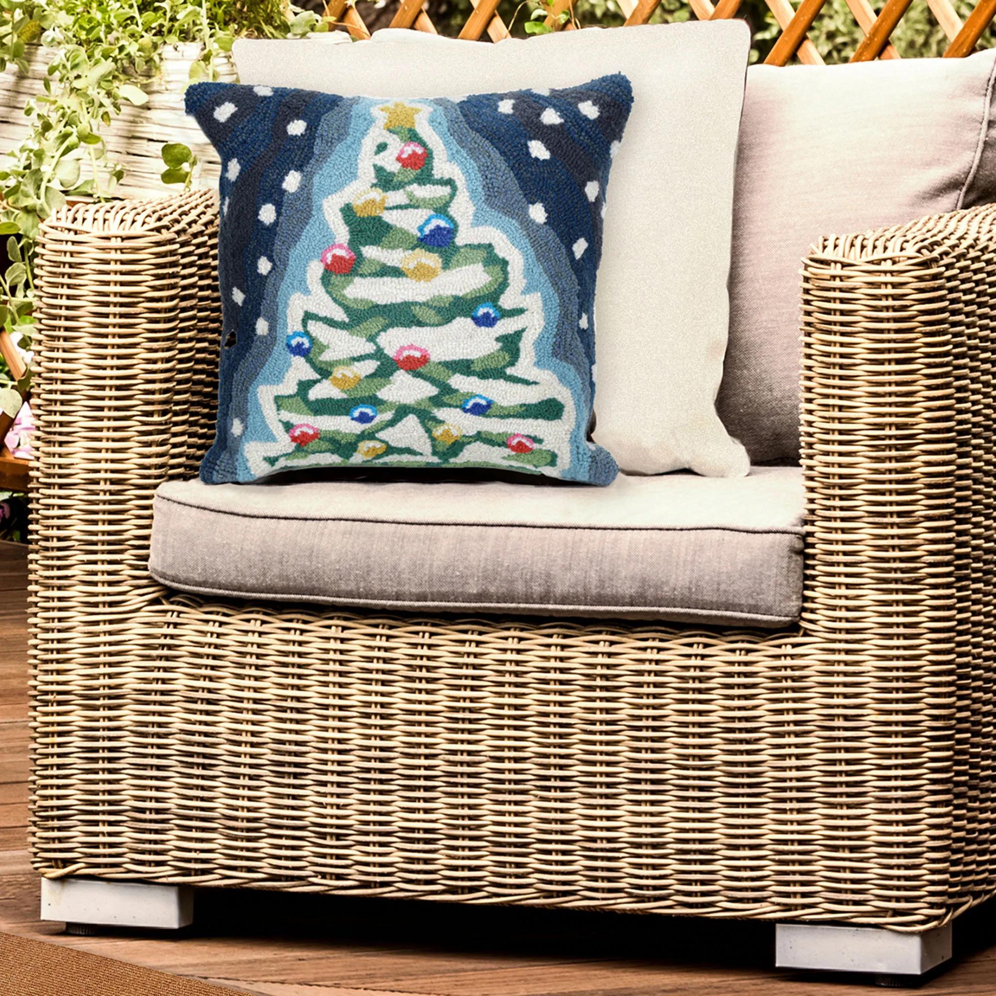Nothing signifies the Christmas season like a beautifully decorated Xmas Tree. From artist Liora Manne's Everywear(TM) Collection, the holiday decorative pillow features a weather- and fade-resistant, UV-stabilized, hand-tufted polyacrylic design of a Christmas tree that seems to glow with winter magic. Blue, red, and yellow ornaments, fallen snow, and a star adorn the tree, while snowflakes dot the midnight blue background. Tailored cover has a dark gray polyester back, hidden zipper closure, and polyester insert. Indoor or outdoor seasonal use. Square pillow is 18". Hand wash the cover; spot clean the insert. Imported.
