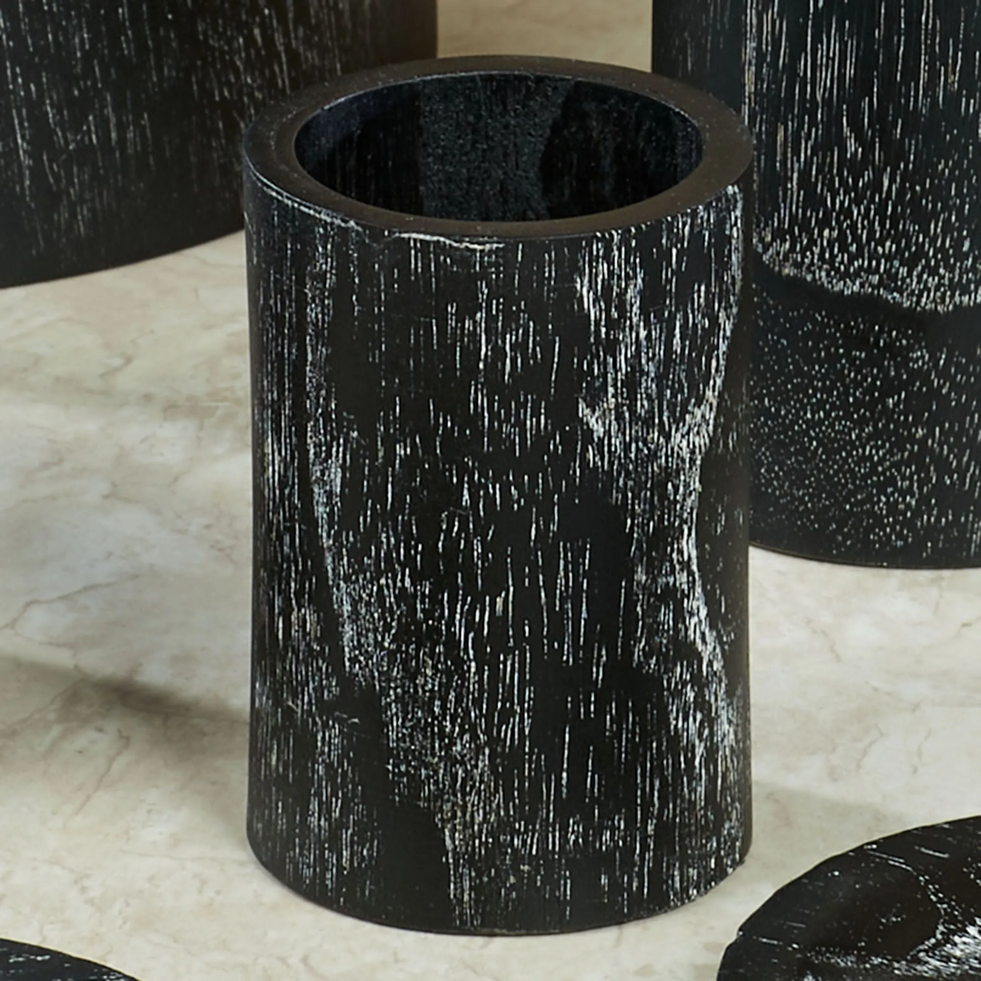 The Yosemite Bath Accessories have a naturally striking look. Made of black wood, these bath essentials have woodgrain patterns. Brush Holder can hold toothbrushes or makeup brushes. Specify Lotion/Soap Dispenser, Tray, Covered Jar, Brush Holder, Tumbler, or Soap Dish. Sorry, the rest of the accessories are no longer available.