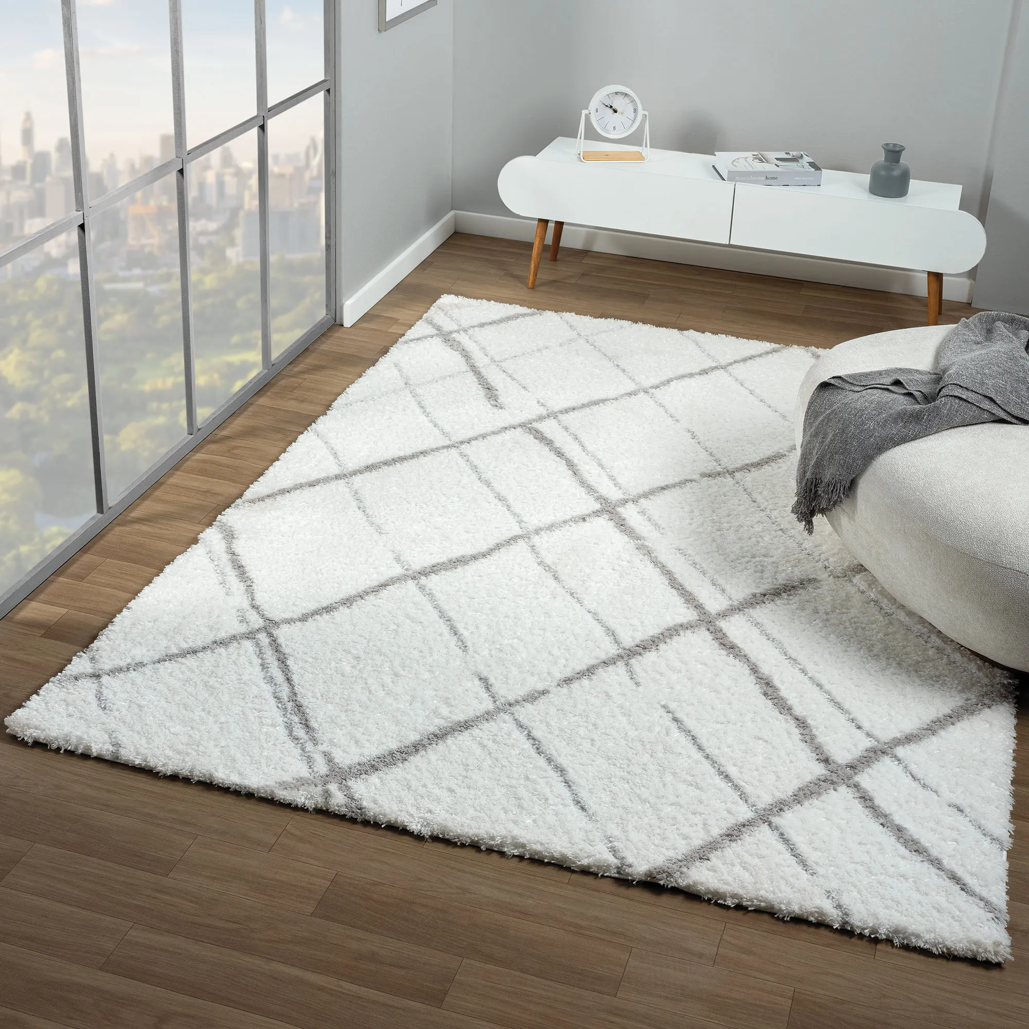 Soften the style of your space with the Zane Off-White Rug. Power-loomed from a polyester blend, the ultra-soft rug features a 1.18" thick, plush pile in a stain-resistant, shag-style design. Abstract lines create geometric motifs throughout for a chic, modern appearance. The off-white rug has gray crossing lines. Backing is jute. We recommend professional cleaning by a rug cleaner. Imported.