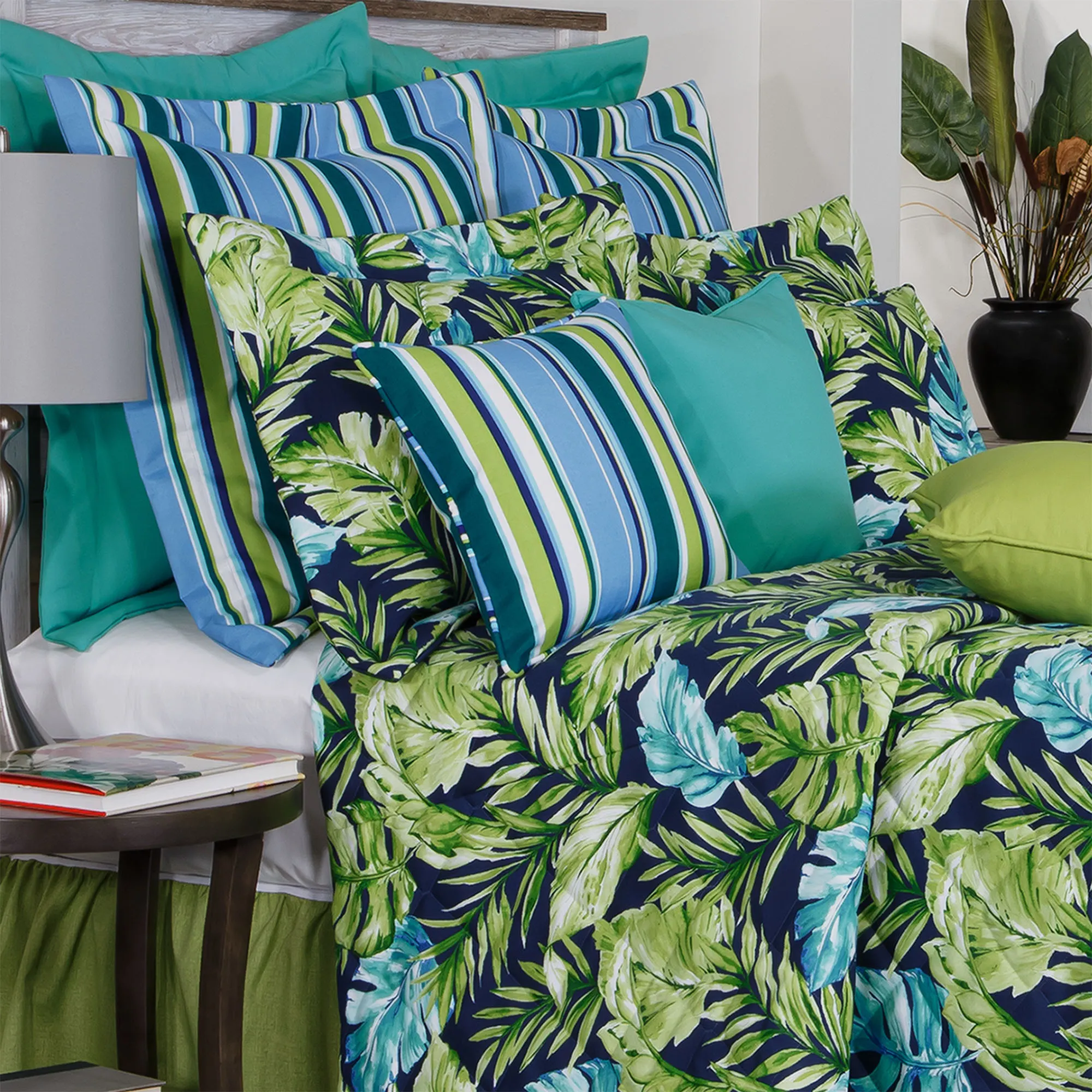 Vacation to tropical sights in your dreams with the Zealand Bedding. Proudly made in the USA, the woven cotton duck ensemble features printed bright green and blue tropical leaves, accented with white, on a midnight blue ground. Bold green, blue, white, midnight blue, and dark teal stripes add a charming complement alongside vibrant solid turquoise elements.