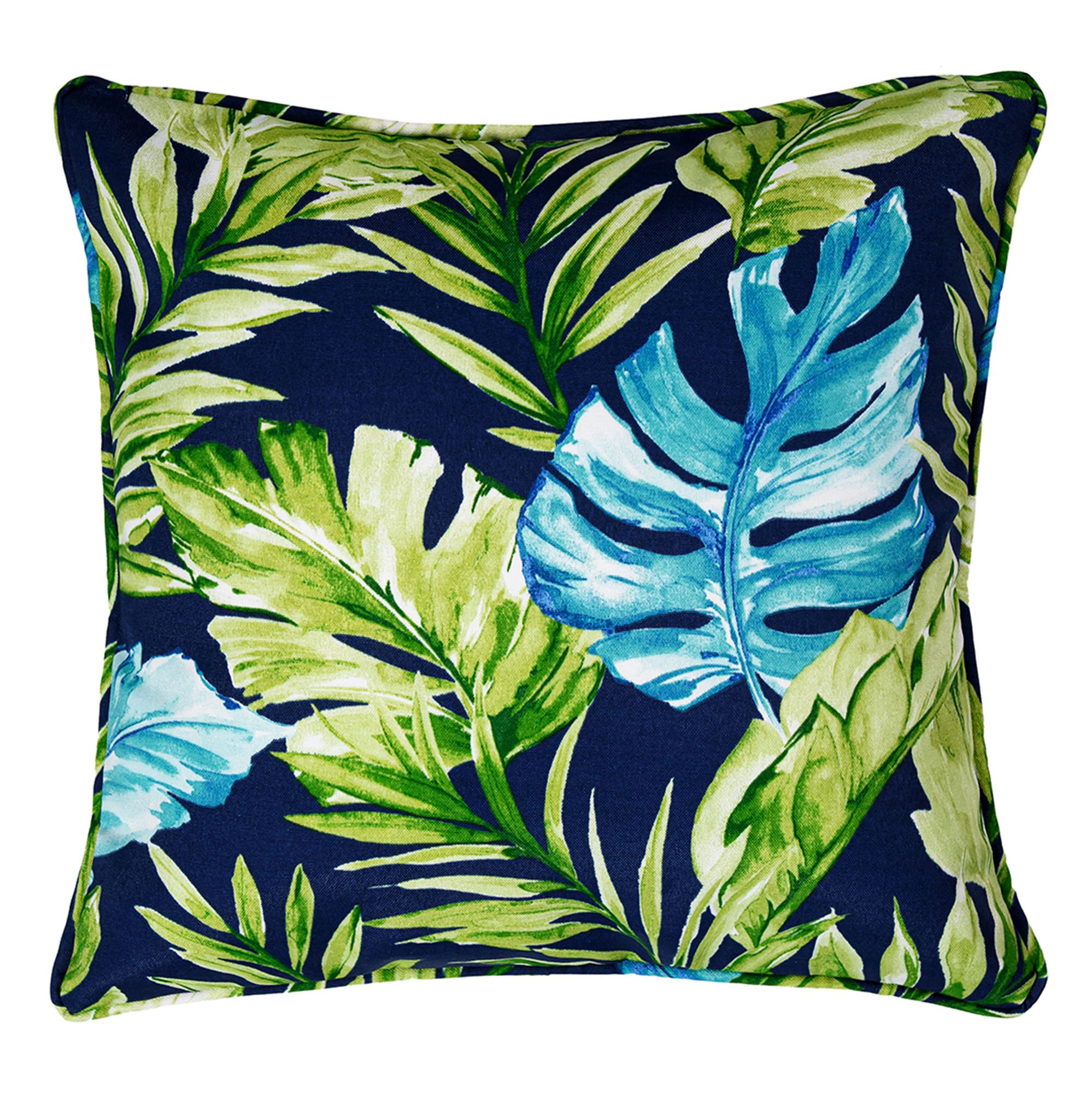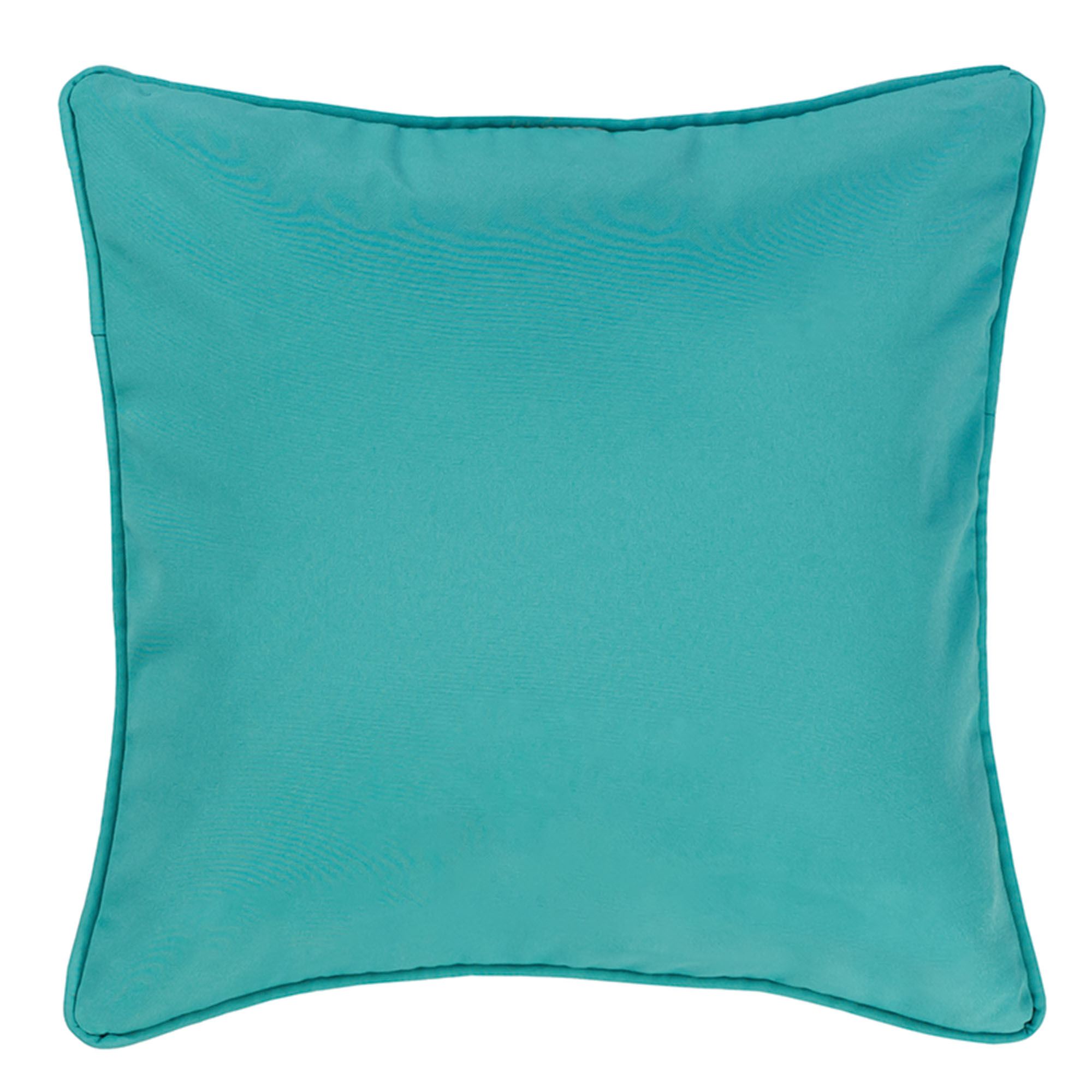 Pillows are reversible. The Square Pillow has piped edges; specify Leaf Design, Solid Turquoise, or Striped. The Starfish Pillow is turquoise.