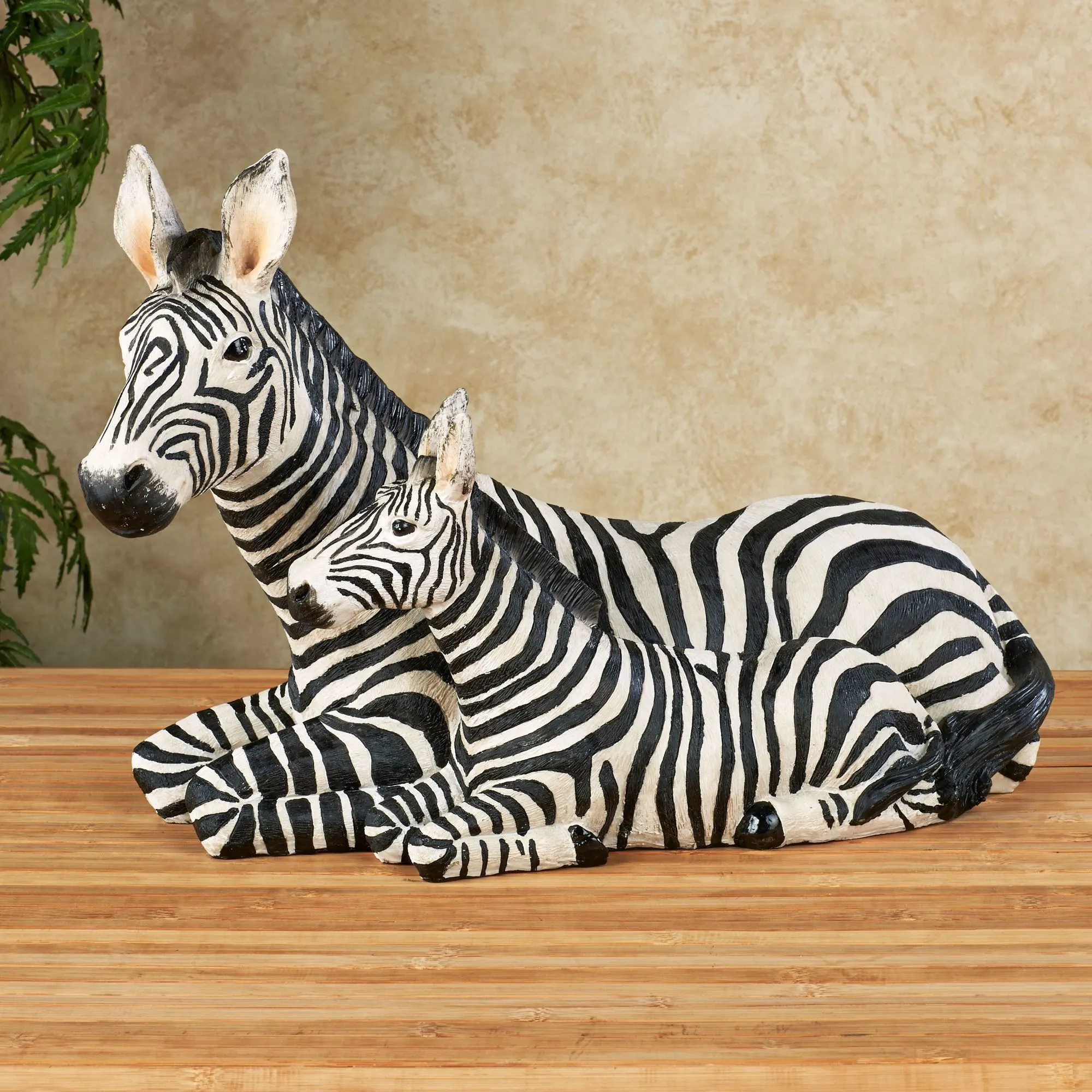 The Zebra and Foal snuggle and rest together. Made of resin, these animals have black and white stripes. Zebra table sculpture measures 16"Wx7"Dx11.5"H.
