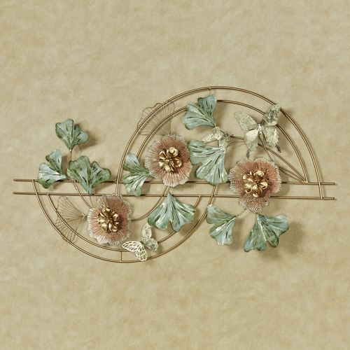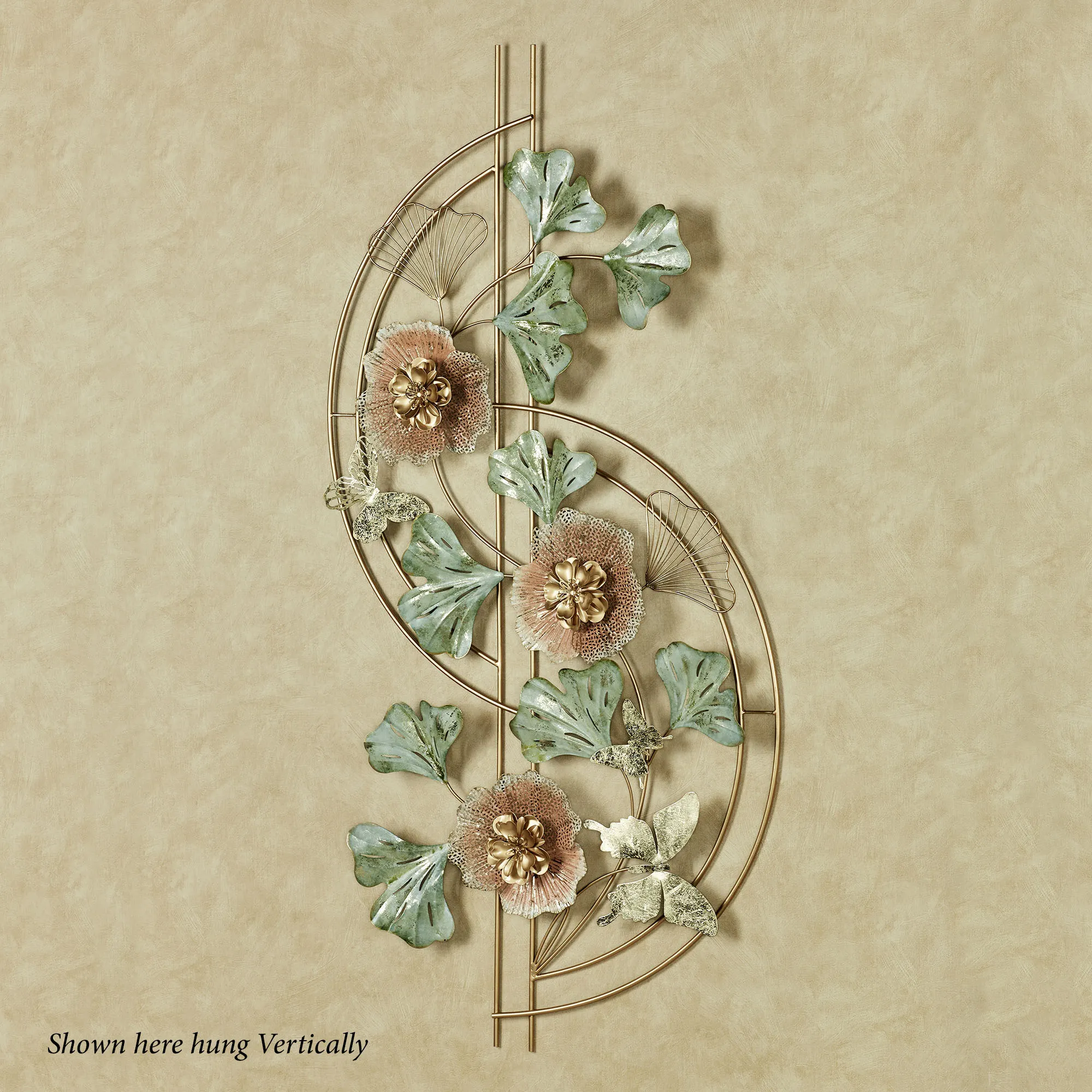 Zen Blossoms soothe the soul with beauty and grace. With an arcing gold framework, the metal wall sculpture features lovely coral blooming flowers with textured petals and golden centers. Openwork green and gold ginkgo leaves and gold butterflies also flourish from the design. The soft hand-finished hues are hand-dyed with an alcohol ink process. Artwork may hang horizontally or vertically. Overall, the floral wall art measures 53"Wx3.5"Dx26"H.
