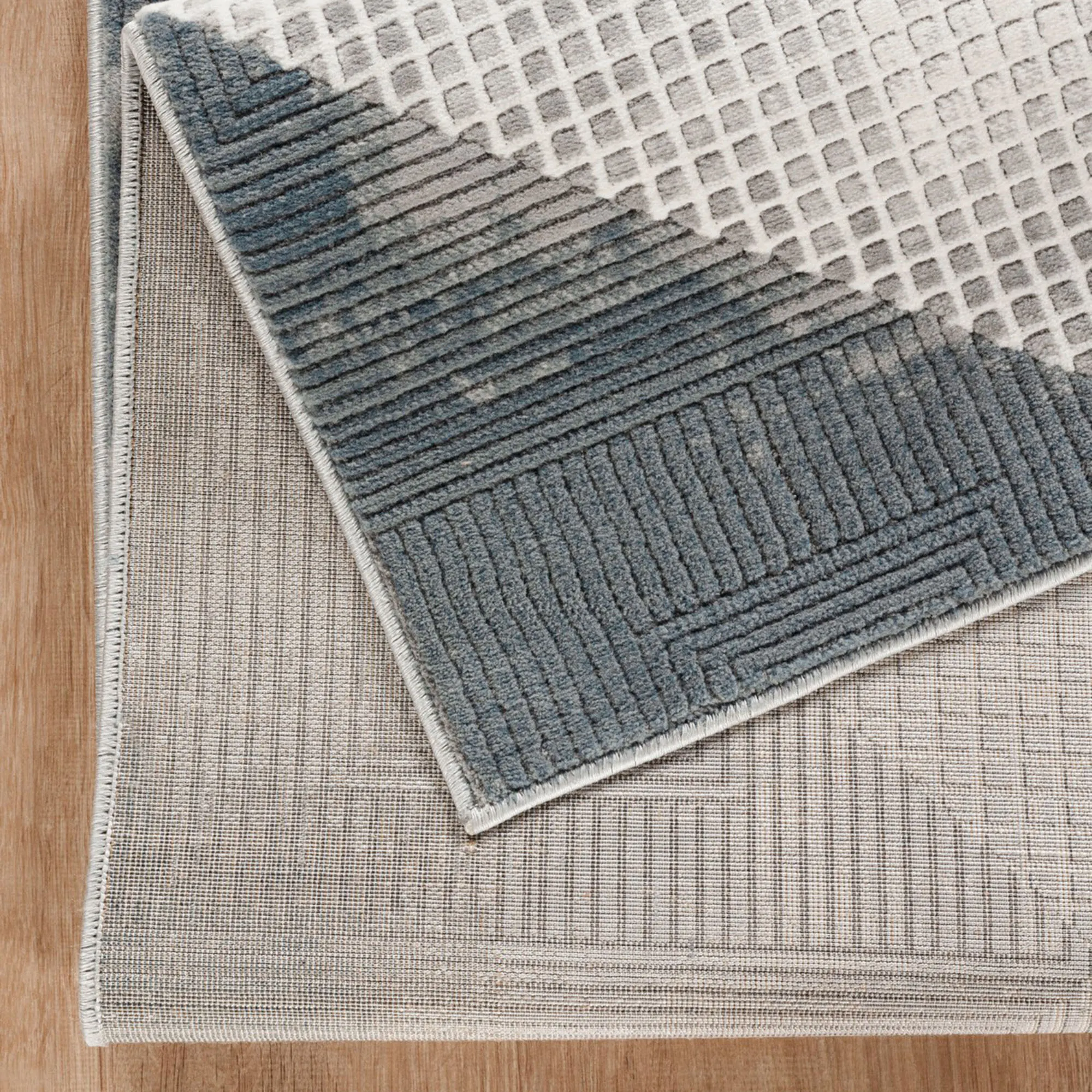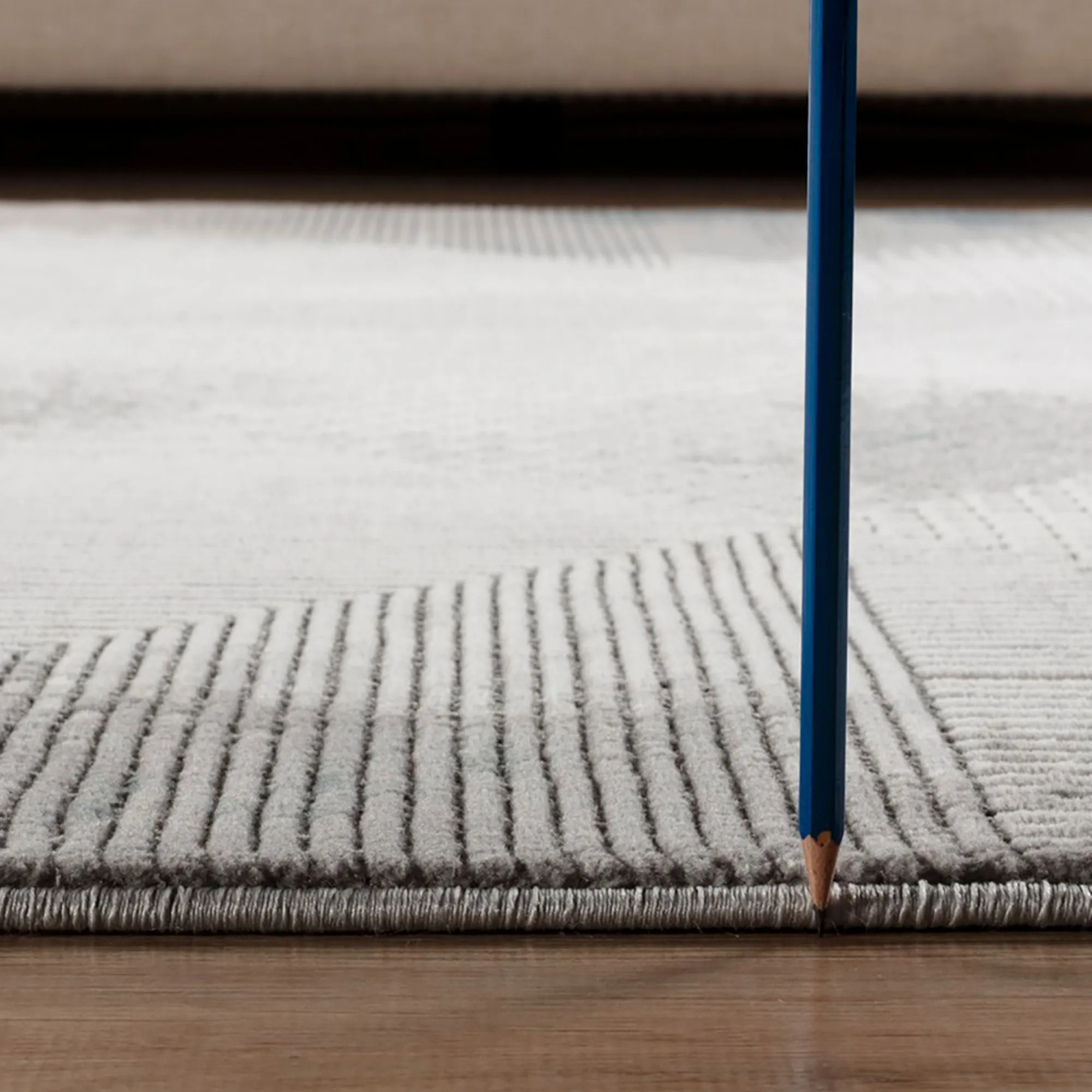 Add a dimensional appeal to your floor with the Zephyra Rug. Power-loomed from polyester, the .43" thick rug features an abstract geometric design full of linear elements, illusional patterns, and carved detailing to enhance the various textural elements. A mottled, neutral color palette of gray, charcoal, slate, ivory, off-white, and linen lends a contemporary, modern appeal. Backing is jute. We recommend professional cleaning by a rug cleaner. Imported.