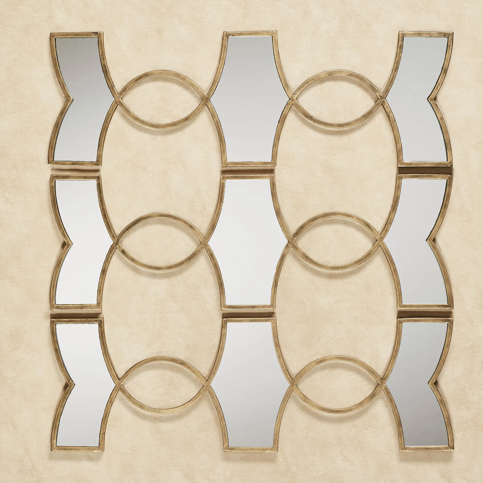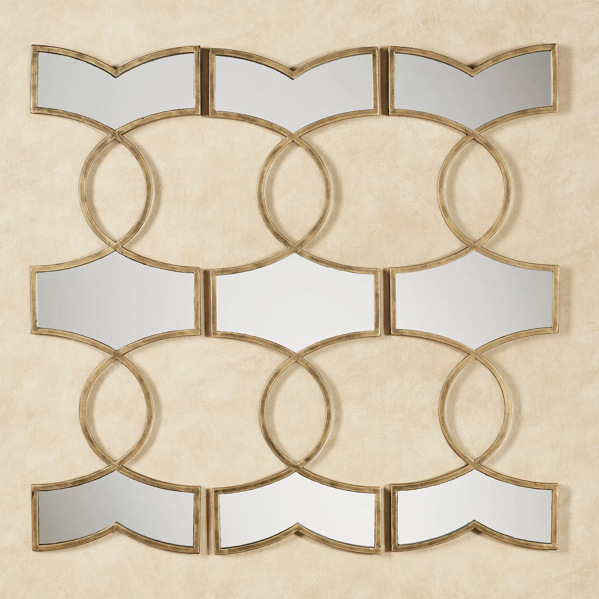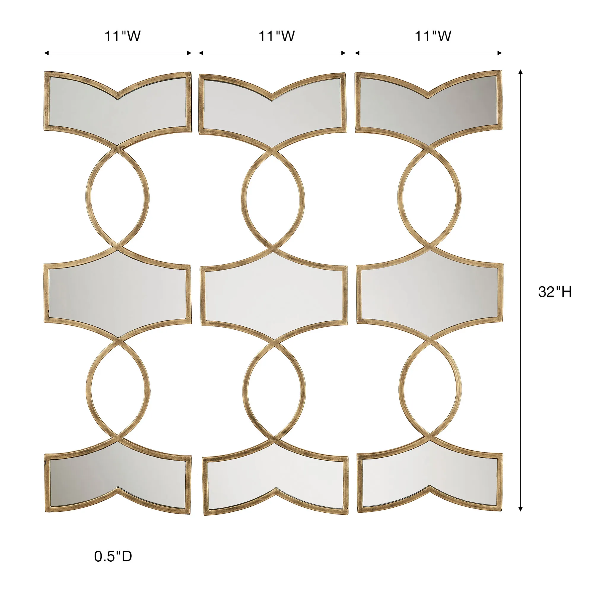 Open ovals and mirrored geometrics uniquely define the Zerynthia Mirrored Wall Art Set. Made of metal with a gold finish and mirrored glass, these wall accents may hang vertically or horizontally. Each piece is 11"Wx.5"Dx32"H. Set weighs 12 lbs.
