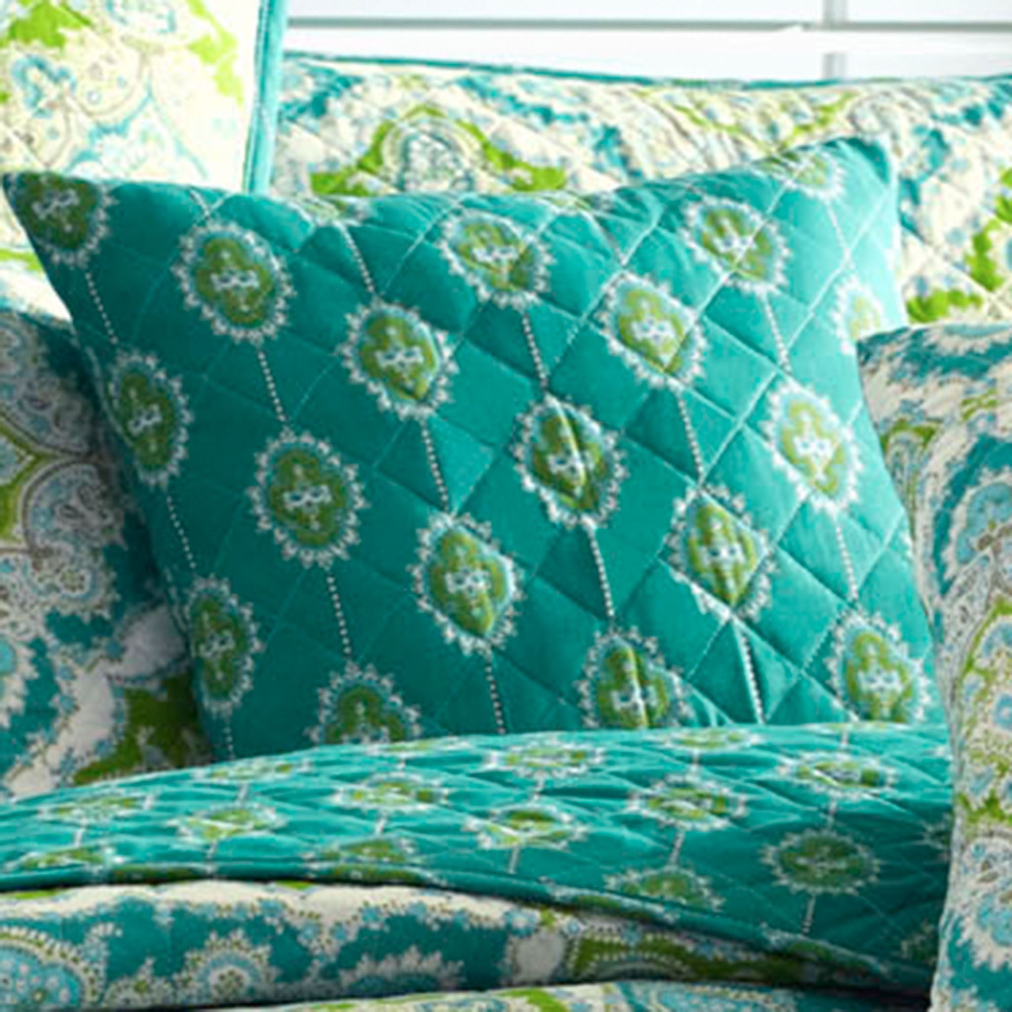 Bright shades of turquoise, lime, white, and light taupe burst across the Zoie Decorative Pillows by J. Queen New York. The tailored, cotton pillows have diamond quilting and reverse to the same design. The 16" Square features mini medallions. The 18" Square has all-over scrolling medallions. Fill is polyester. Spot clean. Imported.